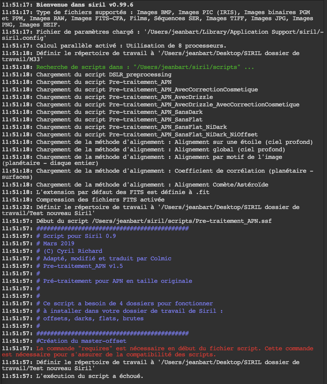 JeBa Posté 23 octobre 2020 Posté 23 octobre 2020 Bonjour à tous, J'essaye ce jour la version 0.99.4 et j'ai un bug qui bloque les scripts Je définis un dossier de travail dans lequel je mets les sous dossiers brutes, offsets, darks, flats Chaque sous dossier contient une dizaine de fichiers au format .cr3 Je demande, par exemple, le script Pretraitement_APN Sur la sortie console, le script va jusqu'à #Création du master-offset, puis sur la ligne suivante qui sort en rouge : La commande "requires" est nécessaire en début du fichier script... Je suis sous Mac OS Catalina V 10.15.7