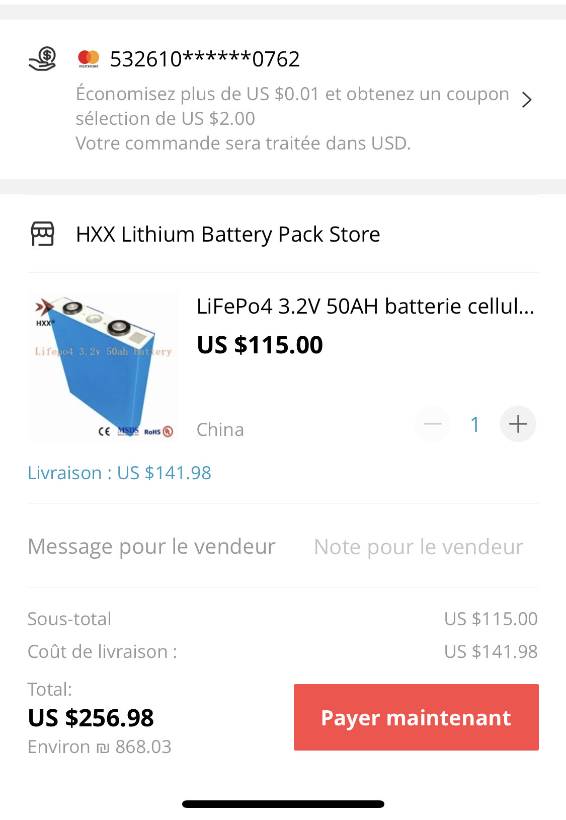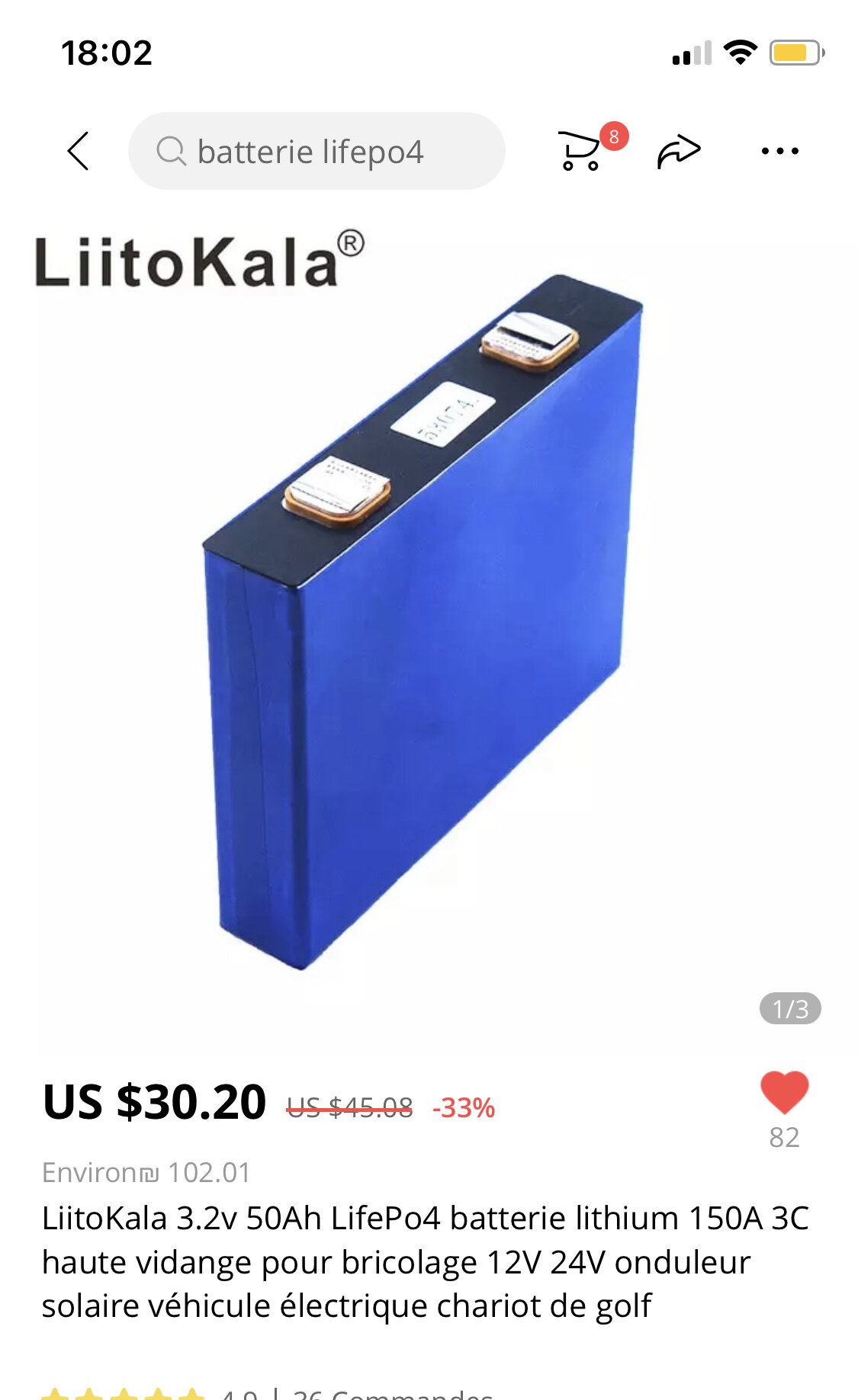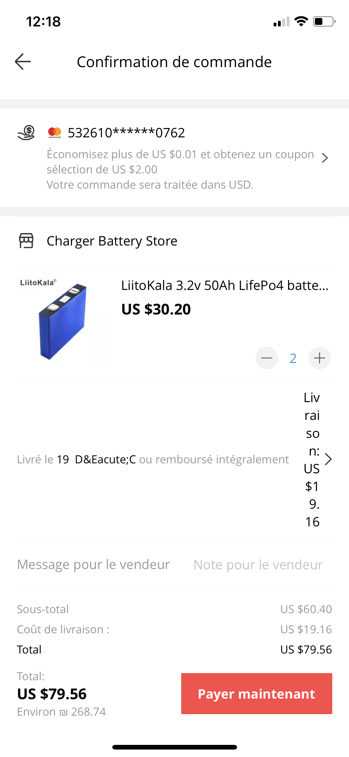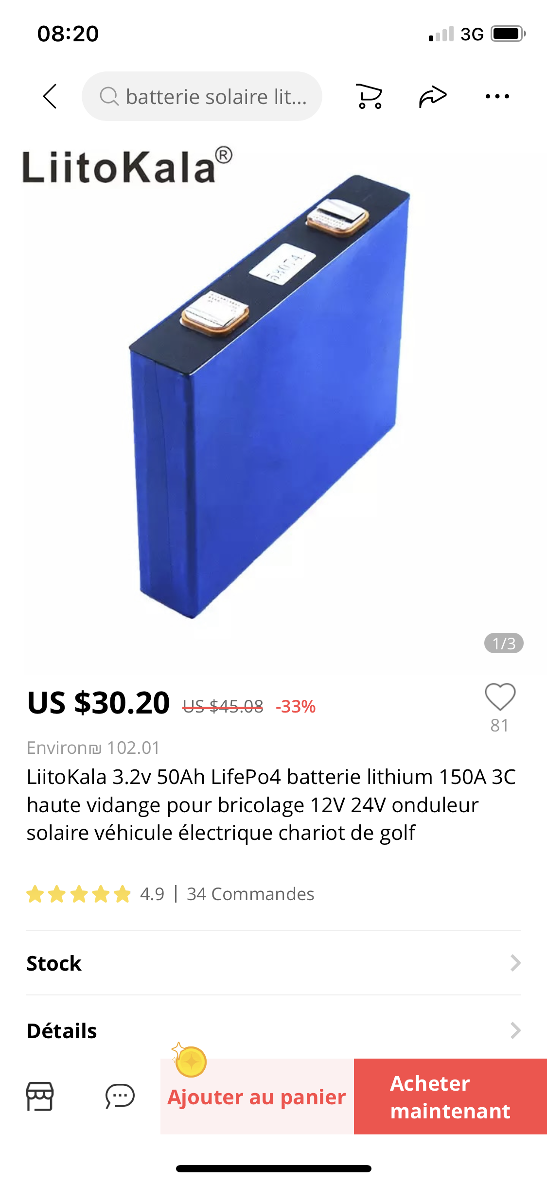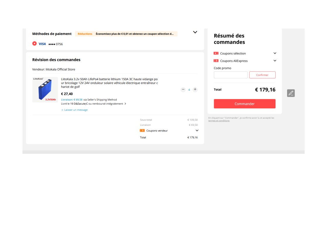 Sinon je trouve risqué de commander une batterie lifepo4 à 400€ sur Ali, si y a un problème le remboursement sera coton à obtenir.