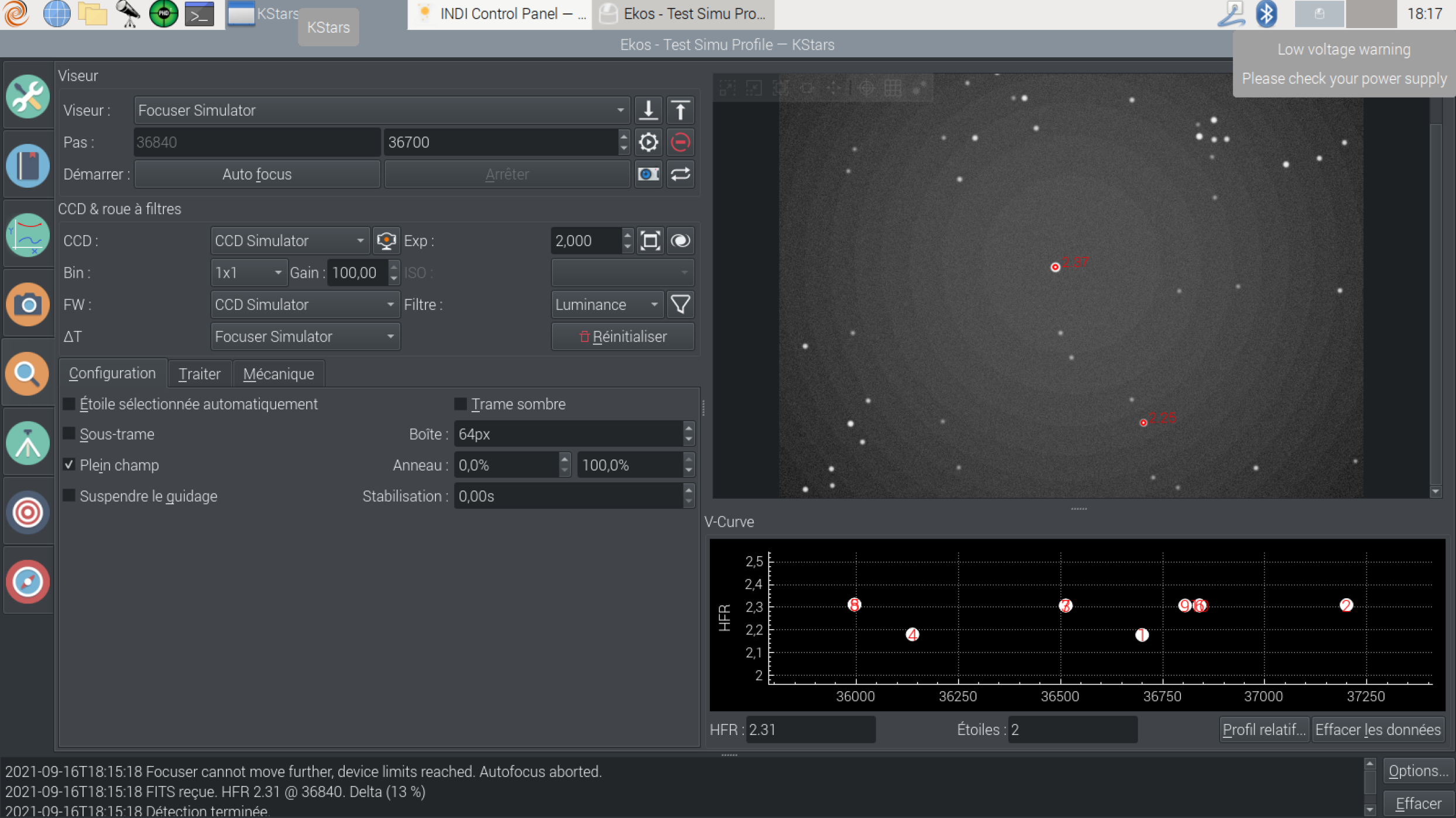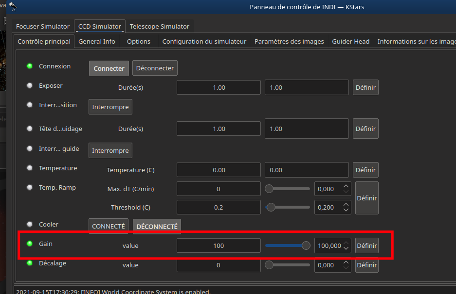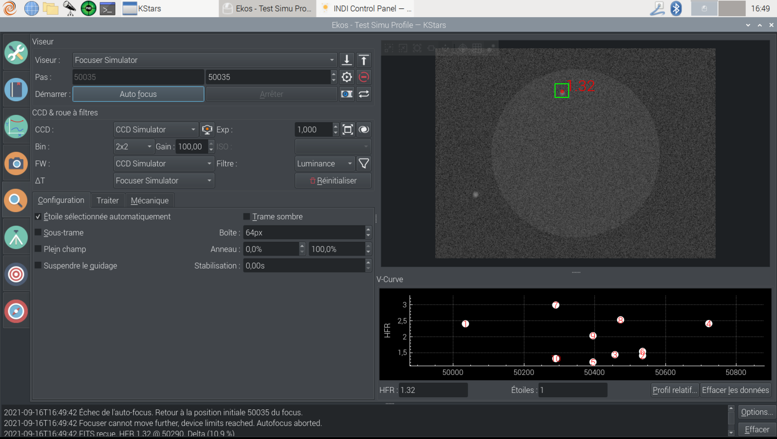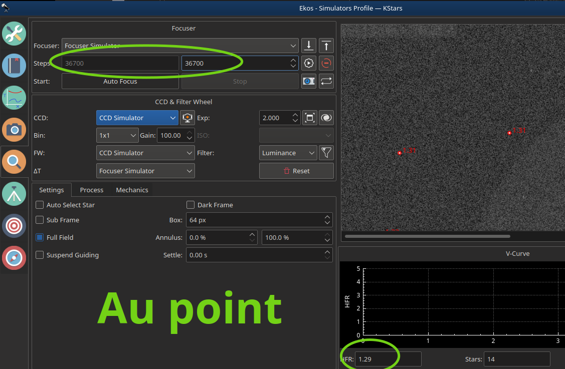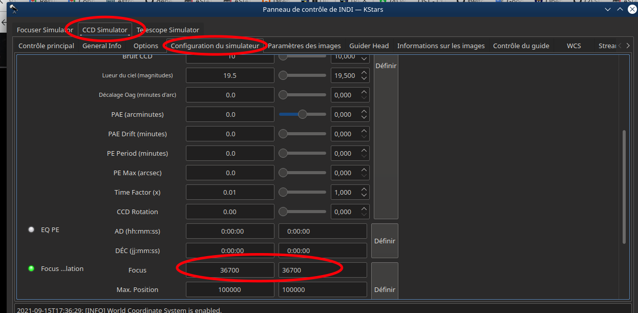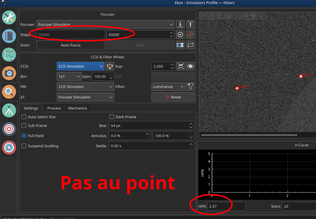 gehelem Posté 15 septembre 2021 Posté 15 septembre 2021 il y a 40 minutes, jpv84 a dit : bonjour tout nouveau sur le sujet j'essaye de faire tourner kstars avec stellarmate pour l'instant qu'avec des simulateurs et par contre impossible d'avoir un nombre suffisant d'étoiles pour pouvoir faire l'astrométrie idem sur capture d'un aperçu ( fond blanc sans étoiles) quelqu'un a t il déjà rencontré ce même soucis et comment l'a t il surmonté merci pour votre aide hello déjà mets le gain du simulateur de CCD au taquet (100) Et lance une routine d'autofocus (ou vérifie que le point de focus simulé par le CCD correspond à la position du focuser) Avec ça tu devrais arriver à avoir des étoiles simulées le "point de focus simulé" s'ajuste ici :