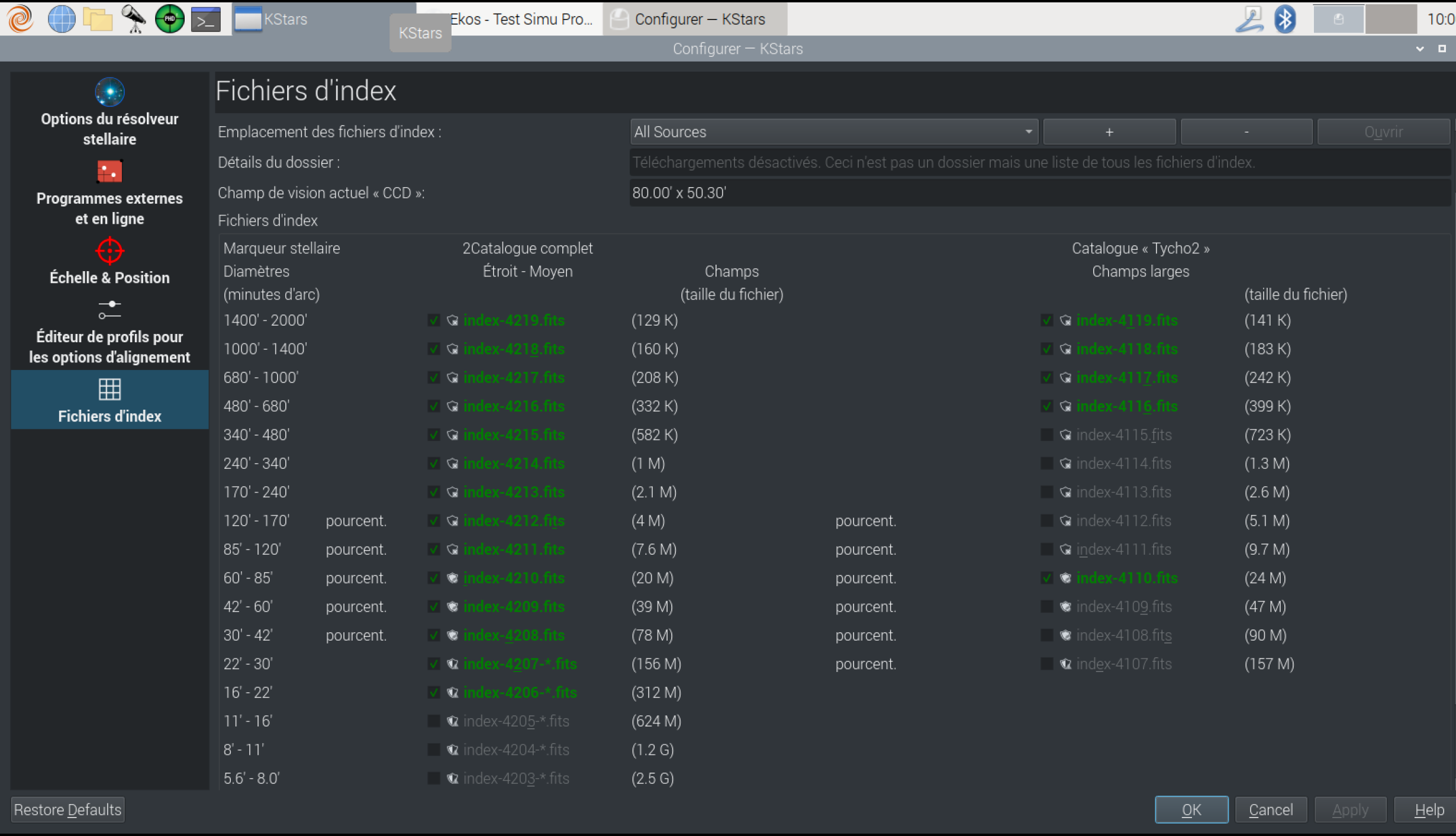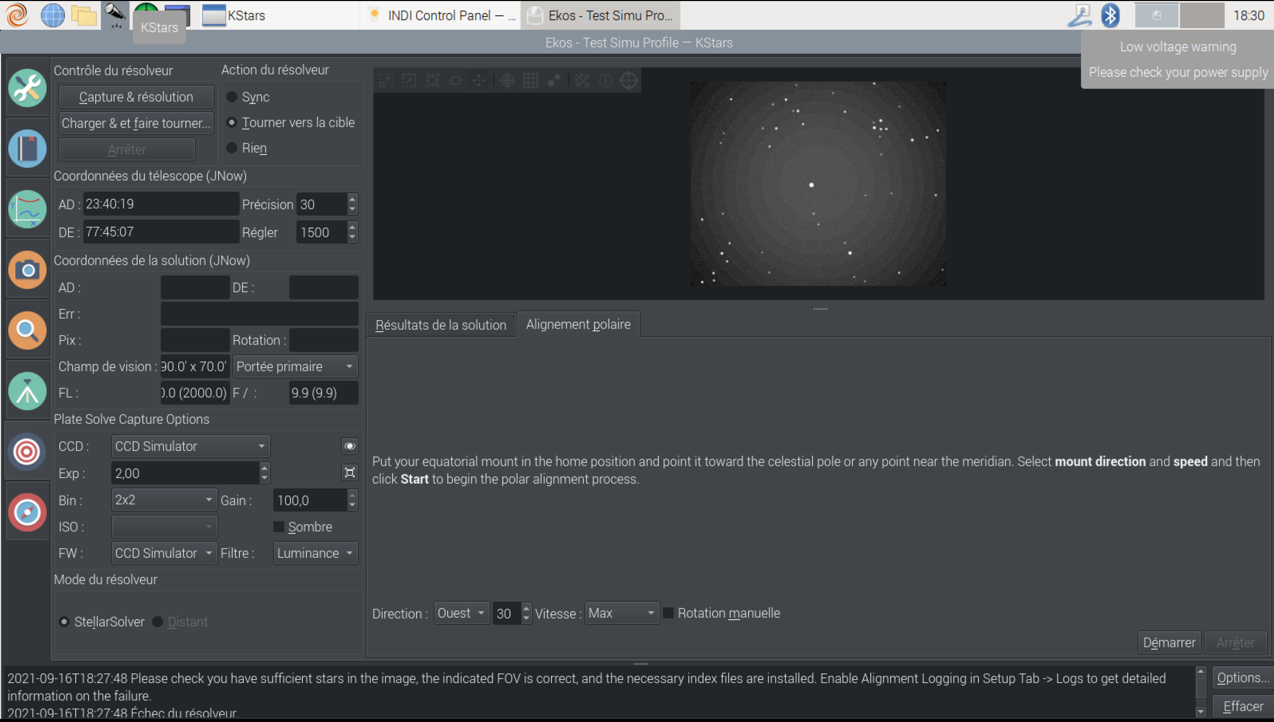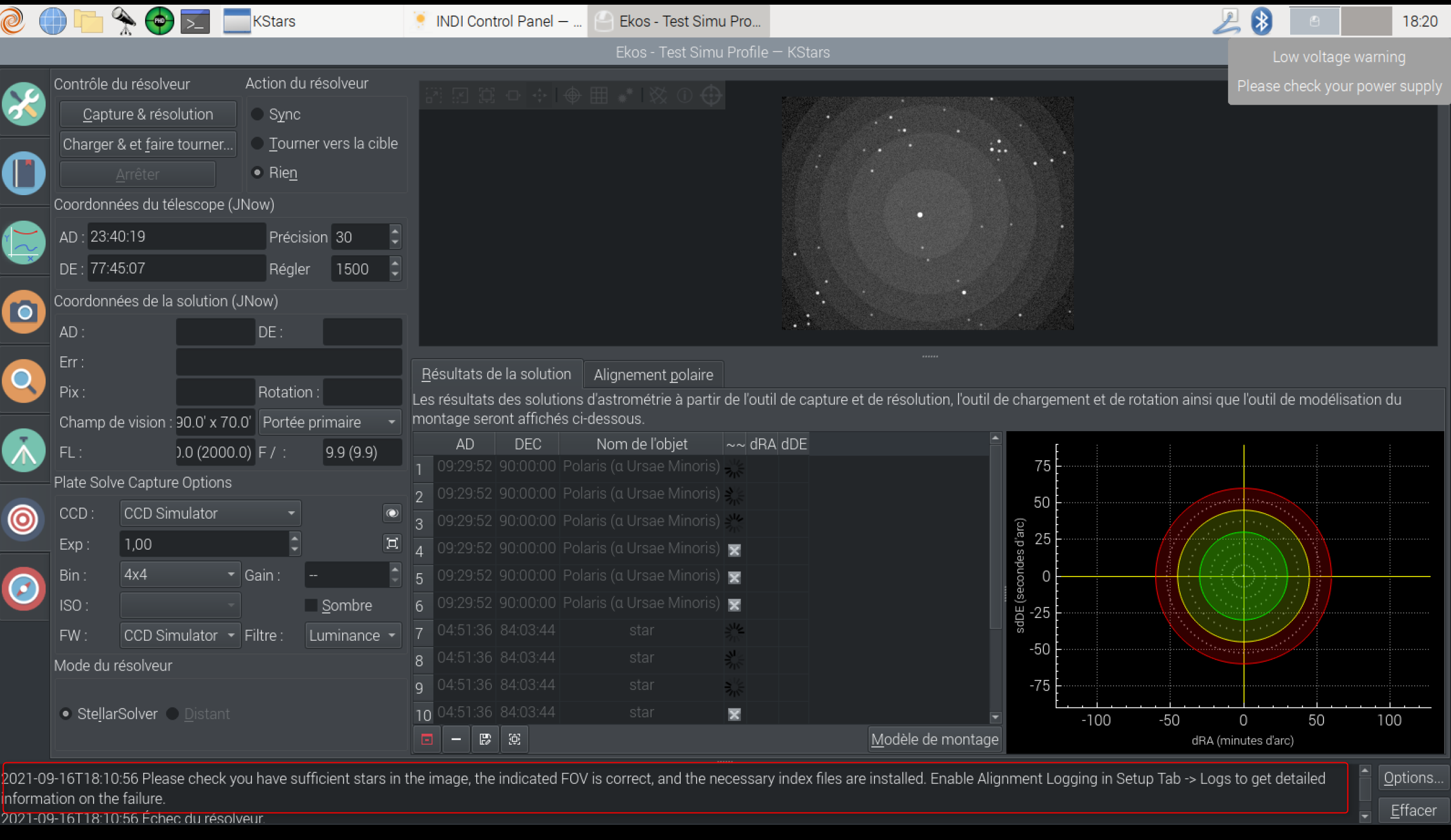 jpv84 Posté 17 septembre 2021 Posté 17 septembre 2021 rebonjour j'ai finalement réussi a faire un alignement polaire mais 1 seul, j'ai voulu en refaire afin de mieux maitriser mais en vain toujours le même message 🥵 "Please check you have sufficient stars in the image, the indicated FOV is correct, and the necessary index files are installed. Enable Alignment Logging in Setup Tab -> Logs to get detailed information on the failure." et pourtant comme le montre l'image il y a pas mal d'étoiles peut être un soucis d'index