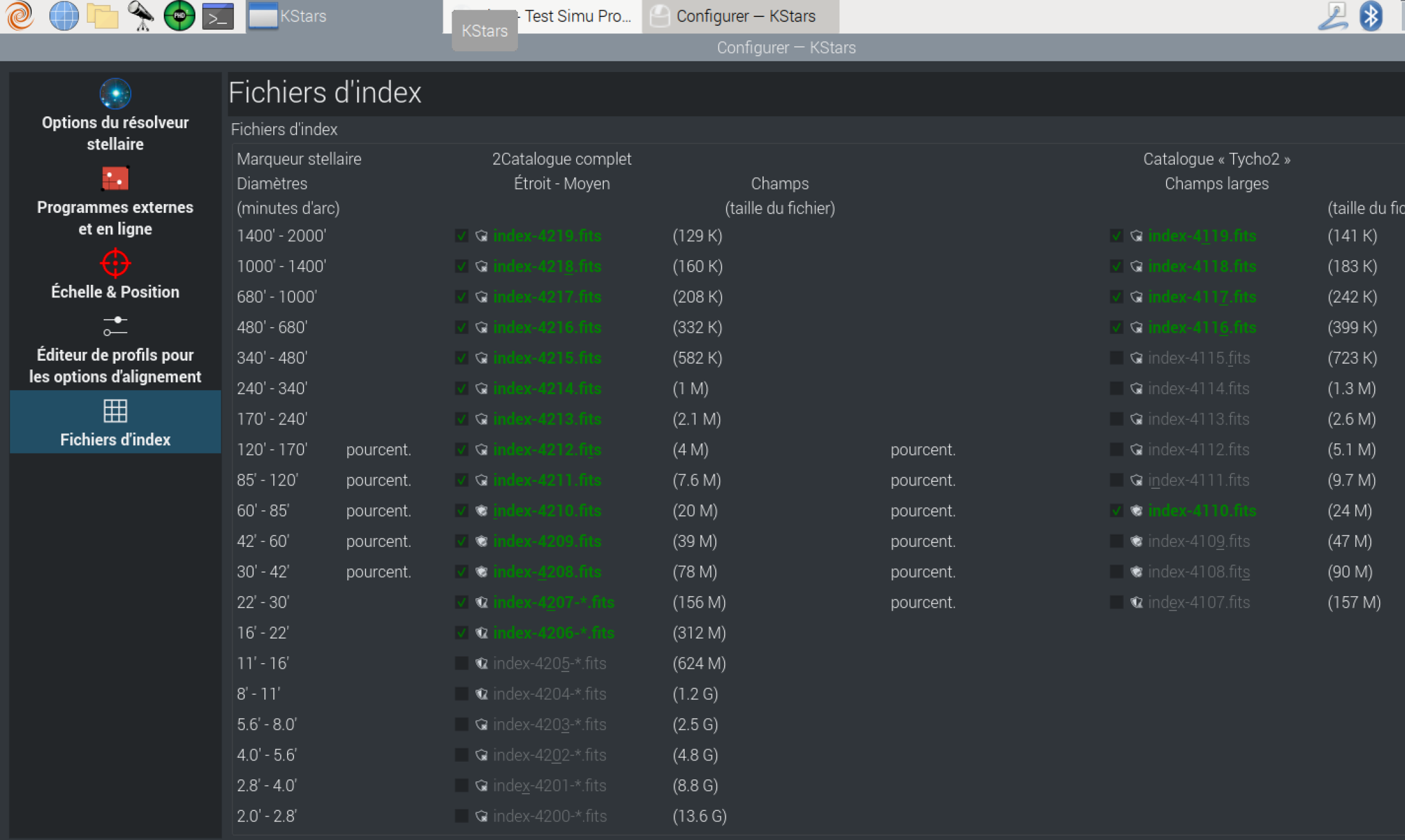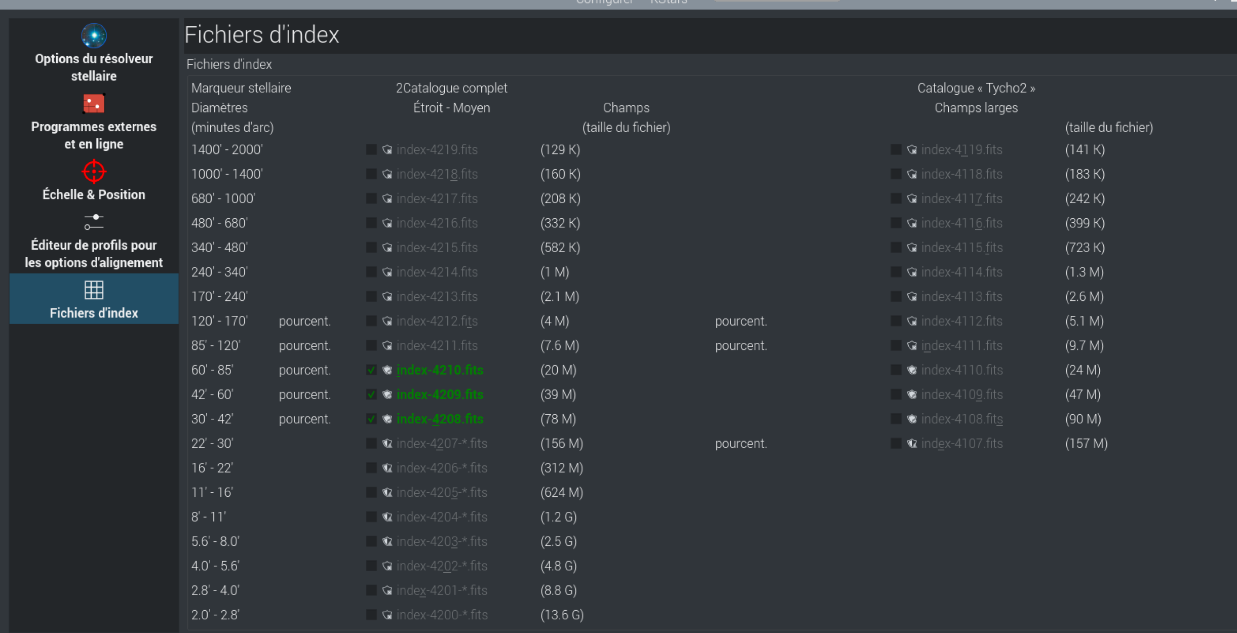 gehelem Posté 17 septembre 2021 Posté 17 septembre 2021 il y a 17 minutes, jpv84 a dit : toujours le même message 🥵 "Please check you have sufficient stars in the image, the indicated FOV is correct, and the necessary index files are installed. Enable Alignment Logging in Setup Tab -> Logs to get detailed information on the failure." as tu essayé de ne garder que les index strictement nécessaires ? (en particulier enlever les Tycho2)