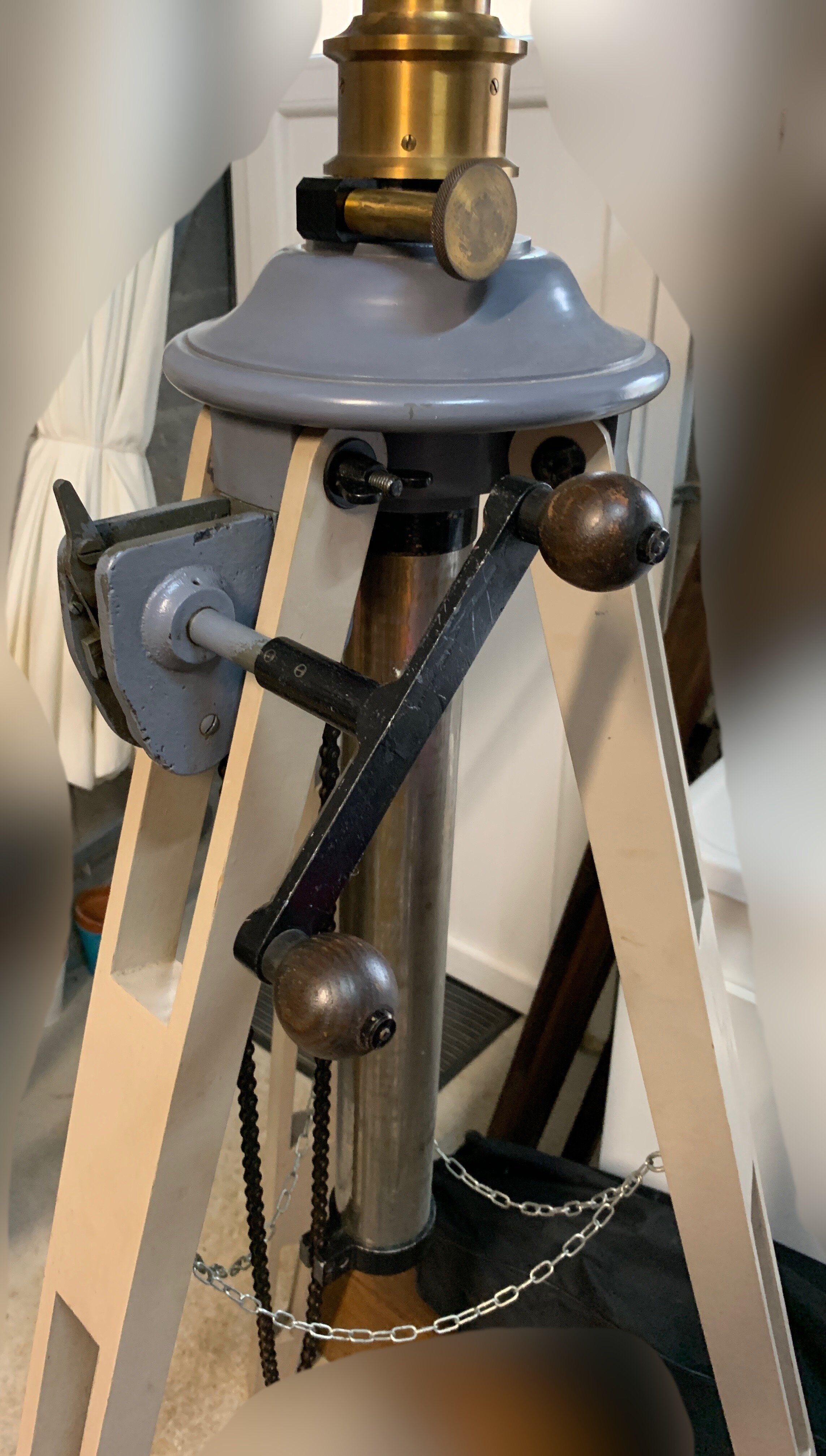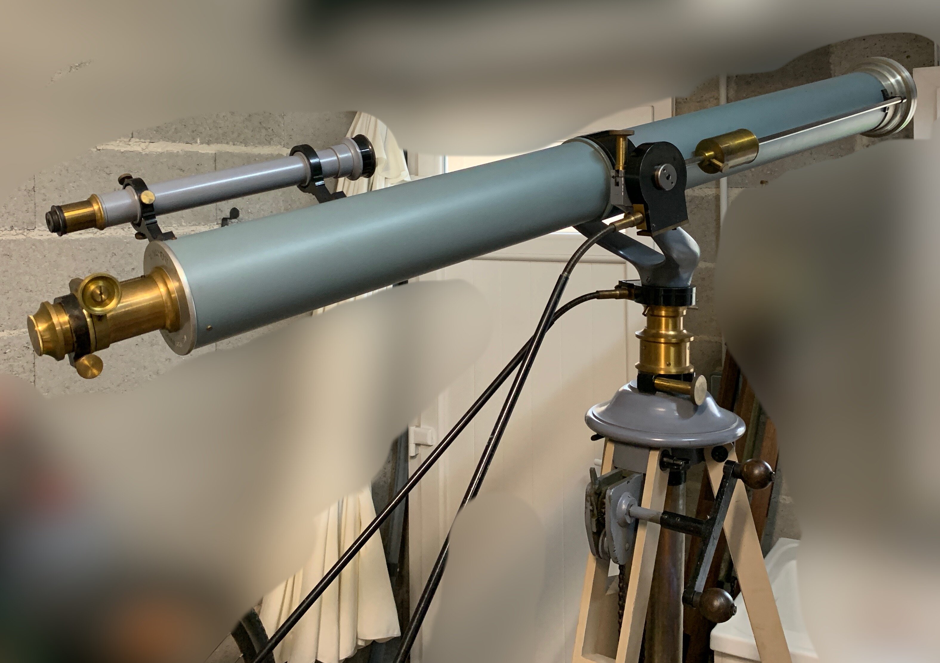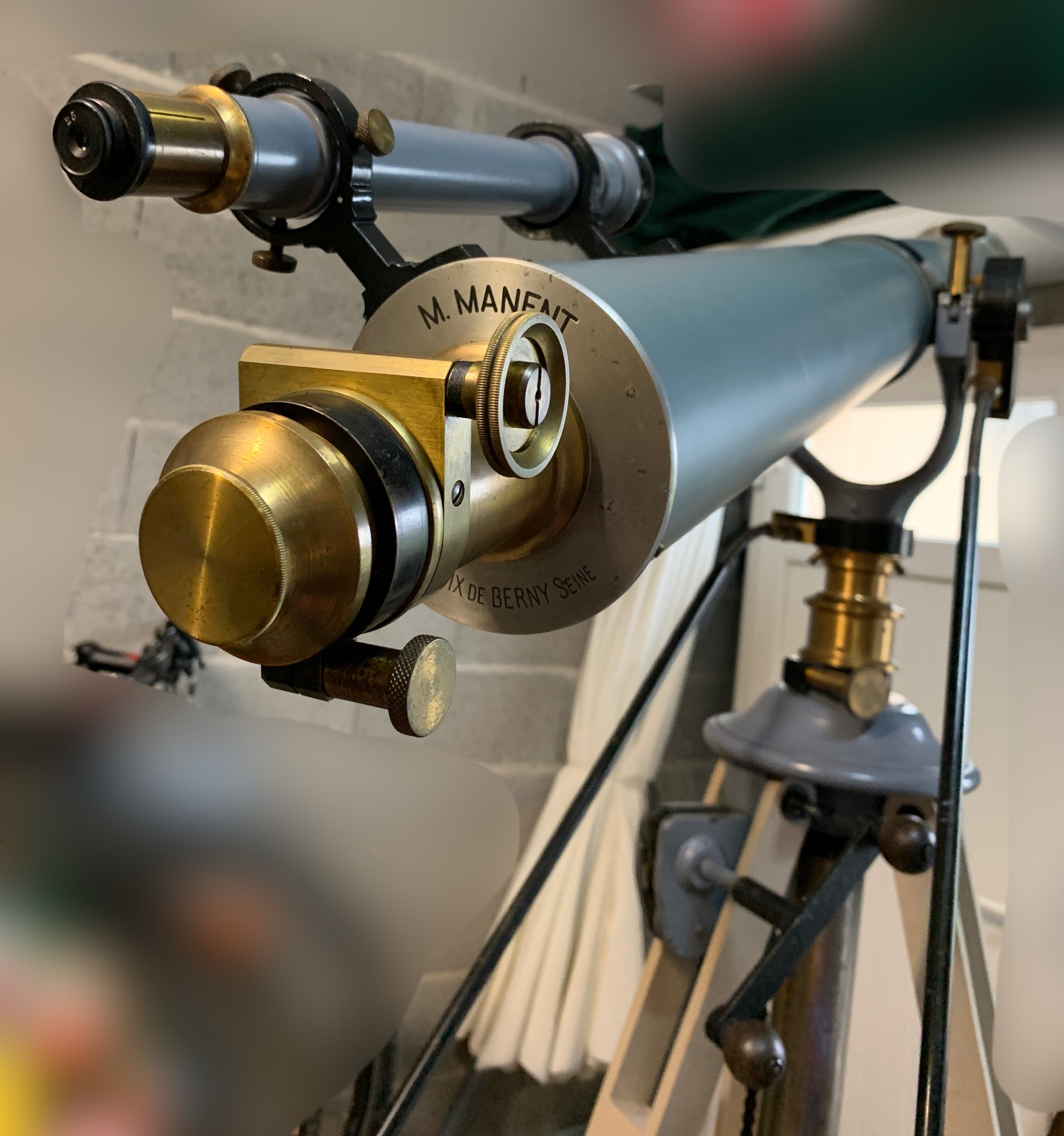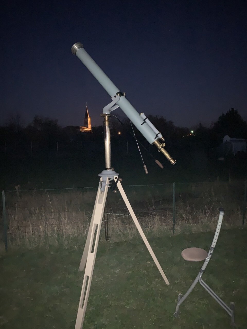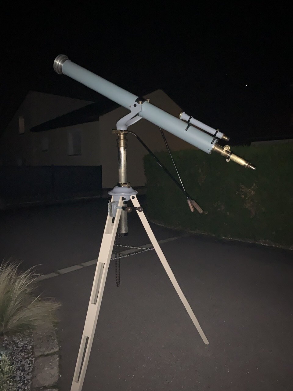 AstroSylv1 Posté 7 novembre 2020 Auteur Posté 7 novembre 2020 Manent 110mm / 1600mm Compte rendu et petit test d'utilisation de la Manent 110/1600 de 1954. Caractéristiques : Doublet achromatique, très probablement formule Littrow, sans traitements anti reflets, calée d’origine et re collimatée par moi. Ouverture 110 mm Focale 1600 mm Ratio focal : f/d 14.5 environ Poids : lourde, peut-être moins de 10kg. Diamètre tube : 110mm Longueur du tube : 1m50 environ Coulant d’origine 27mm (et 31.75 via bague usinée par SkyMeca, que j’utilise sur la Manent 95mm) Accessoires d’origine avec : chercheur, cinq oculaires orthos de 35mm, 20mm, 12mm, 7mm et 5mm, qui ont des grossissements de 45x, 80x, 133x, 230x et 320x. Prix : elle était à un prix « correct », mais se trouvait en Bretagne, et il a fallu la rapatrier en Lorraine, avec monture alt/az et chercheur, mécanismes à chaîne et flexibles pour mouvements fins, calage d’origine complet, et avec sa facture d’origine datée de octobre 1954 et signée de Manent lui même, sachant que son atelier a fermé en décembre 1954 ! Et le nom sur la facture est le papa du monsieur qui me l’a vendue. Je l’ai à peine nettoyée à l’eau tiède et micro fibre pour la mécanique tellement elle était propre et en excellent état. Introduction : Après avoir passé quelques petites heures à essayer cette Manent en nocturne et diurne, j'ai décidé de poster ce premier test, que je ré-éditerai au fur et à mesure pour le compléter, pour partager un peu sur cette expérience de cette vieille lunette made in France... comme j’avais fait pour sa petite sœur de 95mm. J’ai du m’armer de patience parce que bon sang qu’il a fait moche ! Ce qui frappe toujours en premier sur une Manent, c’est l’élégance de ces vieilles lunettes, et comme sur la 95mm, son état de conservation et sa mécanique : quelle belle réalisation ! Les vis, le système de contrepoids, sa mise au point à crémaillère, ses bouchons en laiton (peints), ses systèmes de pincement pour le coulant, ses mécanismes de mouvements fins, sa colonne à élévation par chaîne, etc, quelle mécanique !! On se rend compte une fois de plus de ce que la mécanique de précision voulait dire à l’époque, mêlée à de l’esthétique ! Incroyable ! La plaque gravée est un chouïa moins esthétique que la « tout laiton » de la 95mm à mes yeux, de même que la peinture mate et non laquée sur le tube, et la peinture sur le trépied en chaîne, ah, pis le barillet et bouchons qui ne sont plus en laiton non plus, mais en alu (du coup elle est moins lourde que la 95mm).. mais sinon, quelle beauté !! J'ai pu essayer pas mal de lunettes au fil des ans, et c’est ma cinquième vieille (pardon, vintage) achromatique longue il me semble. Cette Manent est elle aussi exceptionnelle de par son histoire et son état de préservation, elle est vraiment sublime à regarder et maintenant aussi sublime à regarder « dedans ». Je n’ai pas trouvé mieux que de copier coller ce que j’avais déjà écrit pour la 95mm. 110mm, c’est déjà imposant, cette lunette est lourde, tube en laiton peint, un peu d’alu, et basta ! Trépied en bois, mais la base et la fourche, ainsi que la colonne d’élévation sont métalliques. Ces lunettes étaient recommandées par Flammarion pour commencer à faire vraiment de l’astro sérieusement. Bien sûr du lunaire et planétaire, des étoiles doubles, et les Messiers brillants. Le chercheur est petit et la monture alt/az ne sont pas idéales pour les cibles trop hautes et peu lumineuses... Récupérée à plus de 900km de chez moi donc, vendue en occasion par le fils du propriétaire d’origine, c’est donc une deuxième main, 66 ans après, tout juste... le fils se souvient avoir regardé le ciel avec son père, beaucoup, jadis, mais là, il veut vendre et espère qu’elle continuera à voir les étoiles. En pratique : Je trouve que pour les soirées confinées ou de couvre feu, ou quand la Lune est trop présente, la lunette est top pour avoir plus de temp d’observation qu'au Dob, (c’est vite en température). Typiquement, on observe la Lune et les étoiles doubles les plus brillantes, quelques amas ouverts somptueux, du planétaire, et quelques carbonnées. Bref, beau diamètre, longue focale, imposante à manipuler, lourde, mais finalement vite domptée. Sauf que le premier soir, je suis resté sur ma faim : beaucoup de turbu et ça bavait : la collimation était bonne à refaire, le voyage et les années ont bougé le barillet... un après-midi, j’ai refait la collim avec l’étoile artificielle du club, et comparé la tâche d’Airy avec celle de la 95mm, et au bout du compte, c’est ce qui a été fait. 110 mm pour une lunette, c'est pas mal, c'est bien plus que les 63mm de la Telementor... j'en connais un paquet de forumers qui pensent le plus grand bien des 60, 70 et 80mm, alors avec 110mm, on joue en haut du tableau, je vais voir quelles doubles je peux séparer. Sur les cibles du soir, et j’ai utilisé la vue en direct et l’adaptateur en laiton fait par Didier de SkyMeca pour coller mes orthos derrière, puis avec un RC à prisme... Comme pour la 95mm, c'est beau. En tout cas avec les orthos modernes de 32 mm à 8mm. Pour les oculaires orthos d’origine, ça marche aussi super bien, mais le champ est petit, moins de 40 degrés, et on est un peu en dessous de ce qui se fait aujourd’hui en piqué et maîtrise de la diffusion... et comme sur la 95mm, je pense que le vrai potentiel de la 110mm s’exprime avec des oculaires et renvois modernes. Le tube est long, presque 1m60 avec le RC et tout et tout, et en Alt/Az, l'équilibrage est facile avec le contrepoids coulissant à l’avant du tube. Mais il faut adapter sa position pour chaque cible. Les flexibles de mouvements fins sont très pratiques, la colonne qui se lève par chaîne est très confortable, et la mise au point est sans jeu malgré les an