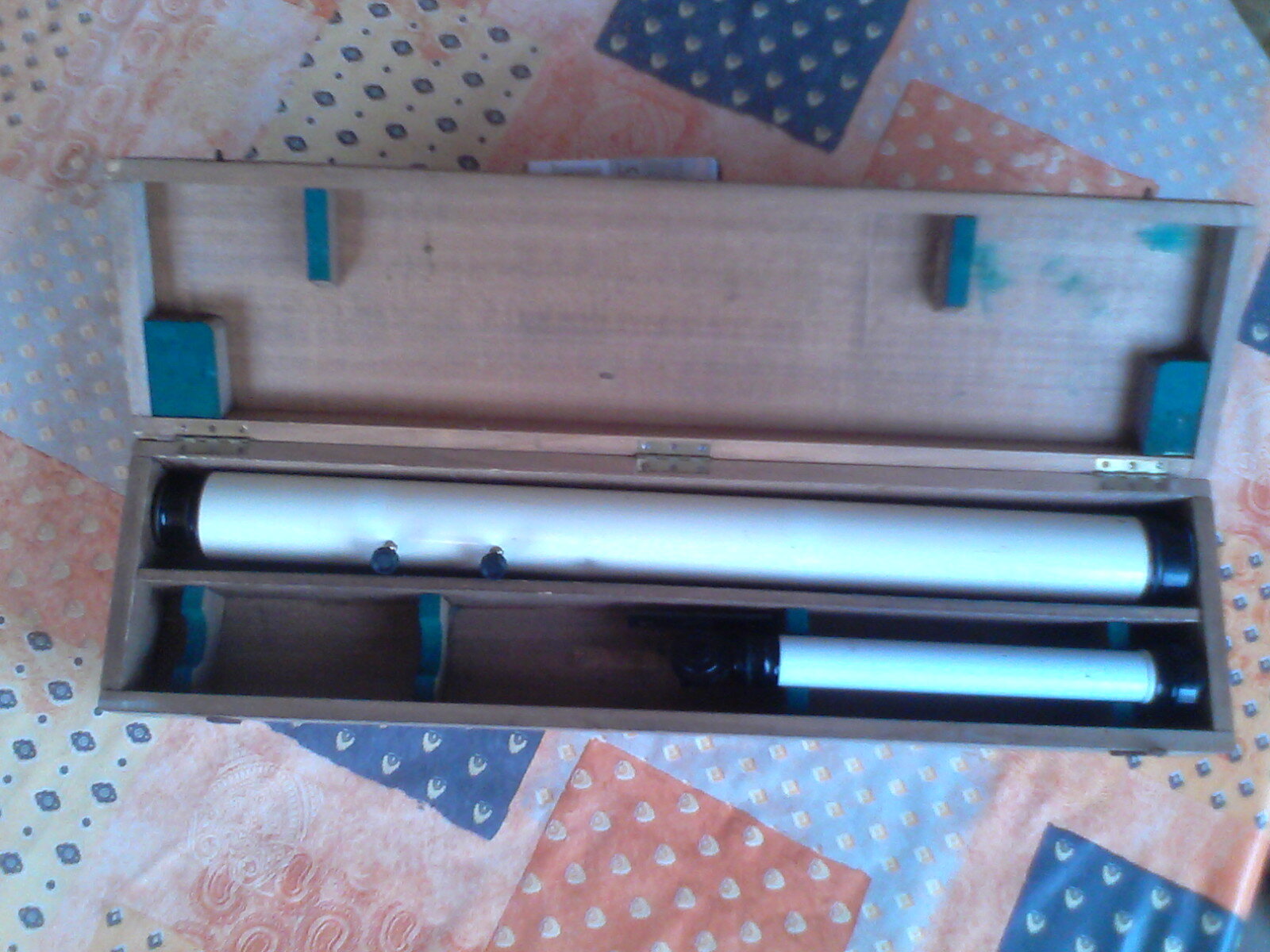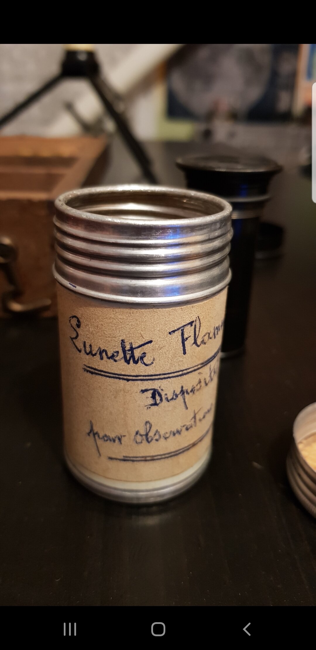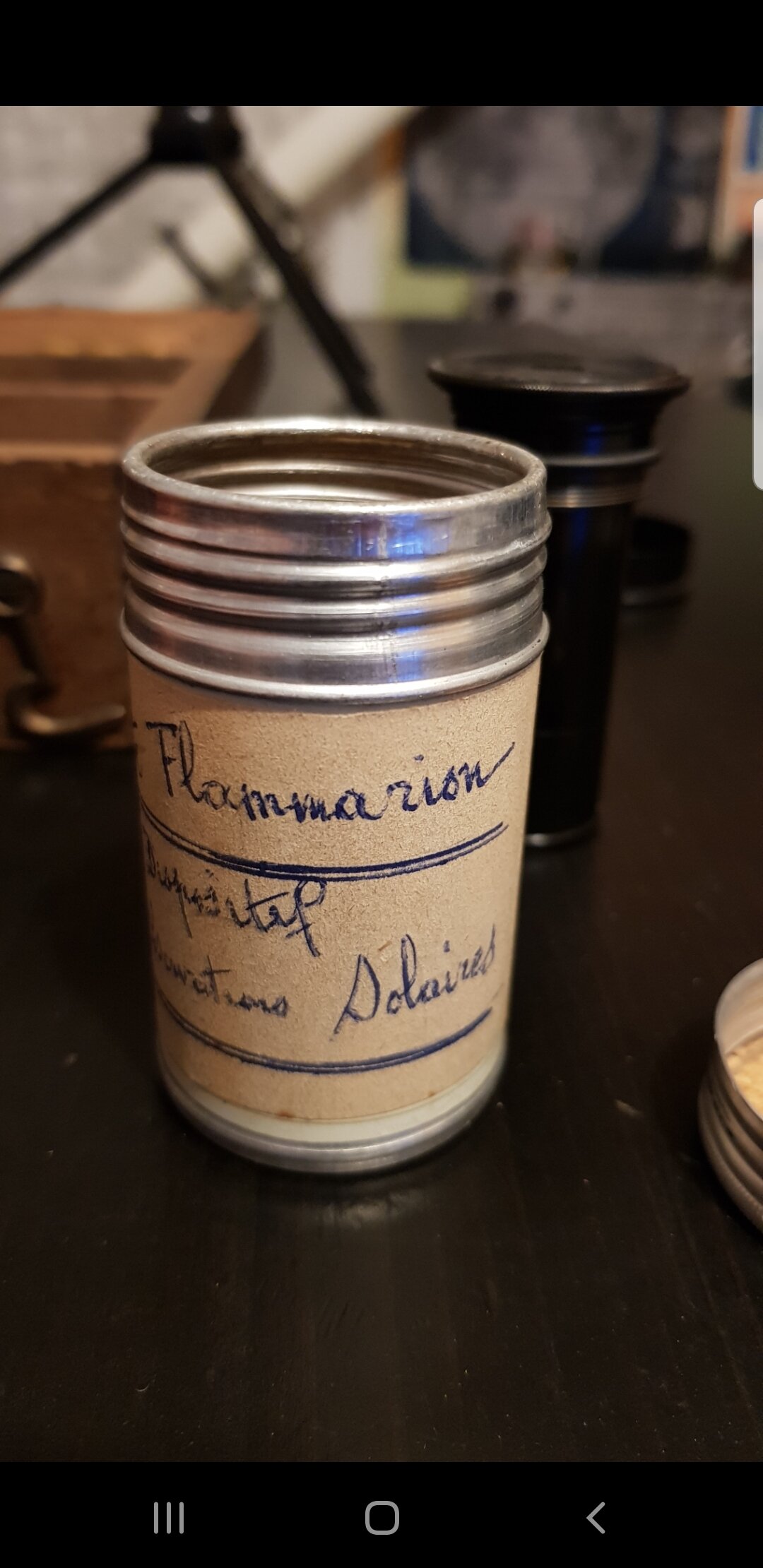 Jorris Posté 30 décembre 2020 Posté 30 décembre 2020 Bonjour Mes recherche sont en cours, mais pour l'instant, je n'ais rien trouvé de probant. Voici une petit lunette, qu'on peu qualifier de lunette astronomique je pense, car il y a un petit etuit dans la boite avec des inscriptions "lunette Flammarion, dispositifs pour observation solaire" Elle est accompagnée d'une petite mallette en bois ou toute partie trouve sa place. La lunette dois faire 40cm a peu près. Tout les pièces sont en métal, l'ensemble doit peser 3 kg. Lentille de 40mm Petit monture azimutale (parfaitement stable) qui rappelle un peu le pied de la Perl halley, avec les jambes qui se range à l'intérieur. Voici l'étui de l'oculaire solaire (dont je nais pas encore trouvé le fonctionnement) 1 1