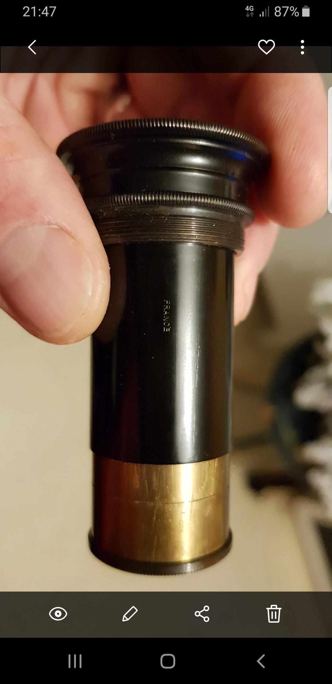 bosgi Posté 31 décembre 2020 Posté 31 décembre 2020 (modifié) Salut. Belle trouvaille. Tu as là une lunette Vion modèle dit "des écoles" qui était déclinée en deux versions la 43mm, la tienne, et une 53mm, sans être affirmatif pour cette dernière. J'ai possédé la plus grande des deux, mais je m'en suis séparé. Par contre j'ai sous la main un modèle de 43mm de 1933, tout en laiton, dont le coffre est très similaire au tien. Il faut savoir que ces lunettes anciennes étaient toutes accompagnées d'un oculaire terrestre, équipé d'un redresseur. Ce dispositif est contenu dans un tube plutôt long. Suivant le modèle et à la demande du client elles disposaient aussi d'oculaires astronomiques, beaucoup plus courts que le terrestre. les deux dispositifs étant inter changeables. On trouvait également un œilleton équipé d'un filtre solaire que l'on fixait à la place de l’œilleton protecteur, celui équipé avec un petit cache poussière. Donc pour en revenir à ta lunette, ce que tu nommes oculaire solaire et en fait. l'oculaire astronomique et l’œilleton solaire est simplement vissé dessus. Tu dois pouvoir le dévisser et le remplacer par celui qui est vissé sur l’oculaire terrestre. BIEN ENTENDU LE FILTRE SOLAIRE EST A PROSCRIRE; Une précision pour aider à dater ta lunette. Les instruments Vion étaient en laiton brut jusqu'à la fin de la guerre 39/45. donc ta lunette est postérieure. peut-être des années 50. Modifié 31 décembre 2020 par bosgi précision 3 1