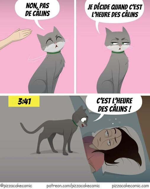 Par rapport à la dernière, c'est exactement ça chez moi, mon chat vient dans le lit le matin de bonne heure, me monte dessus et me croque le nez pour que je lui remplisse la gamelle.