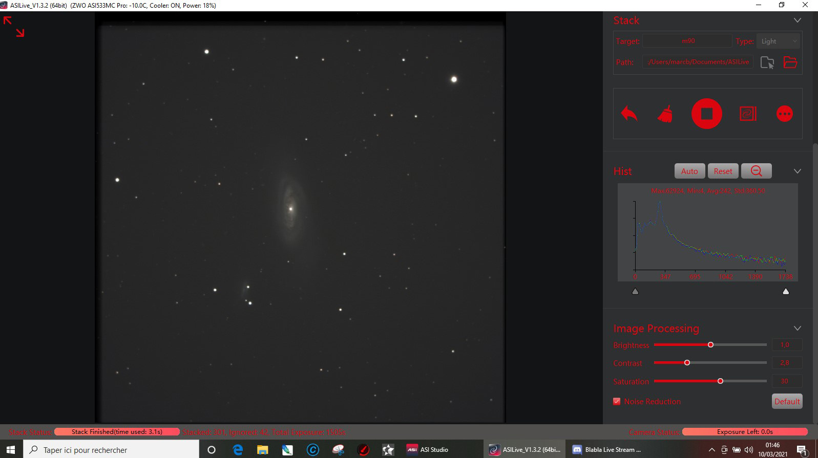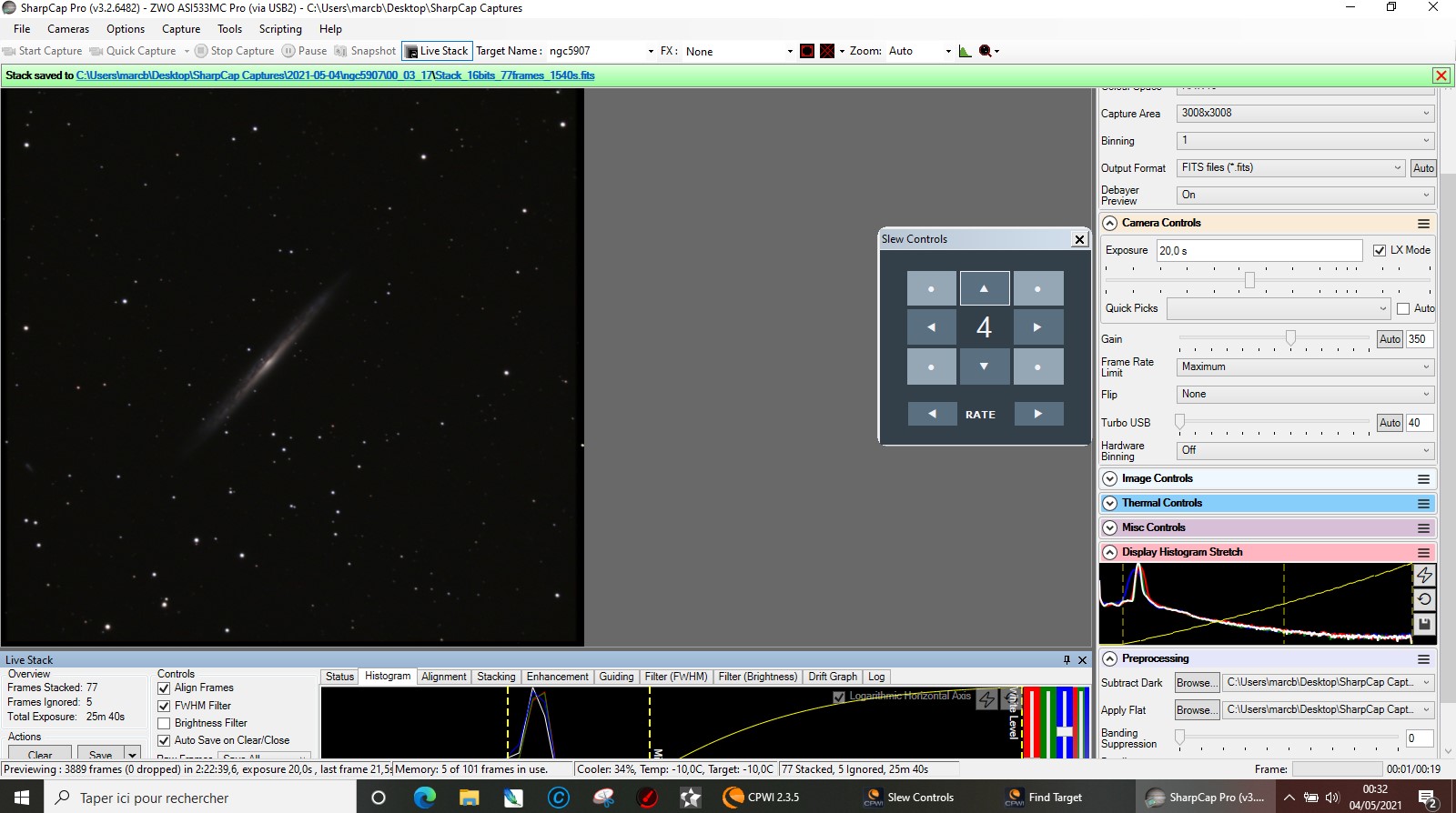 Asilive permet de conserver les fits unitaire, mais sauve l'image finale au format jpg, ce qui limite les possibilité de traitement photoshop . Totalement novice avec dss, je n'arrive pas a empiler les fits qui ont des temps d'expo court, j'arrive à empiller les fits de 30s d 'expositions sans trop de souci, mais le résultat en sortie de stack et moins bons que les stack live d'asilive. c'est peut être uniquement du à ma méconnaissance totale de ce programme. En parlant de programme me viens encore une question, sharpcap est il plus performant que le soft asi, en faveur de ce dernier une simplicité hallucinante pour sa mise en oeuvre, contre choix limité sur les temps d'expo qui sont imposé et uniquement trois niveau de gain possible. J'ai lancé sharpcap en live stack et j'ai été rebuté par le fait que le stack se lance immédiatement avant même que le moindre réglage de gain ou de temps d'expo ai pu être réalisé. Ce qui entraine la question suivante sharpcap est il vraiment plus performant, et donc mérite t'il que je consacre du temps à essayer de le maitriser.
