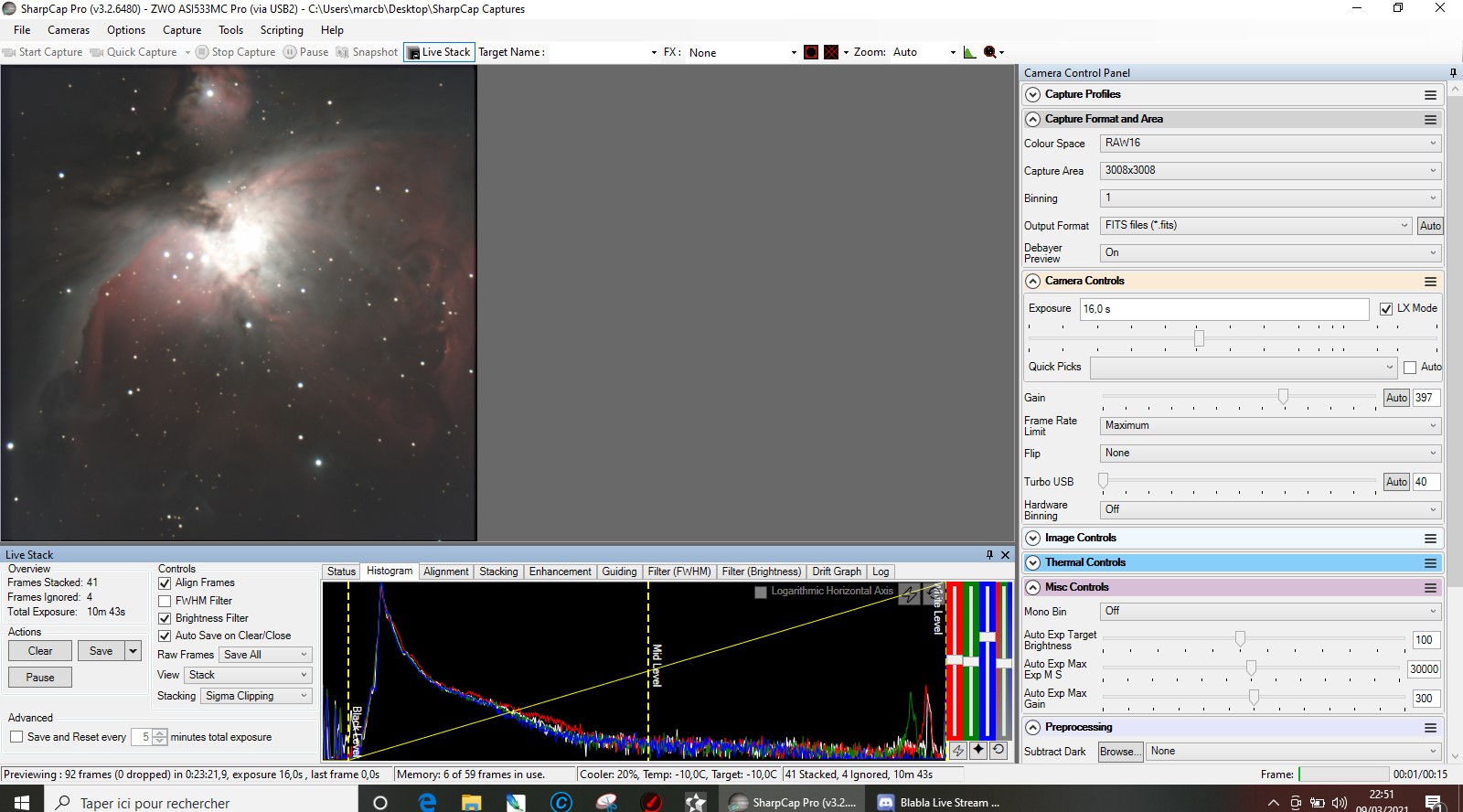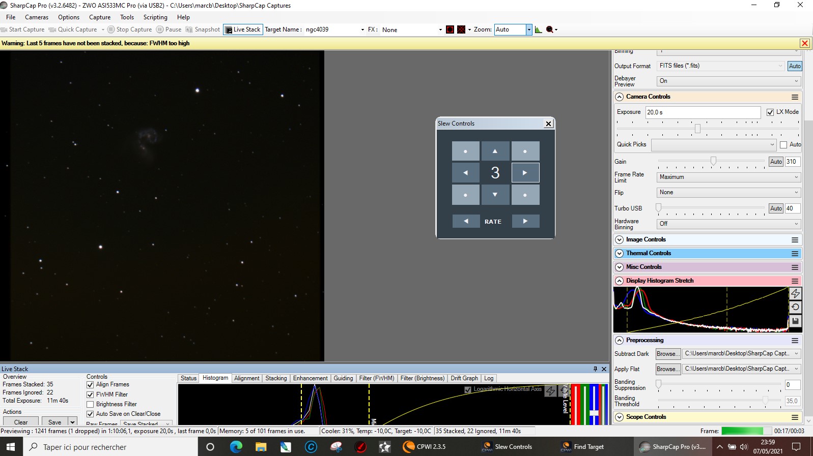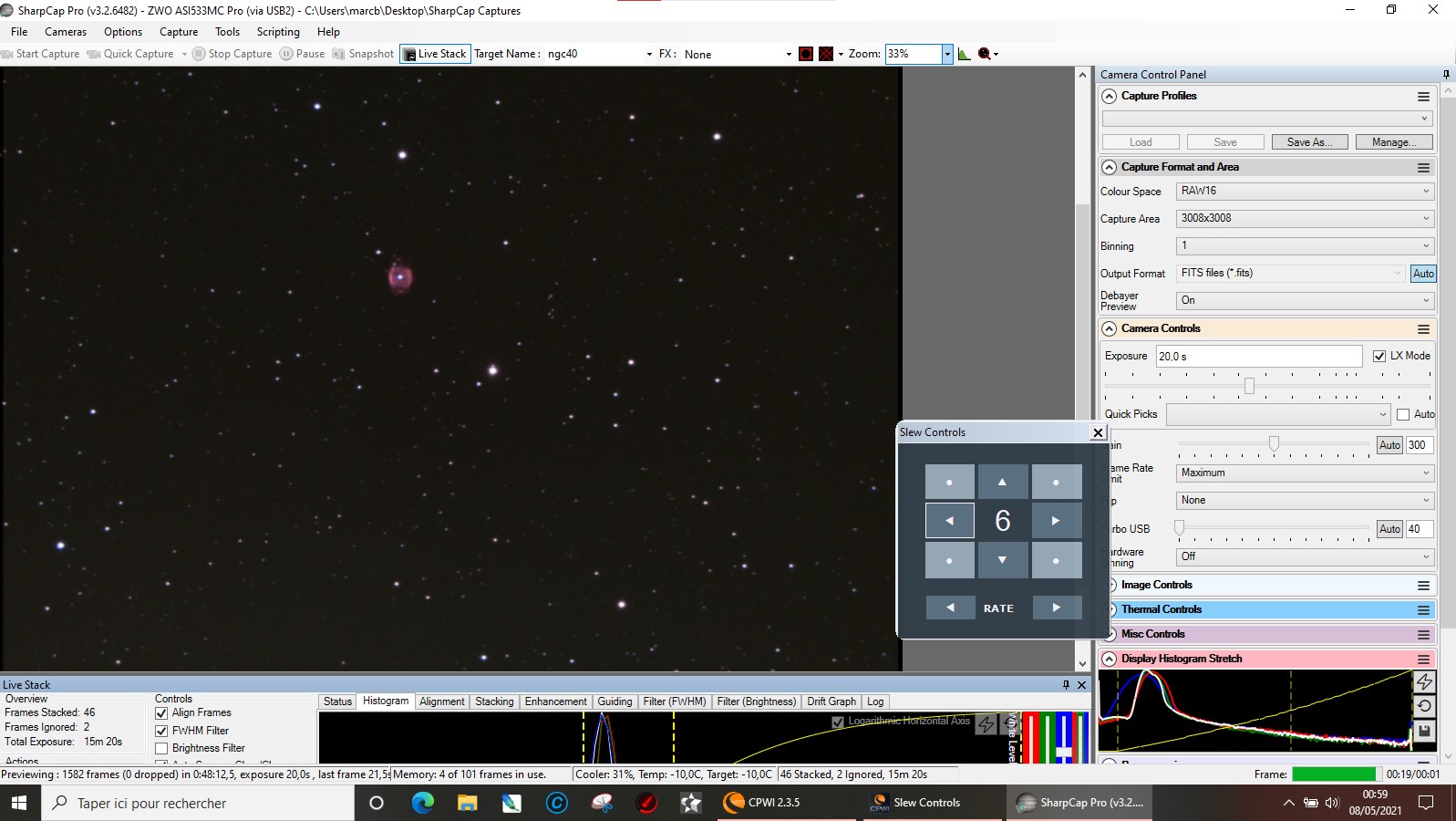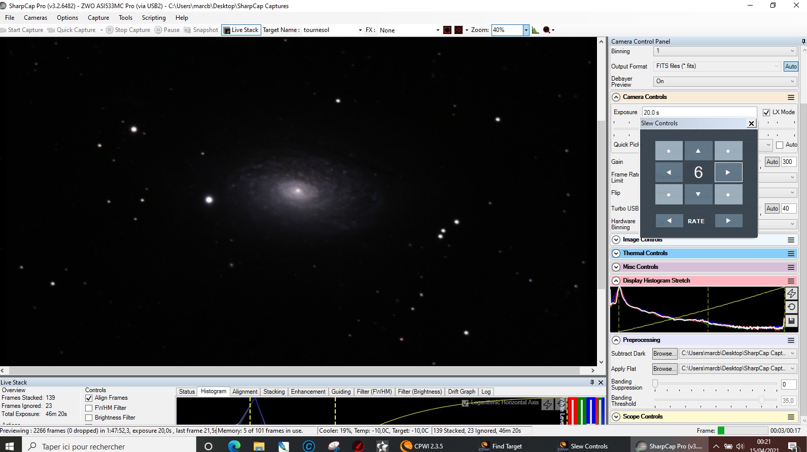 J'ai lancé sharpcap en live stack et j'ai été rebuté par le fait que le stack se lance immédiatement avant même que le moindre réglage de gain ou de temps d'expo ai pu être réalisé.