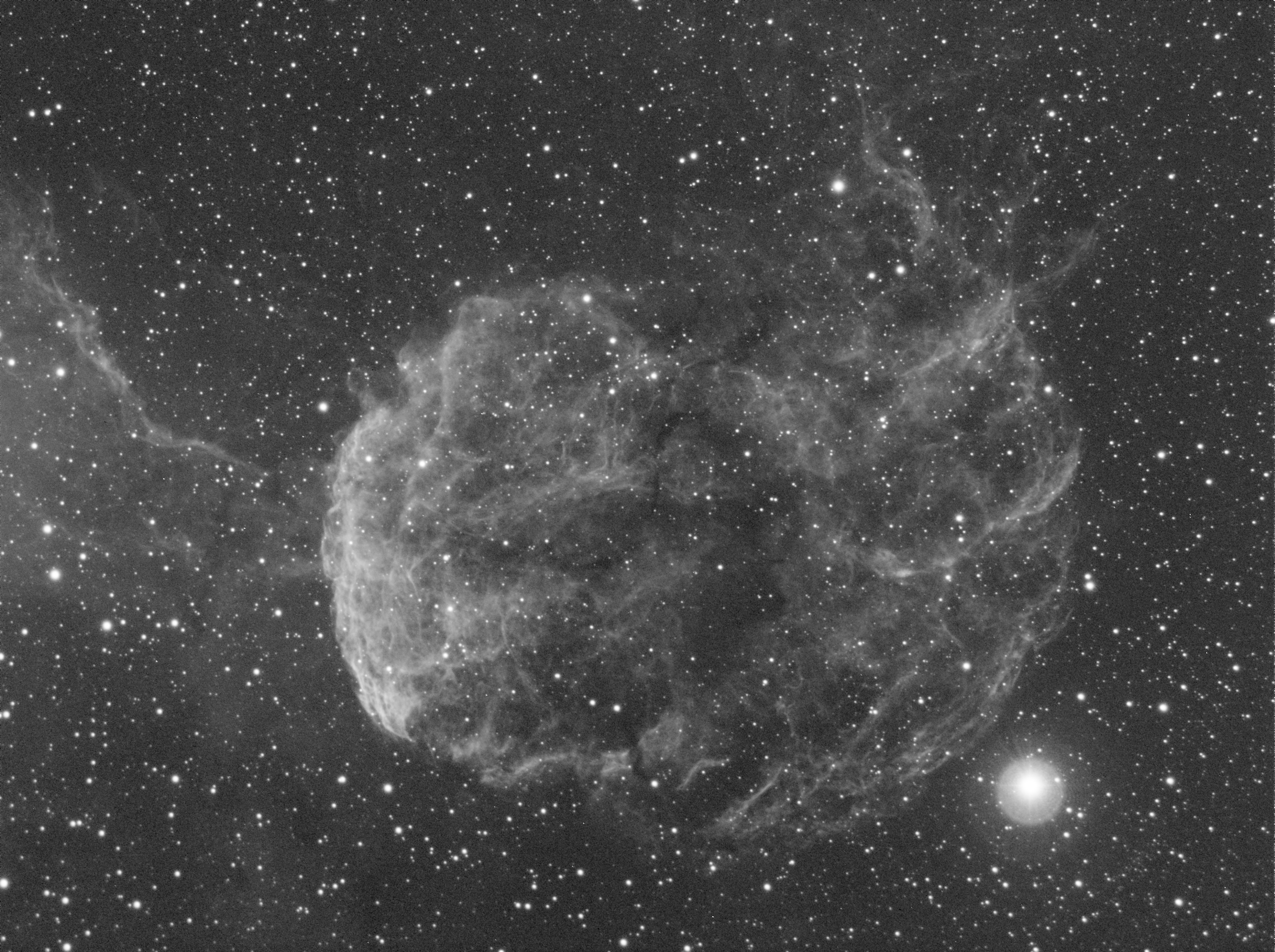 Merci du retour ! Tu as tout juste sur les défauts signalés ! La luminance est du Ha pur, après deconvolution, réduction du bruit, j'ai fait une montée d'histogramme masqué, puis starnet.