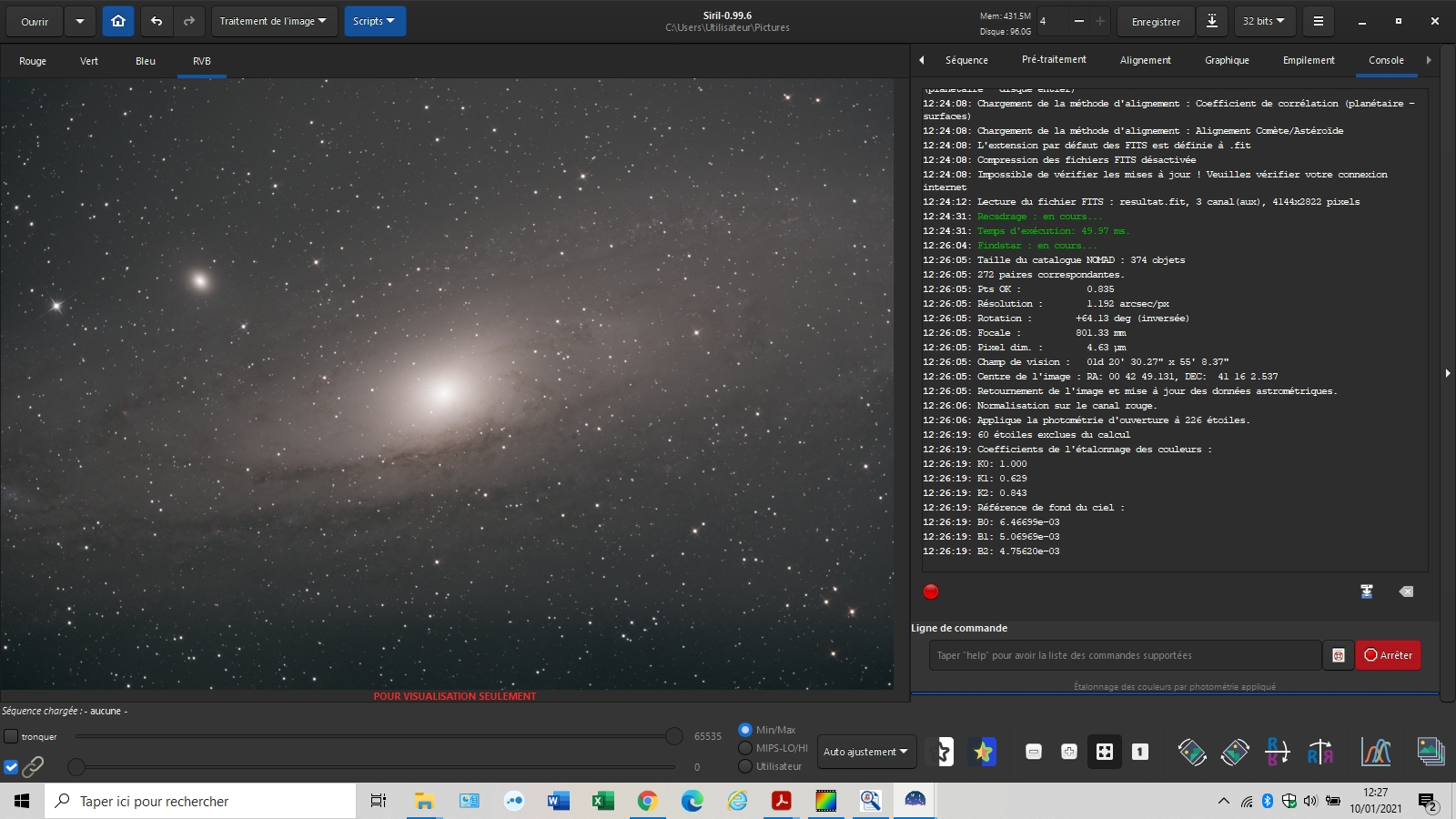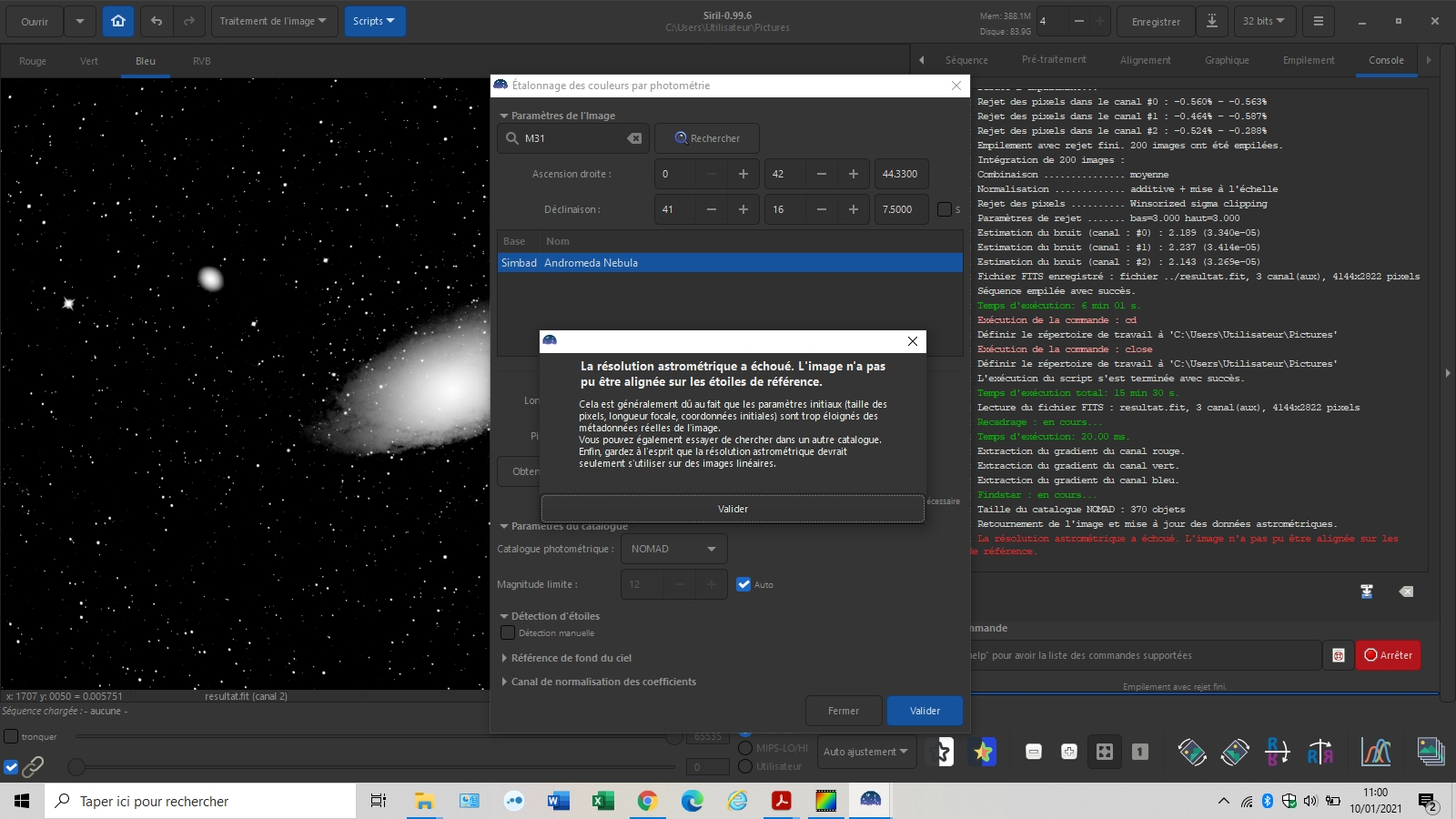 Phil49 Posté 10 janvier 2021 Posté 10 janvier 2021 Bonjour à tous, Hier soir, comme beaucoup peut-être, j'ai pu sortir le matériel pour une nuit glaciale mais à priori claire ! Il y avait un peu de vent, mais protégé derrière une haie, cela allait. J'ai installé vers 17H00 mon matos et surtout mon tout nouveau 200/800 préparé par O.U avec l'araignée et le P.O Artesky. Pour rappel, le matos utilisé est celui indiqué dans ma signature : - AZ-EQ6 GT Pro - SW 200/800 - ASIair Pro - Chaine optique : CC SW GPU F4 + OAG Zwo + 290 MM + tiroir filtre avec Optolong L-Pro + 294 MC Pro Vers 19H00 j'ai pu commencer ma MES, puis mon P.A avec l'ASIair pro. J'ai pu voir que la MAP en f4 est nettement plus étroite que sur mon 200/1000 sur lequel j'avais initialement monté mon EAF Zwo. Après la MAP sur ma cible via la routine de l'EAF, la calibration, l'autoguidage a été un peu galère, je prenais mes marques avec le tube et les 0,5/0,7 de RMSde mon 200/1000 semblaient impossibles à atteindre avec ce nouveau setup, j'étais aux environs de 1,20/1,30 (voir log). Pareil, pour l'alignement polaire j'ai fini à 9'' à l'ASIAir alors que le log trouve 1,2'... J'ai lancé ma séquence de photos après plusieurs minutes car j'ai essayé divers régalages de RA et DEC aggr car ceux auxquels j'étais habitué avec mon 200/1000 semblaient très fluctuants. En général 60 en DEC et 90 en RA me permettaient d'avoir de bons RMS avec une pose de 2 sec. Là, j'ai essayé au départ mais les valeurs étaient donc autour de 1,3 / 1,6 j'ai donc essayé de diminuer, puis de remonter, toujours pareil, je suis passé en 3 sec de pose mais pas mieux, je suis passé en 1 sec, cela a semblé s'améliorer, mais c'est revenu plus haut, j'ai donc décidé de rester à 2 sec. Je pense que le vent ne devait pas être pour rien, et surtout les turbulences en altitude... Bref, j'ai pris 200 photos à 60 sec de pose avec unity gain de 117 et à -10°C de refroidissement. Jai repris mes DOF et j'ai lancé le script "Couleur Prétraitement", Siril a mouliné et fait son job. J'ai ensuite croppé les bandes noires, fait une extraction de gradient, et j'ai ensuite voulu faire un étalonnage des couleurs par astrométrie. Et voilà ce que j'ai obtenu : Pour info, dans la partie focale et taille des photosites j'ai demandé à récupérer les métadonnées du fichier qui sont celles-ci : SIMPLE = T / file does conform to FITS standard BITPIX = -32 / number of bits per data pixel NAXIS = 3 / number of data axes NAXIS1 = 4144 / length of data axis 1 NAXIS2 = 2822 / length of data axis 2 NAXIS3 = 3 / length of data axis 3 EXTEND = T / FITS dataset may contain extensions COMMENT FITS (Flexible Image Transport System) format is defined in 'Astronomy COMMENT and Astrophysics', volume 376, page 359; bibcode: 2001A&A...376..359H BZERO = 0. / offset data range to that of unsigned short BSCALE = 1. / default scaling factor INSTRUME= 'ZWO ASI294MC Pro' / instrument name TELESCOP= 'EQMod Mount' / telescope used to acquire this image DATE = '2021-01-10T09:55:45' / UTC date that FITS file was created DATE-OBS= '2021-01-09T18:52:12.343' / YYYY-MM-DDThh:mm:ss observation start, UTXPIXSZ = 4.63 / X pixel size microns YPIXSZ = 4.63 / Y pixel size microns XBINNING= 1 / Camera binning mode YBINNING= 1 / Camera binning modeFOCALLEN= 801. / Camera focal length CCD-TEMP= -10. / CCD temp in C EXPTIME = 12000. / Exposure time [s] BAYERPAT= 'RGGB ' / Bayer color pattern XBAYROFF= 0 / X offset of Bayer array YBAYROFF= 0 / Y offset of Bayer array PROGRAM = 'Siril v0.99.6' / Software that created this HDU Je n'ai hélas pas pu récupérer le log car après avoir fermé la fenêtre d'avertissement, le logiciel ne voulait plus rien faire, j'ai dû killer la tâche sous Windows 10 ! J'ai relancé Siril, tenté un nouvel étalonnage des couleurs du fichier resultat.fit, et rebelote... Je vais tenter avec un étalonnage standard, sauf qu'il me faut me replonger dans le manuel je ne sais plus comment on fait... En attendant, je ne comprends pas cette erreur répétée sur les données qui me semblent cohérentes ! Pour la focale exacte, je n'ai pas pu voir ce que m'avait trouvé l'ASIair car j'ai indiqué manuellement 800 au lieu de 1000 après le démarrage, j'ai de toute façon fait mon P.A sans erreur et avec le CC SW GPU f4 cela me semble cohérent, car j'avais 1005 de mémoire avec mon SW 200/1000 et la taille des pixels de ma 294 n'ont pas bougé entre temps ! Merci pour votre aide ! Philippe Le log de la session d'hier soir : Autorun_Log_2021-01-09_194551.txt