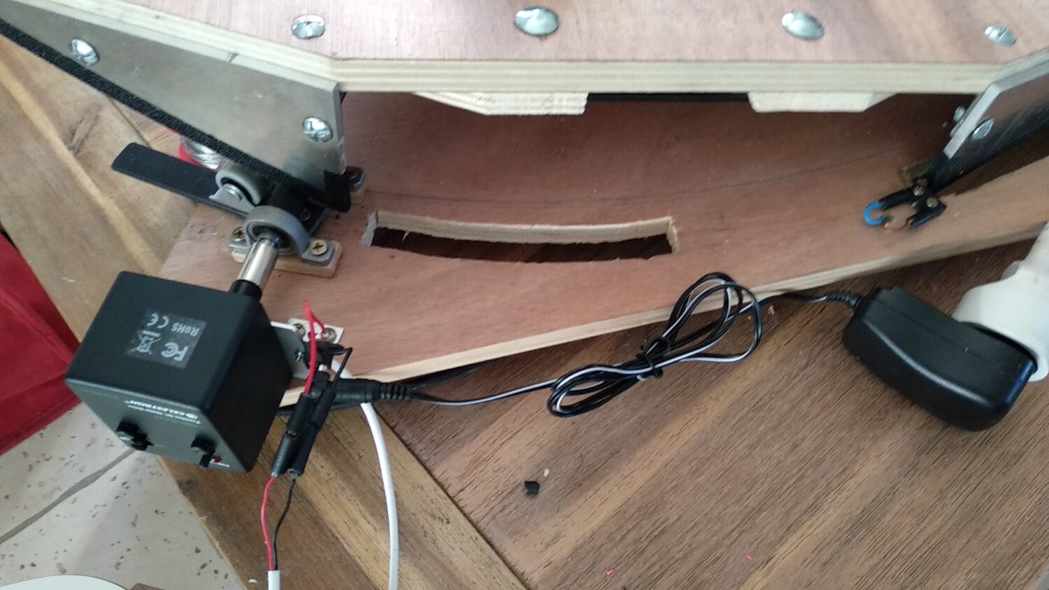 Est-il possible d'avoir une vue d'ensemble de l'entrainement ? Votre moteur est alimenté par deux fils, rouge et noir, est-ce bien un moteur à courant continu ? Dans ce cas comment contrôlez-vous très exactement sa vitesse ?