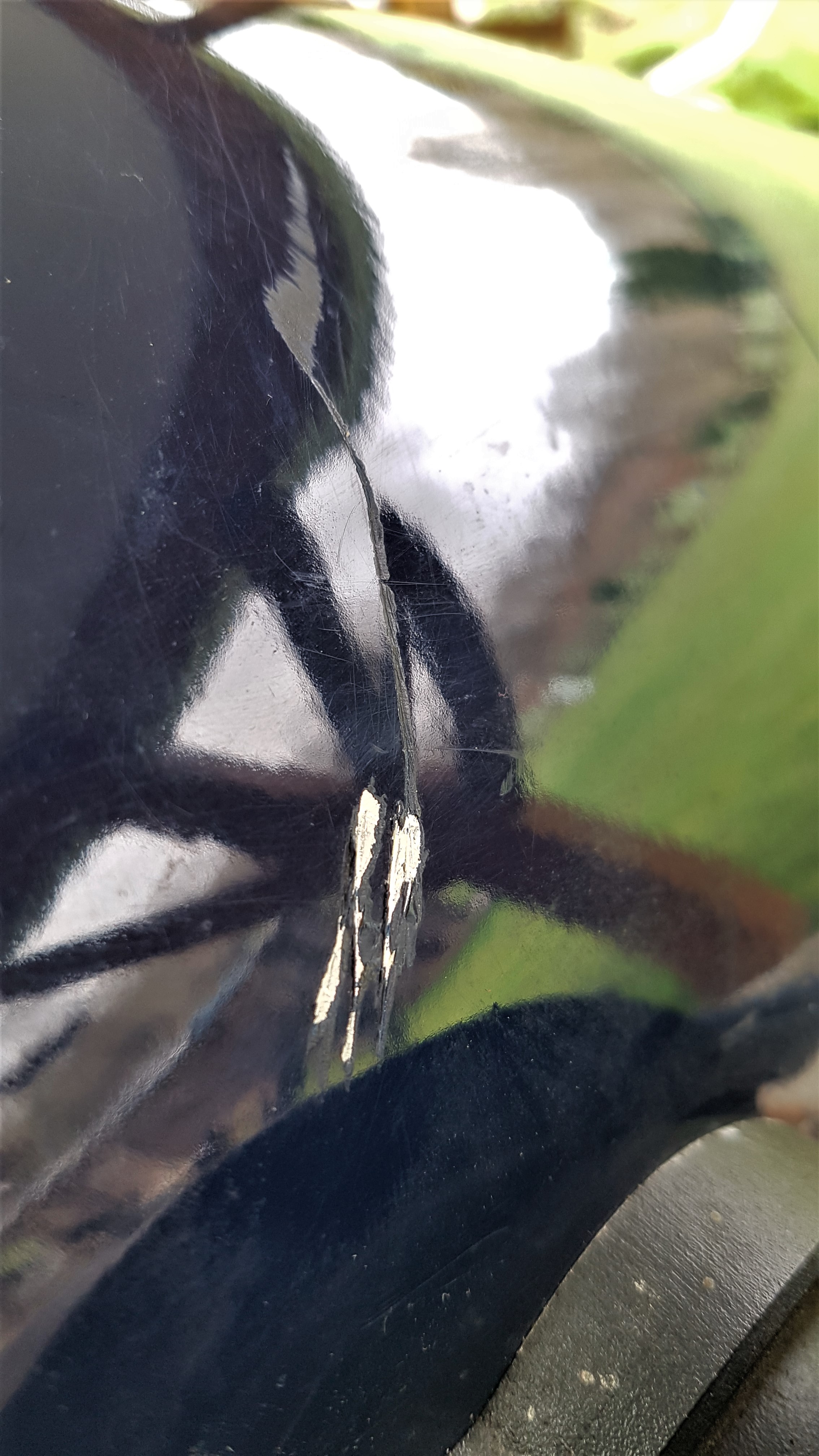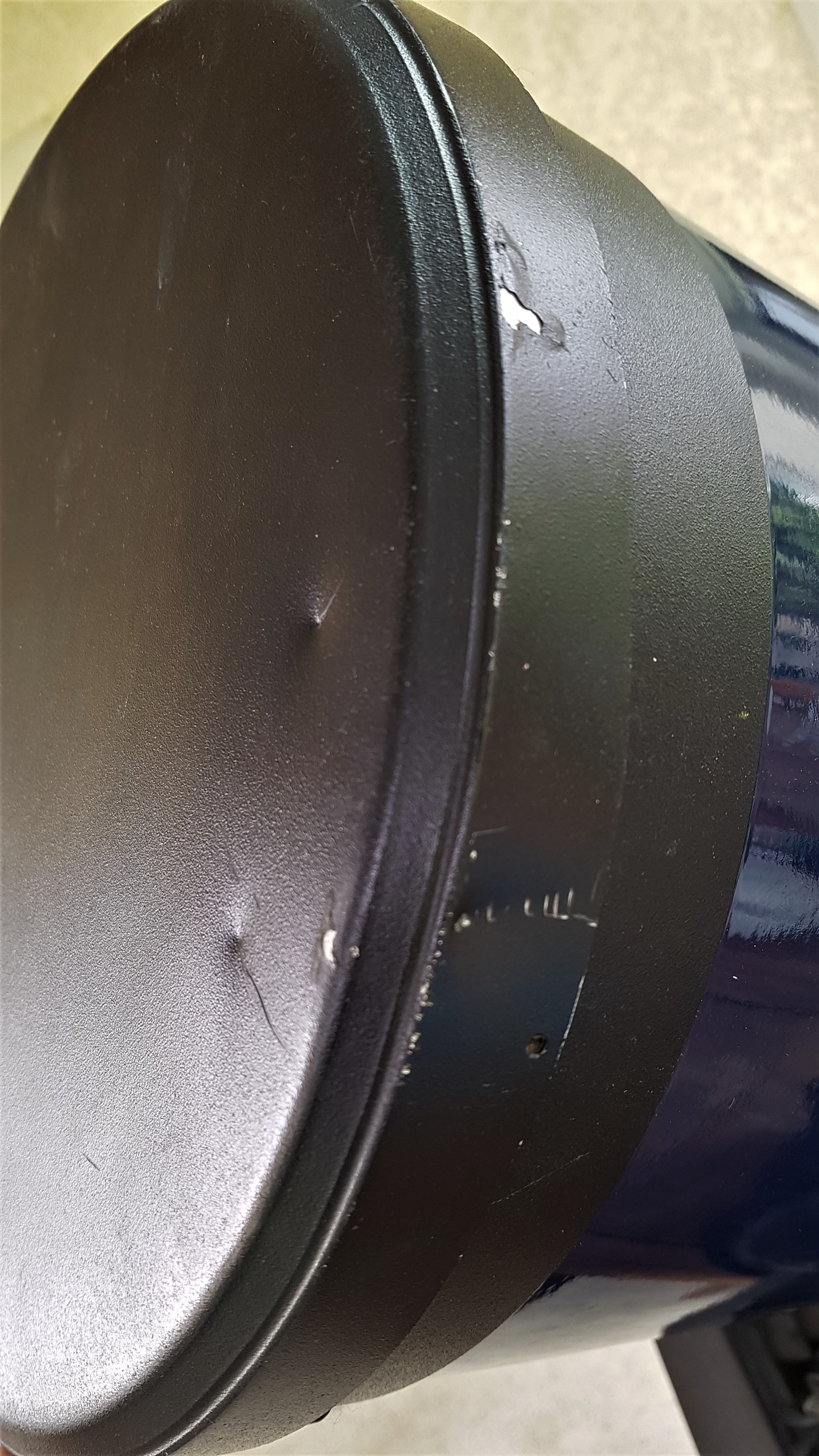 le bouchon de protection de l'optique a pris des coups. Va falloir que j'apprenne les bases de la carrosserie ou chaudronnerie. Ca devrait pouvoir revenir en y allant doucement et avec un petit coup de ponçage et peinture.