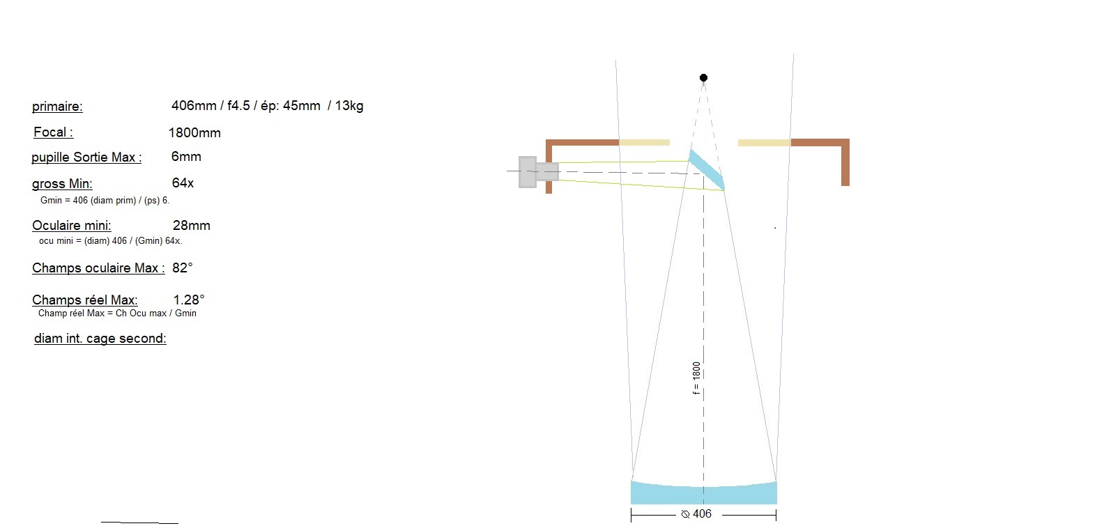 Pour repondre à une des question que j'ai vue, cela implique un diamètre pour la cage secondaire de (1800-323)*2*tan(1.6/2)+400=441mm + un peu pour la collim!