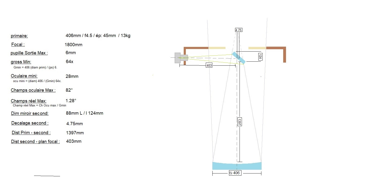 Les premiers schemas indiquent une distance axe optique/plant focal de 403mm. C'est BEAUCOUP trop avec un secondaire de 88mm de petit diamètre (tout le cone de lumière n'arrive pas a l'oculaire!)