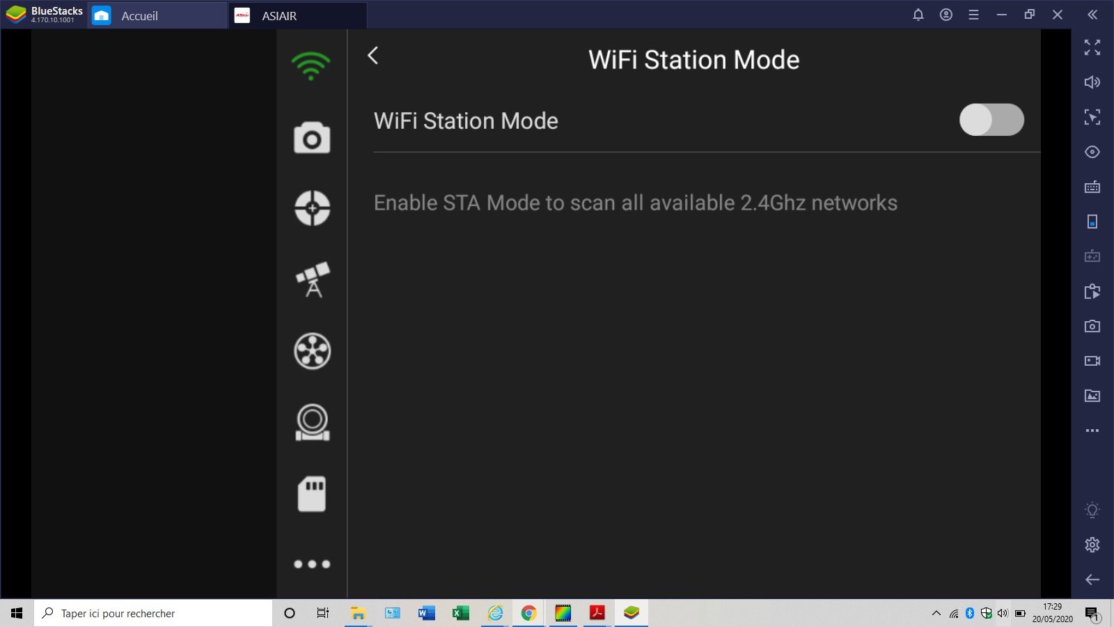 • on se connecte à nouveau au Wi-Fi avec la tablette, on cherche cette fois le réseau ASIAIR