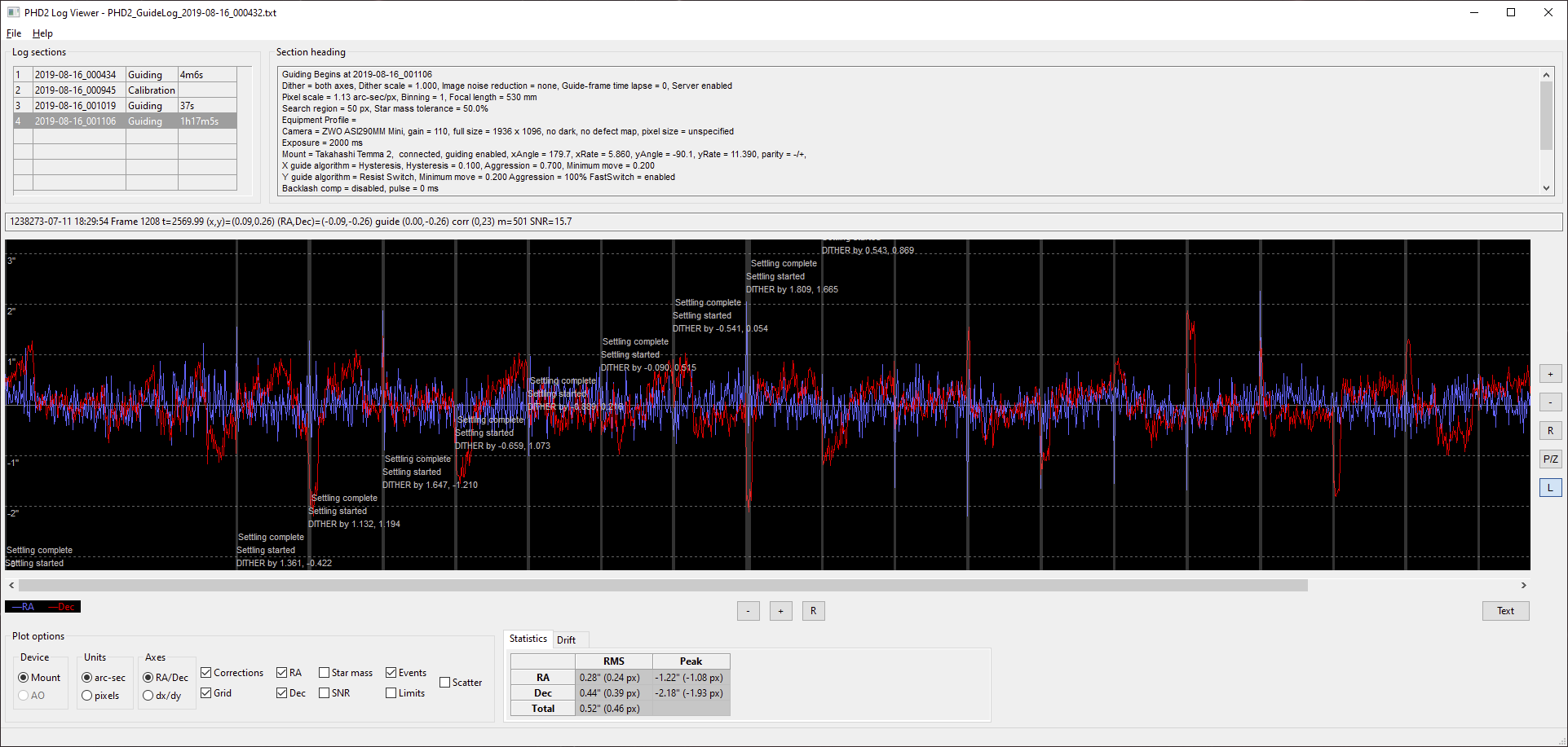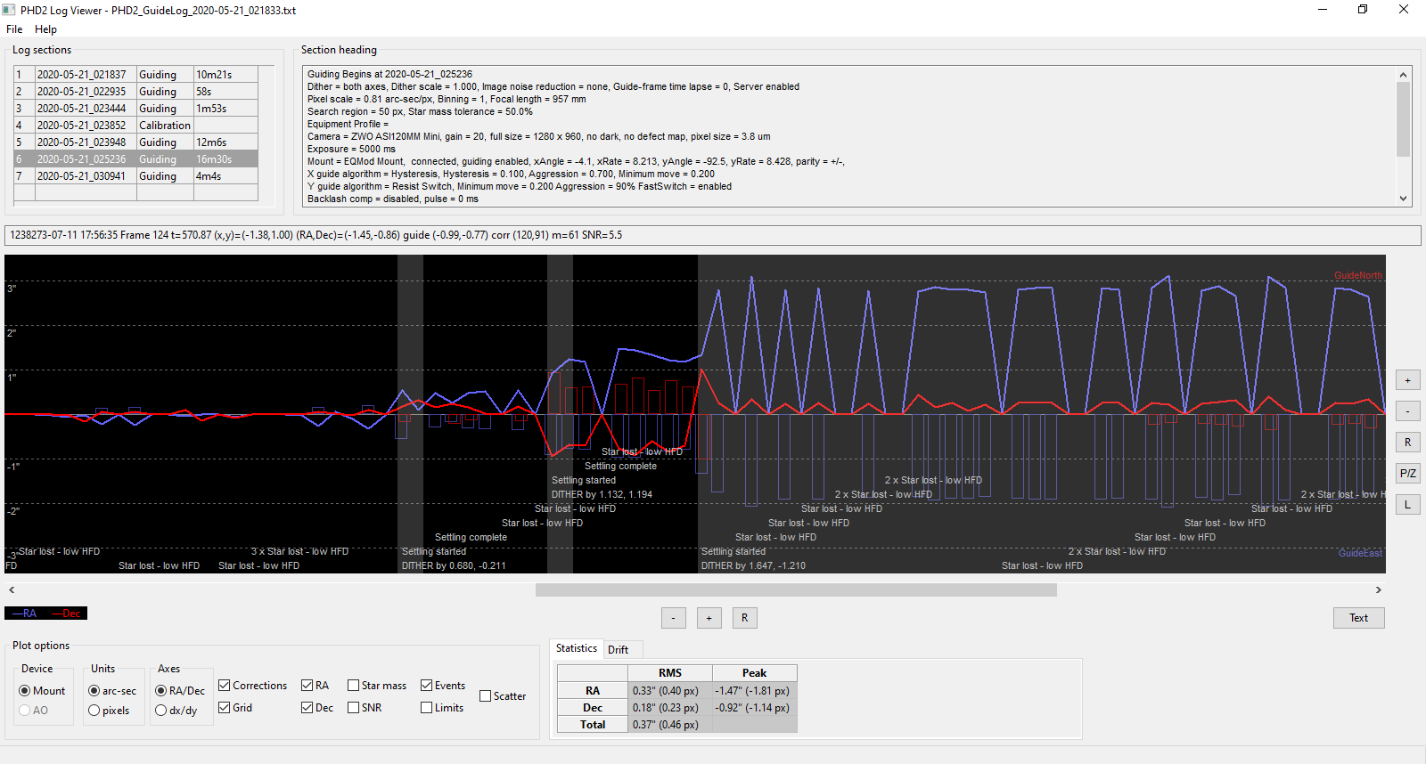 Avec le graphe de PHDlog viewer tu as la possibilité de voir l'erreur périodique de ta monture. Pour ça tu cliques droit dans le graphe puis "Analyse selected, raw RA".