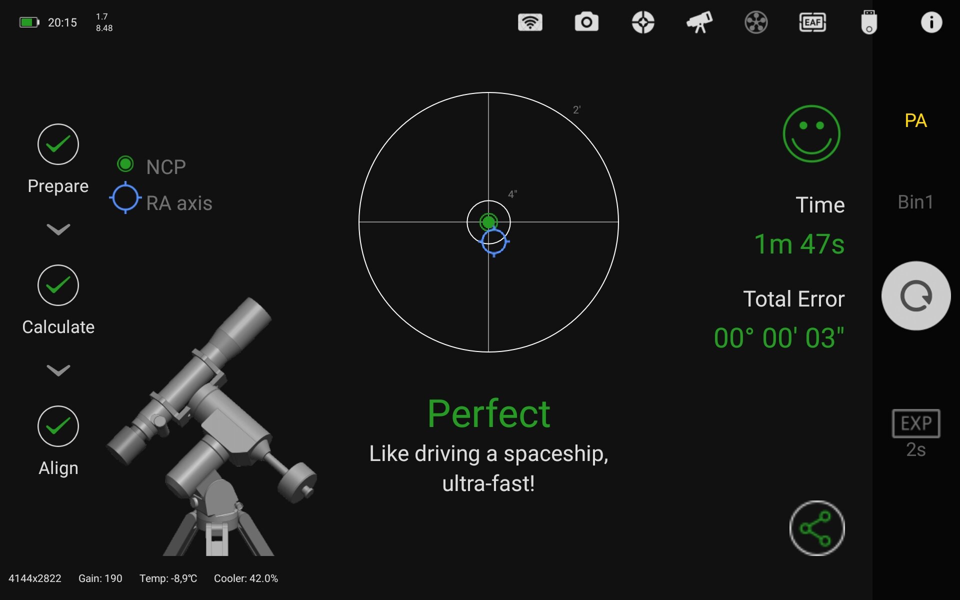 Je vais essayer, mais j'étais en 5 sec, et il ya des moment où il dit qu'il ne retrouve pas l'étoile, c'est pour ca que j'étais passé à 8s. Sous bortle 4, à F4, m'enfin