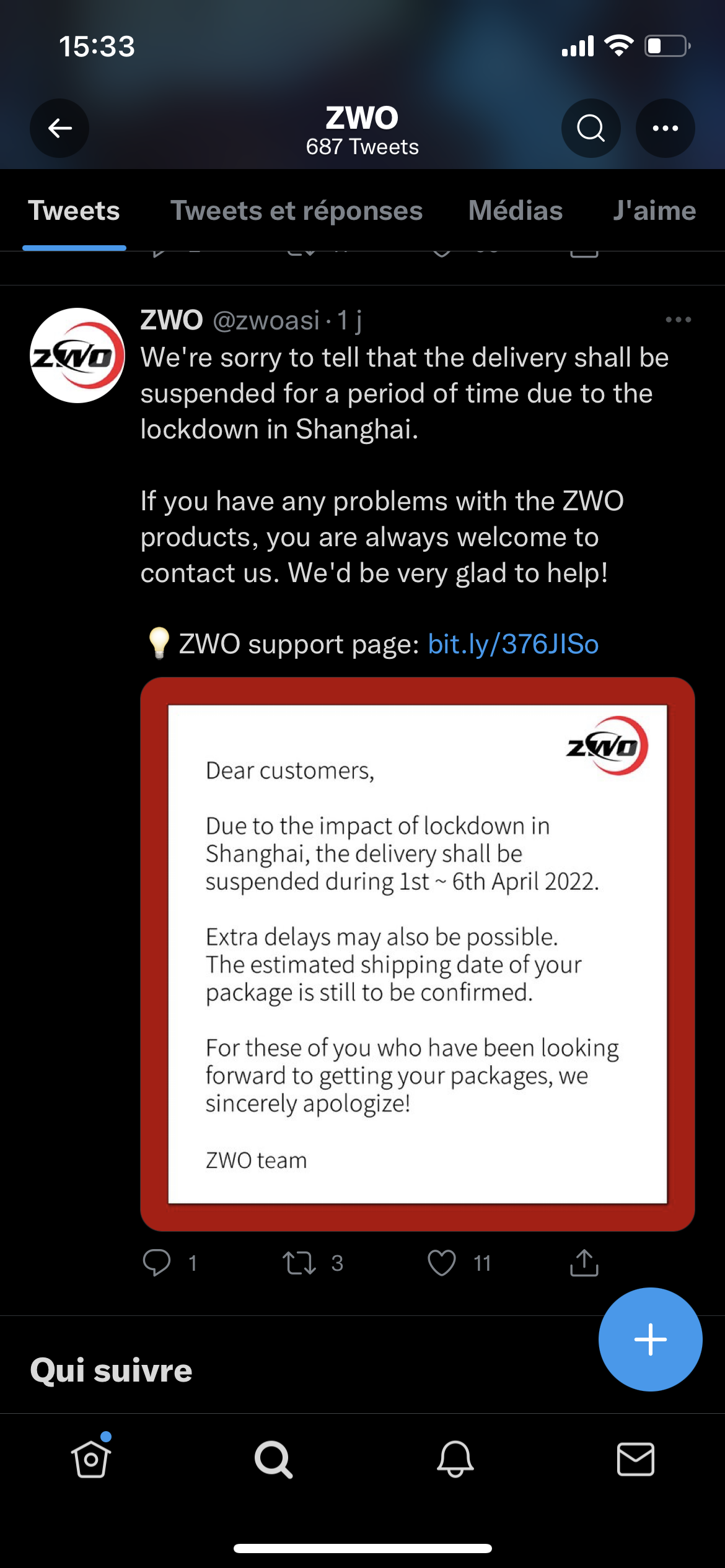 ZWO a annoncé hier que les envois seraient bloqués pendant une semaine
