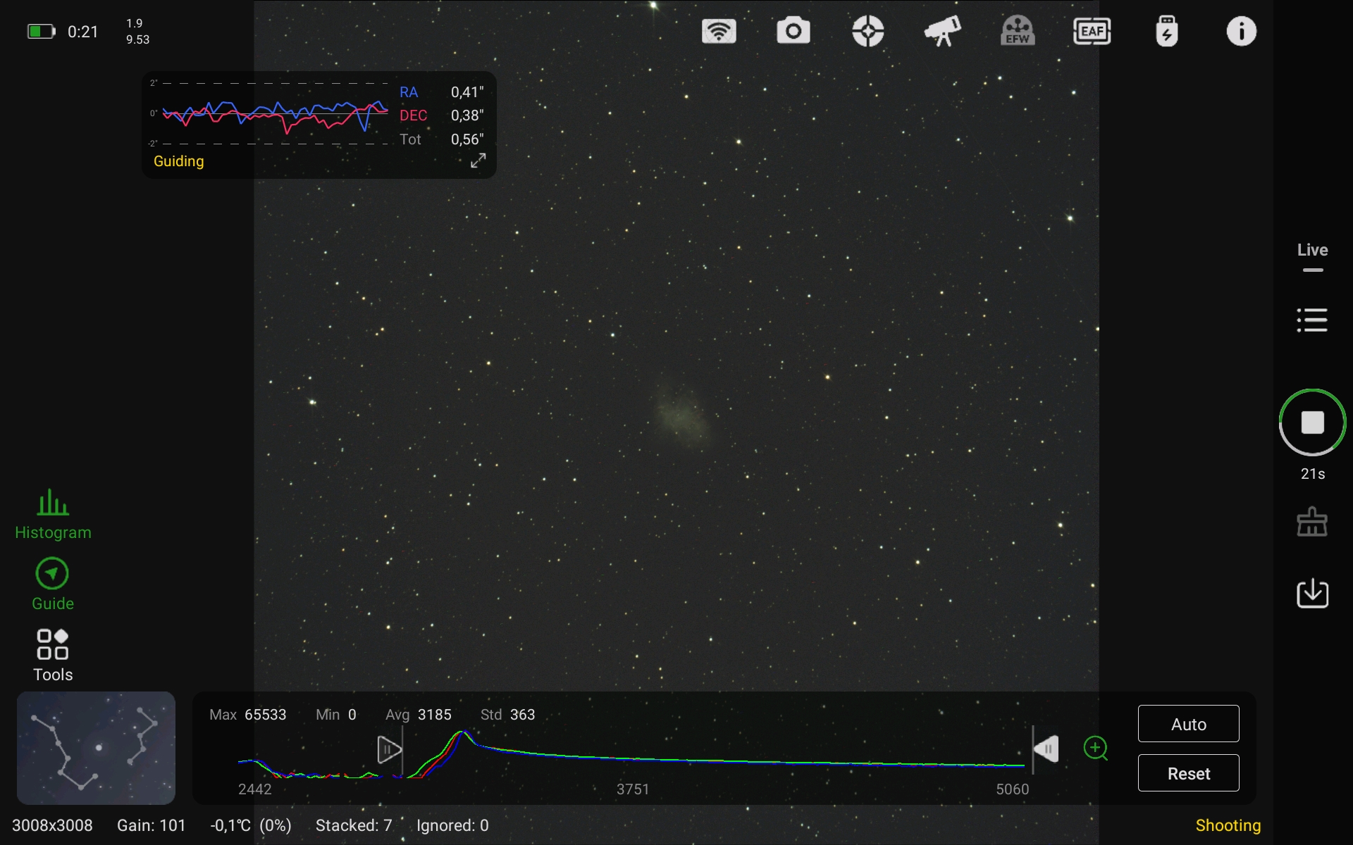 Là où je suis content, c'est le guidage : autant sur NINA et PHD2, ça partait souvent en cacahouète, là je n'ai eu aucun problème avec une calibration très rapide, un suivi global parfois sous les 0.5"