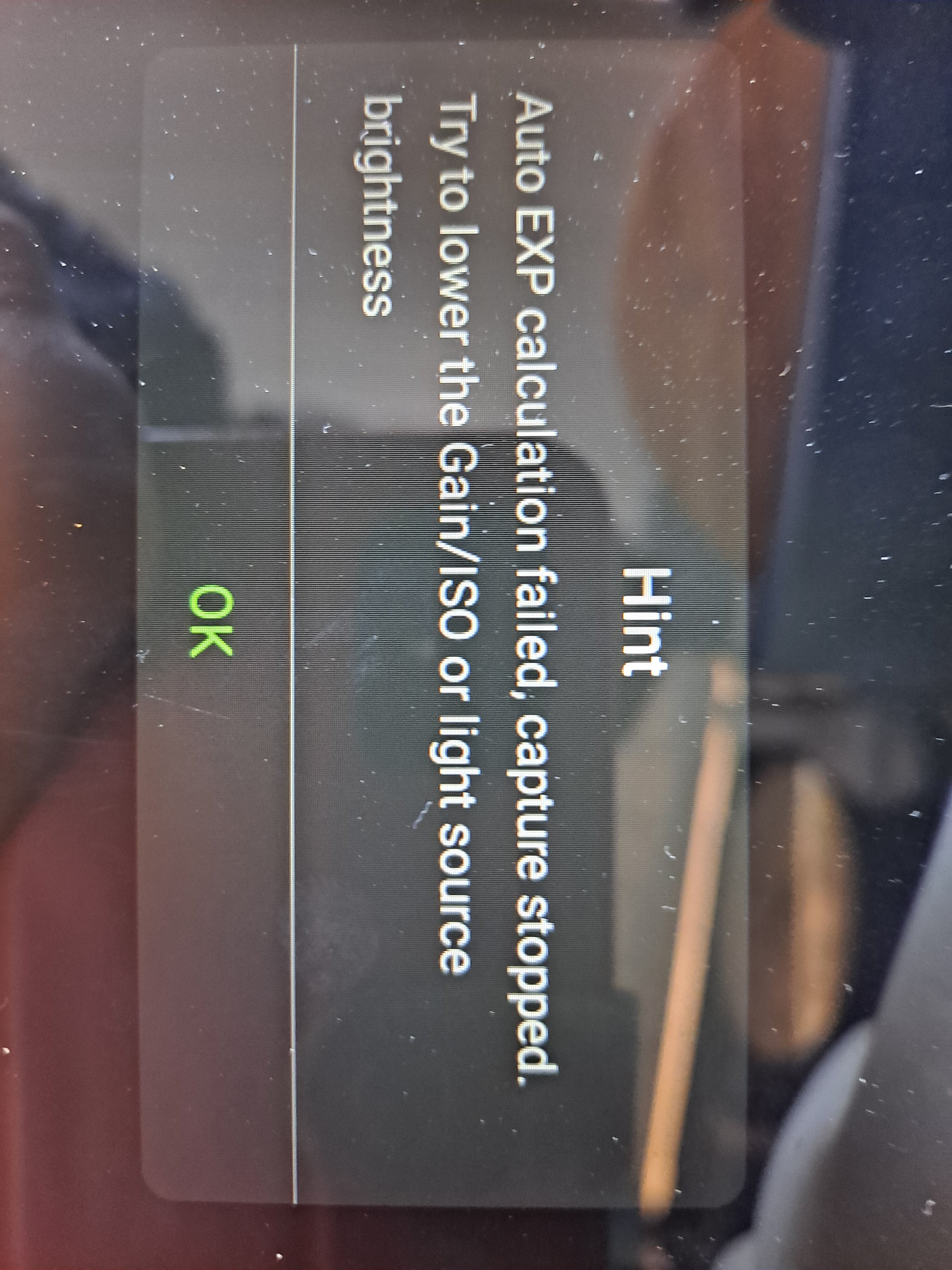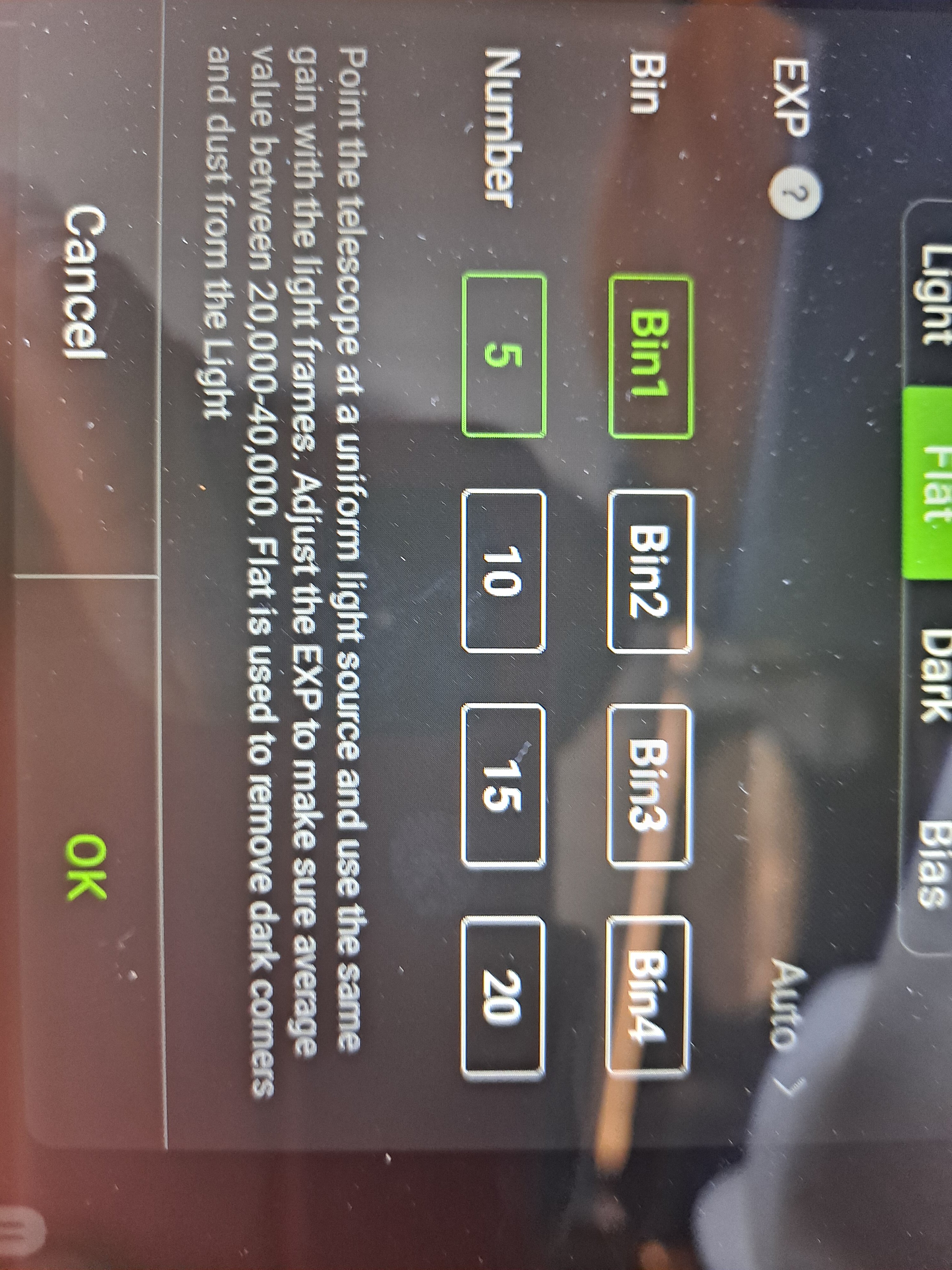 Après quelques heures à passer a essayer de faire des Darks, Bias, et Flats en LIVE, j'ai piteusement échoué à maintes reprises et essai pour les Flats... Le froid et la détermination de mon Asiair  ont été vainqueur sur ma patience. Mise en place de mon matériel, Canon 6d défiltré, ma boite à lumière fabrication maison avec des ceintures de Leds, quelques soient le nombre d'ISO, le réglage de l'expo, cela ne veut pas "shooting"... Je vous joint des photos faite de ma tablette avec le message qui ne change guère quelques soient mes manipulations, Iso à 100, ou en automatique sur le Canon, à 800 ou à 100 sur l'Asiair, à grande ou la plus petite vitesse d'obturation.