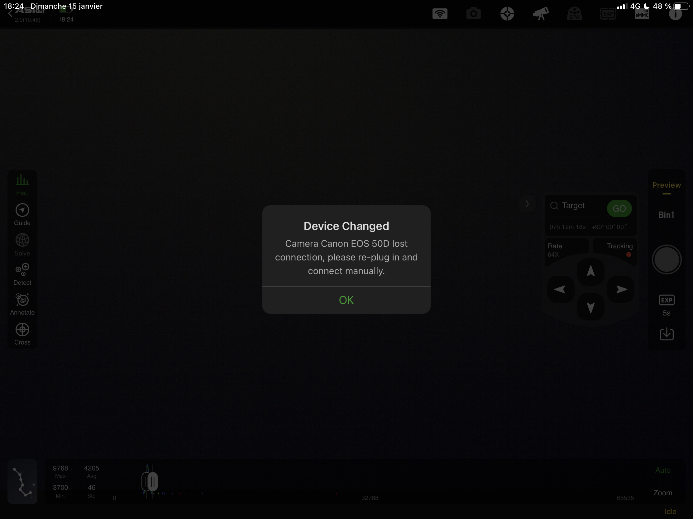 J ai des pertes de connections intempestives entre le boîtier canon 50D et l ASIAIR PLUS voir photo, alors que le boîtier canon est toujours allumé.