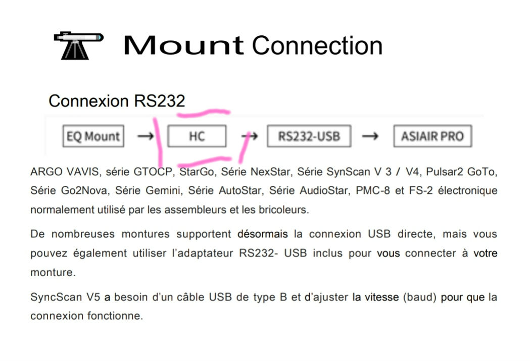 Dans le guide de l'Asiair (très bien réalisé d'ailleurs !) en page 1 du topic, à la page 19 on fait mention d'un "HC" entre la monture et le câble RS232. C quoi ce "HC"? Le port "Hand control" de la monture, de la raquette ?