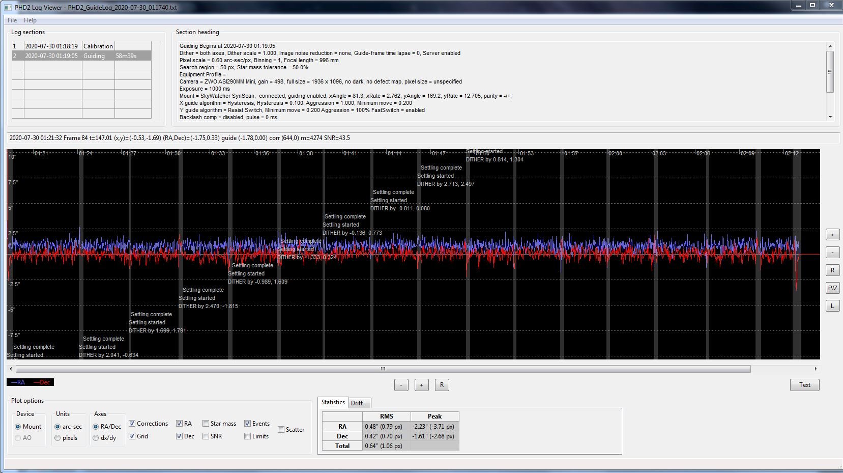 J'ai réalisé un suivi avec dithering (c'était une première pour moi) sur un peu moins d'une heure avec une dérive RMS générale  très inférieure à la second , ce qui au final semble correct pour mes poses....oui mais....!!  La mise en station a été réalisée avec la fonction ASIAIR intégrée ( qui semble ranger définitivement PôleMaster au placard)