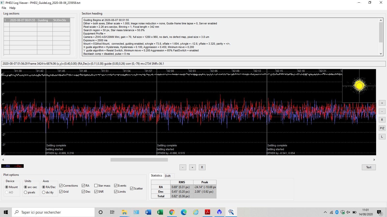 Pour le dithering, pareil, j'ai commencé à l'utiliser il y a une semaine, je tâtonne, j'ai mis 2 pixels, 2'', 5 sec de settle time (a 10' je trouvais que cela mettait beaucoup de temps à se recaler au niveau de la courbe et ça mettait un sacré bazar dans la courbe !) et toutes les 5 images.
