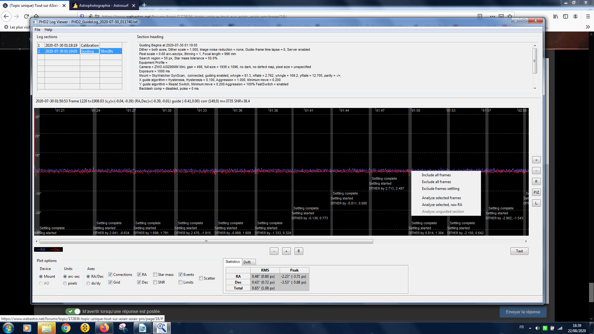 je t'ai oublié . Oui j'utilise  image.png.b0498f55df6ac779e424795adce09b63.png pour lire le log de ASIAIR stocké sur la clé USB et lorsque je visualise les courbes, je me positionne sur la zone noire du graphe, clic droit et je choisis "Analyse selected, raw RA"