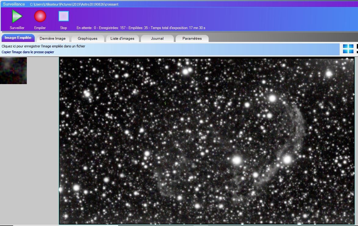 Voici à l'arache les images (une petite galaxie NCG7331 et le Croissant NCG6888) faites avec des unitaires de 30s (gain 100)