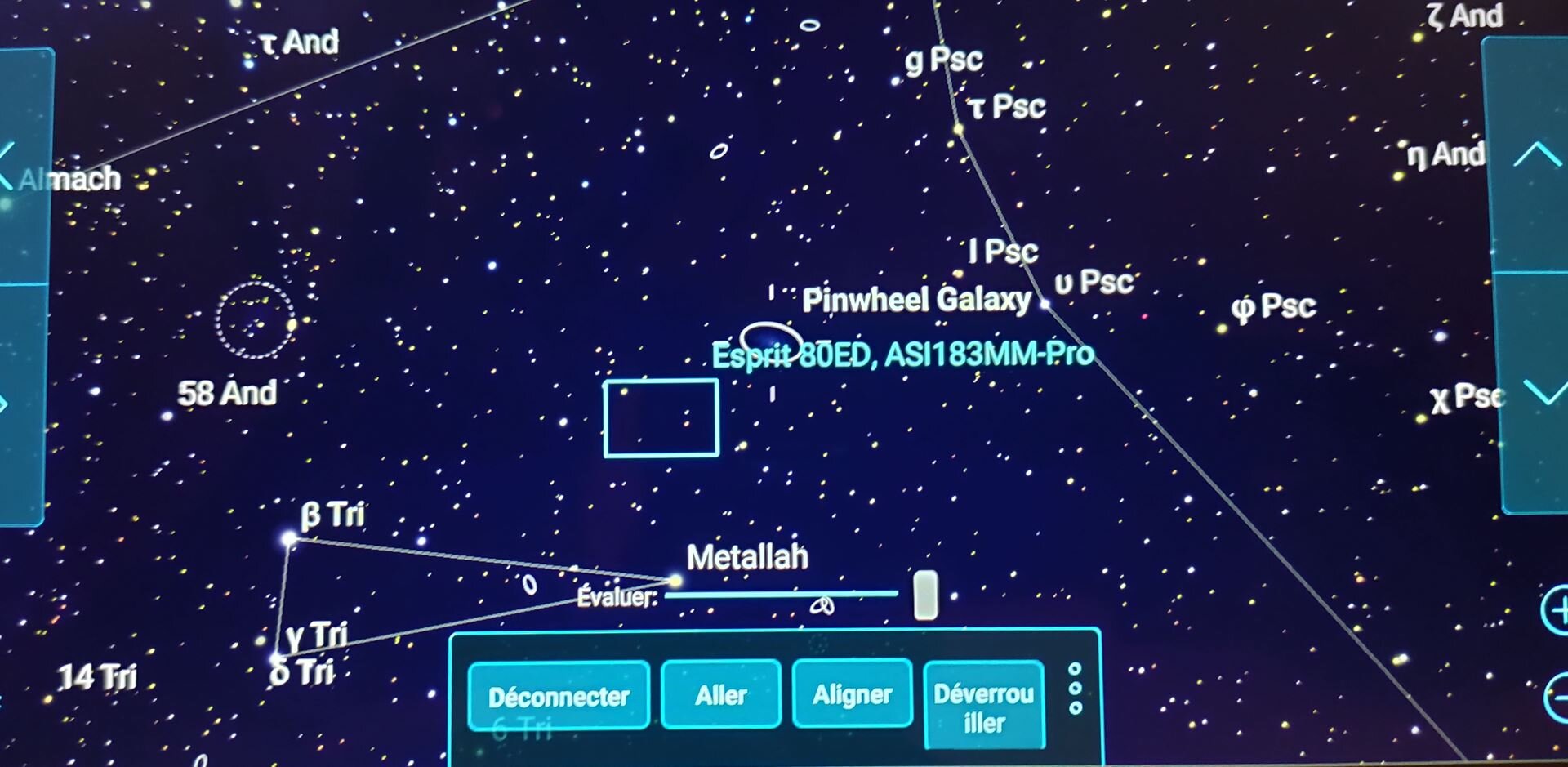 Je ne sais pas si c'est de ça que tu parles : la cible du moment (M33 dans la brume) est bien calée plein centre du capteur (merci au plate solving) mais le rectangle du champ reste à côté alors que j'ai cliqué "Aligner" en pensant que c'était l'équivalent de "Synchroniser". Visiblement c'est pas la bonne méthode...