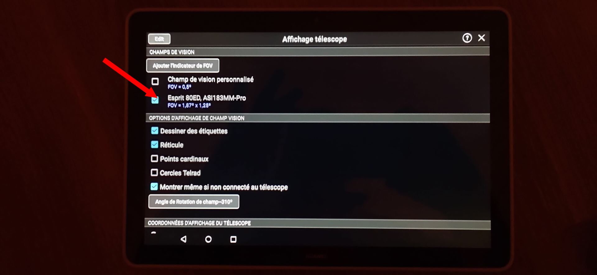 Tu as menu "Observer, tu défini tes équipements (telescope, capteurs....) et ensuite, c'est dans "Affichage telescope" que tu sélectionnes ce que tu veux afficher. Dans ajouter indicateur FOV.