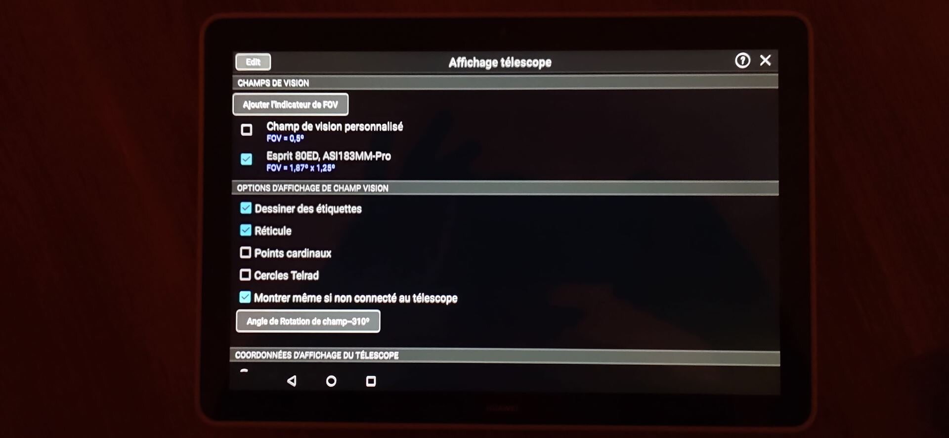 Si ça peut te servir, mes paramètres Skysafari qui fonctionnent.