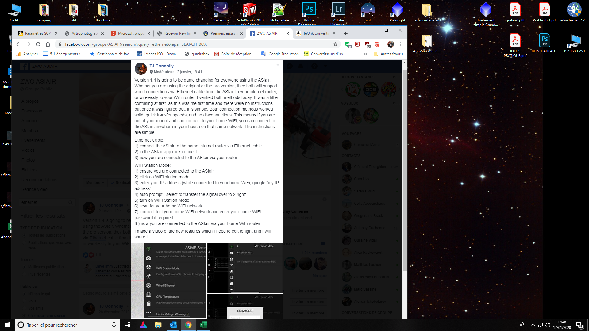Pour ce qui est du raccordement en Ethernet, j'ai également vu quelques indications sur le forum ZWO mais pas de remarque particulière concernant l'utilisation des logiciels. Affaire à suivre ....