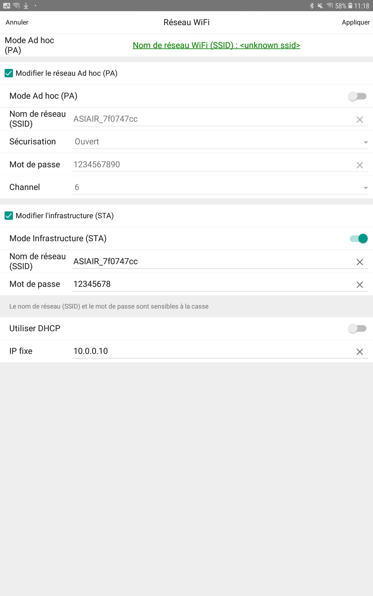 connexion direct avec asiair pro vers tablette ou tel android avec un cable rj45 (essai 3 câbles rj45 différents en cat 6 )