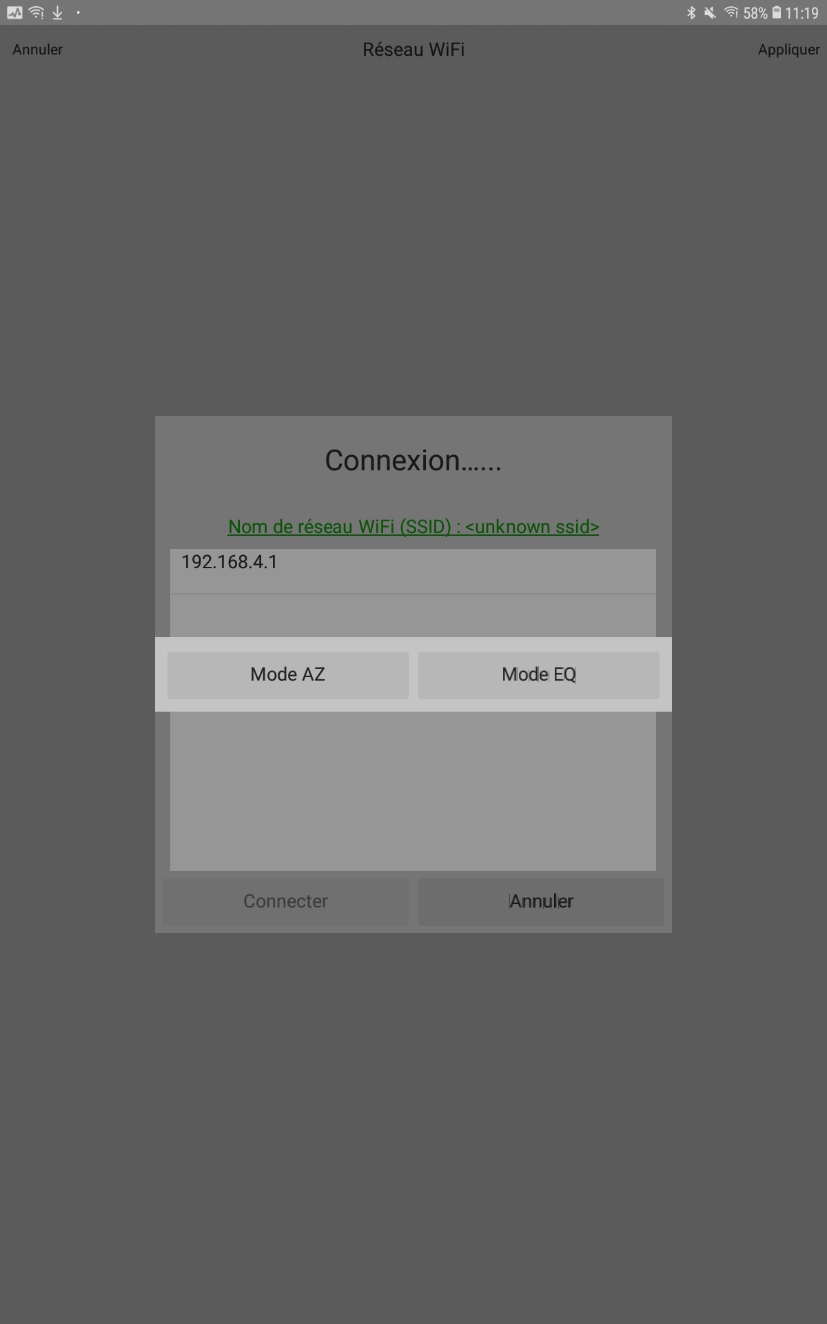 Il faut reprendre le mode d'emploi que j'ai fait pour l'iOptron, et le process est le meme pour avoir WiFi AZGti en mode Bridge, se connecter a l'ASIAIR. Puis mettre bonne monture et réglage dans ASIAIR. l'AZ GTI n'est pas 5G, donc il faut que l'ASIAIR soit réglée en 2.4G.