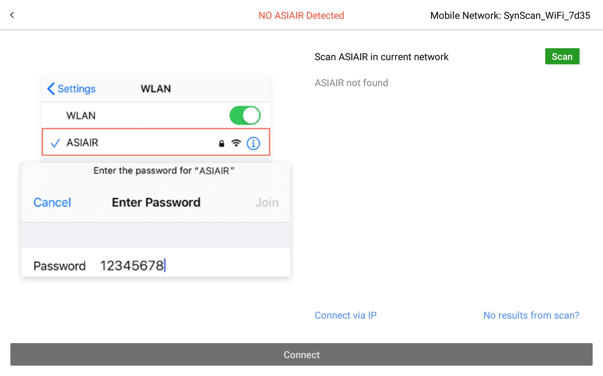 5- launch synscan app, click connect on top, then goto WiFi settings in app