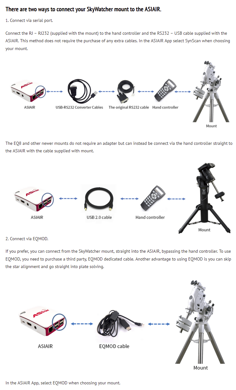 J'ai fait le test du schéma deux de @Colmic, et ca fonctionne, du moins le suivi sidéral. D'ailleurs, j'ai appris un truc, quand l'asiair est connecté par la raquette, il faut faire l'étalonnage sur les étoiles comme un goto classique, sauf que le centrage avec les flèches ne fonctionne pas. Et sans étalonnage, la monture reste déconnectée de l'asiair...