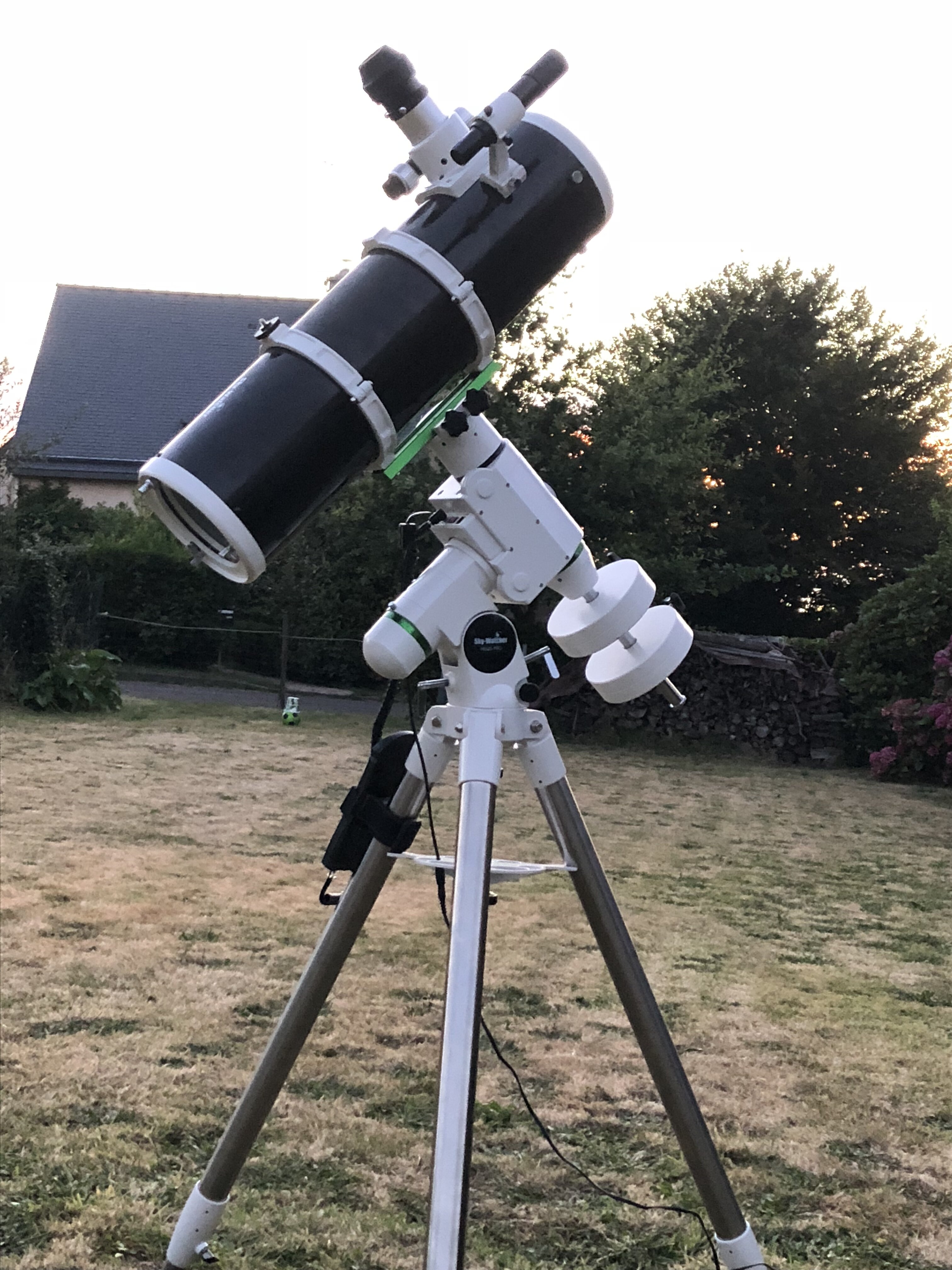 voici une photo de mon setup. (J’attends également une petite lunette guide avec une caméra ASI120mini que je mettrais à la place du chercheur d’origine)