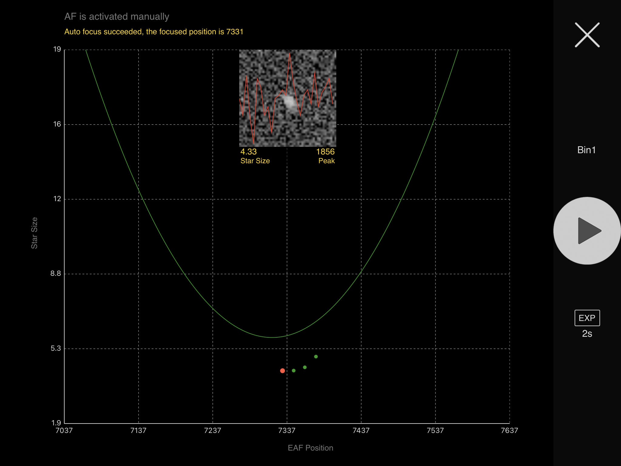 la procédure est simple : en mode preview ou focuser tu dégrossis la mise au point avec l’EAF en mode manuel (avec les flèches  haut / bas)  et tu finalises en déclenchant l’autofocus. L’ASIair pilote alors l’EAF pour réaliser la courbe en V de calibration et ajuste ensuite le focus finement pour réduire au maximum la taille des étoiles.