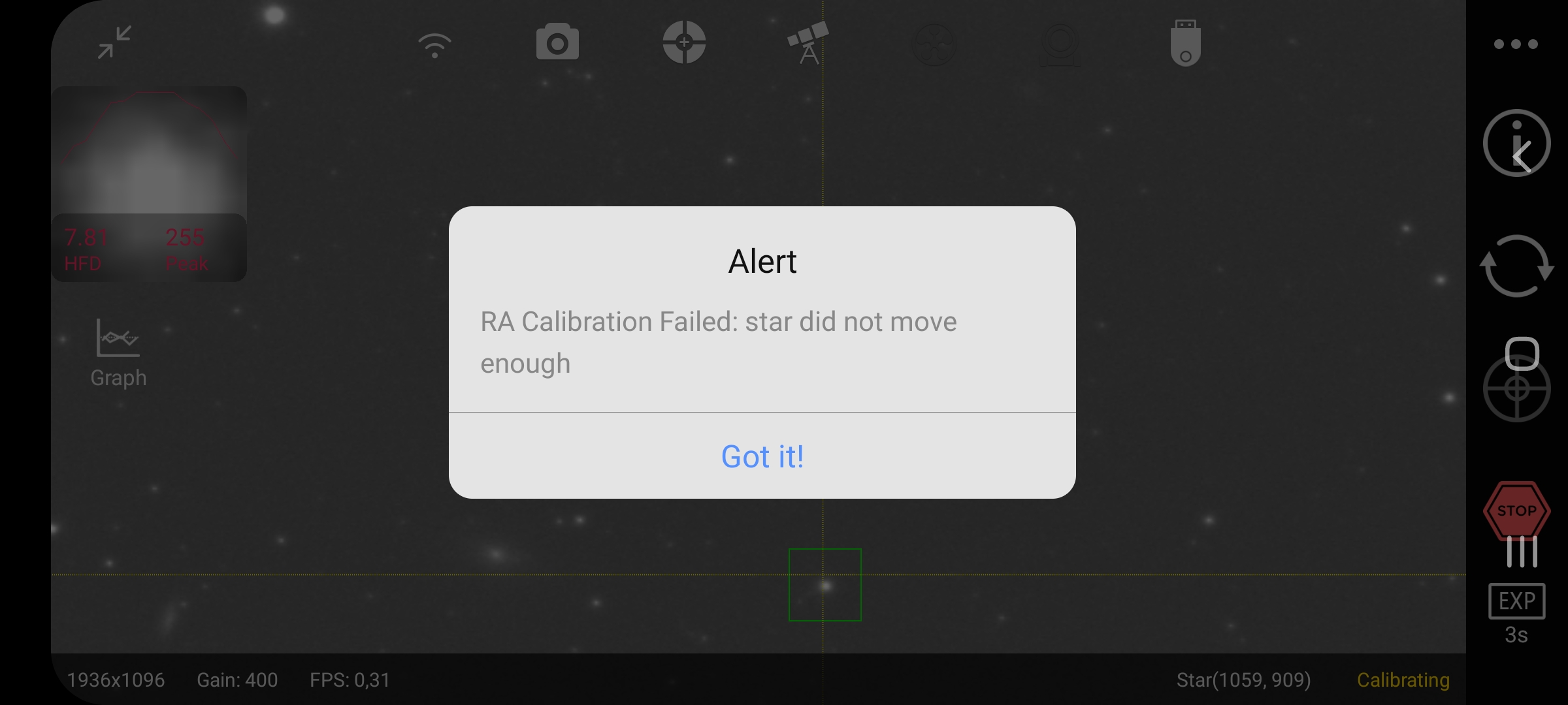Problème d'autoguidage le weekend dernier, j'ai voulu faire ma calibration mais l'Asiair s'énerve et m'envoie ce message :