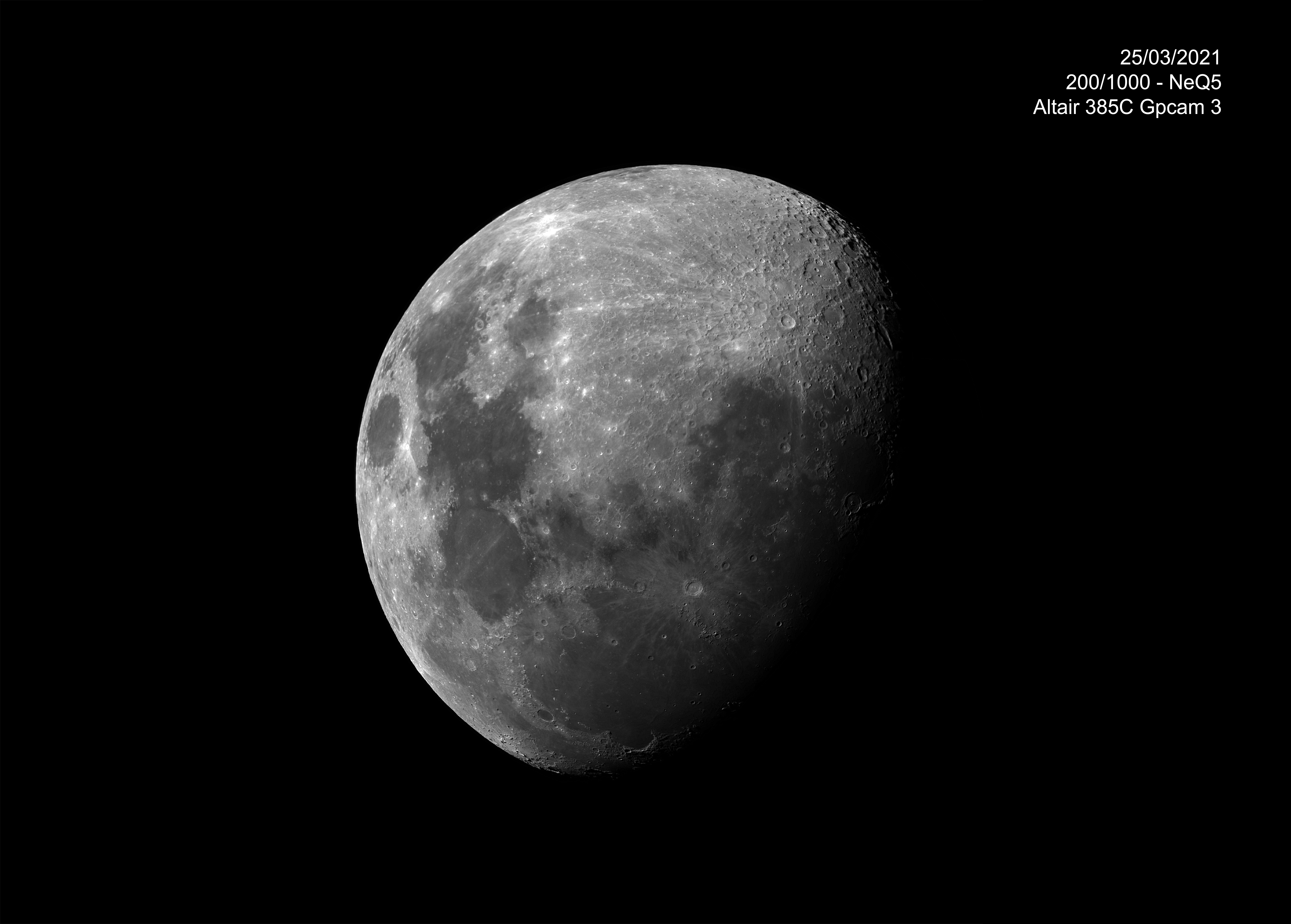 J'ai eu un peu peur que le colis ait subit quelques déboires durant le voyage, et j'ai donc tout tester ce soir, et "réussi" après plusieurs essais (vu que je suis totalement novice), à capturer quelques images de notre cher satellite que voic.i Pour information, il ne s'agit que de one shot, pas de temps de pose etc. ce soir, c'était juste un test pour vérifier que cela fonctionnait. Toute critique est la bienvenue.