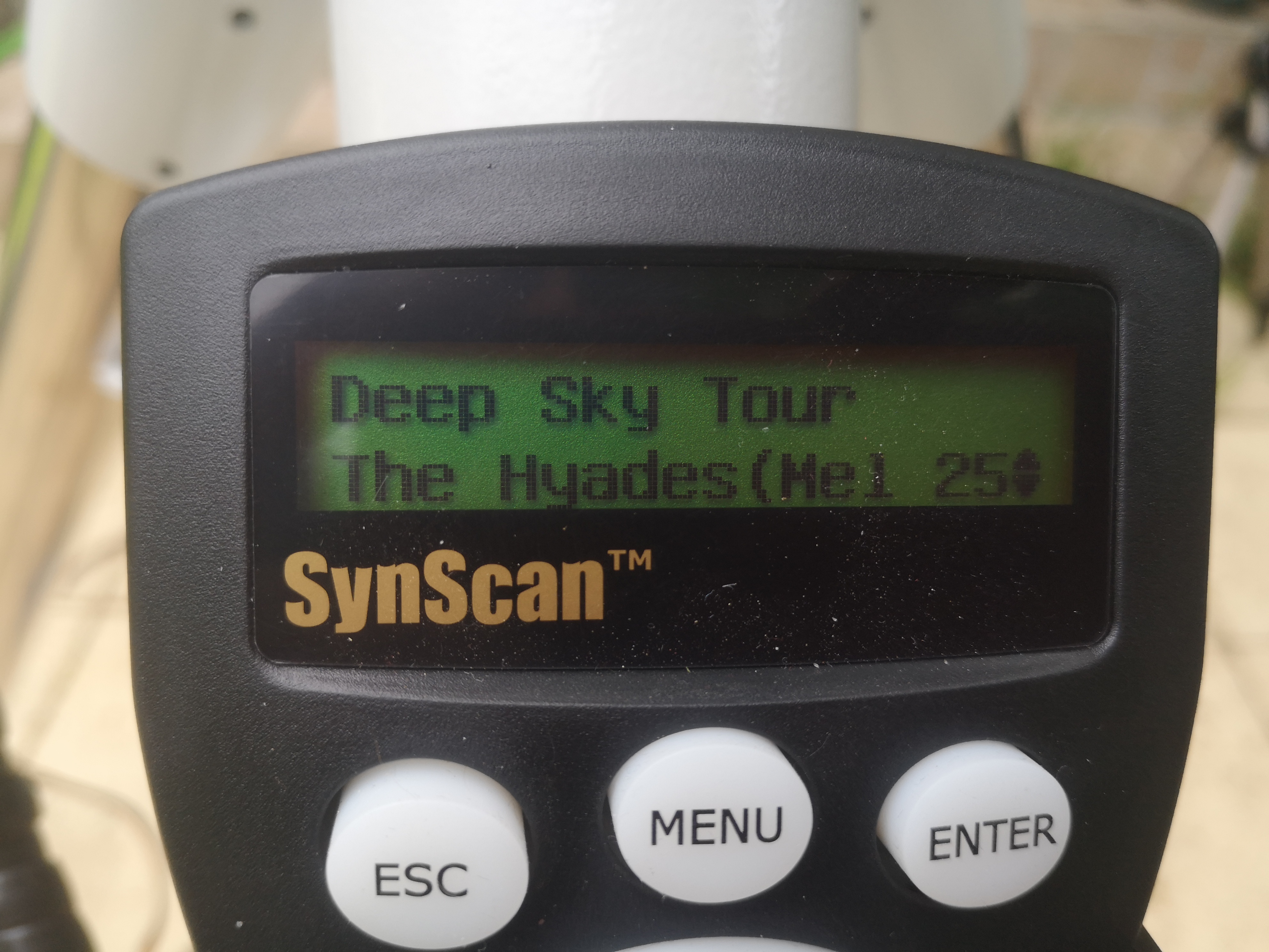 Drase, j'ai changé l'ordre de la date car le Goto était complètement dans les choux. En anglais en à le bon ordre, je sais pas si ça change quelque chose. Sinon, oui c'est bien cela pour dire OK pour s'aligner sur une étoile, il faut appuyer sur 1 et c'est juste après que ça part dans un autre menu.