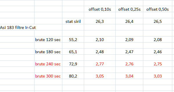 Hier j'ai fais des tests avec l'asi 183 pour mesurer le sigma en fonction des temps de poses , voici le récapitulatif .