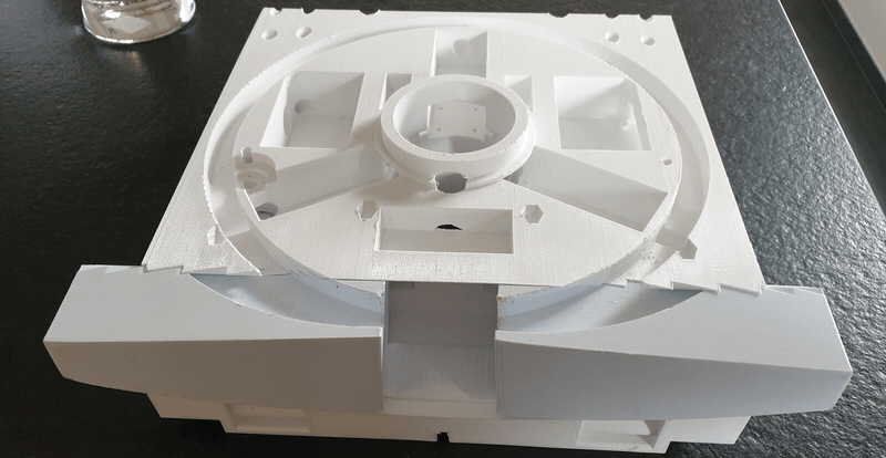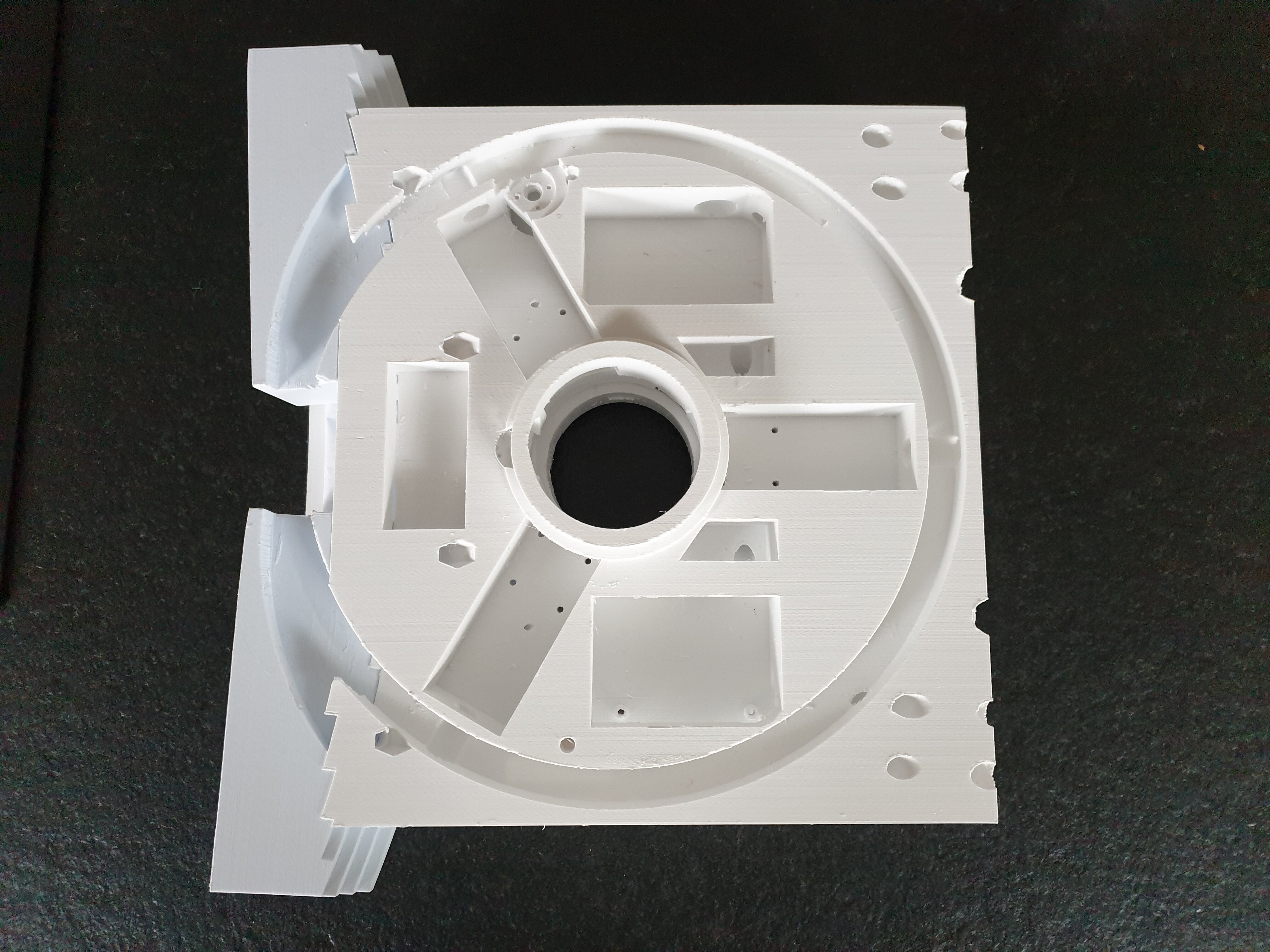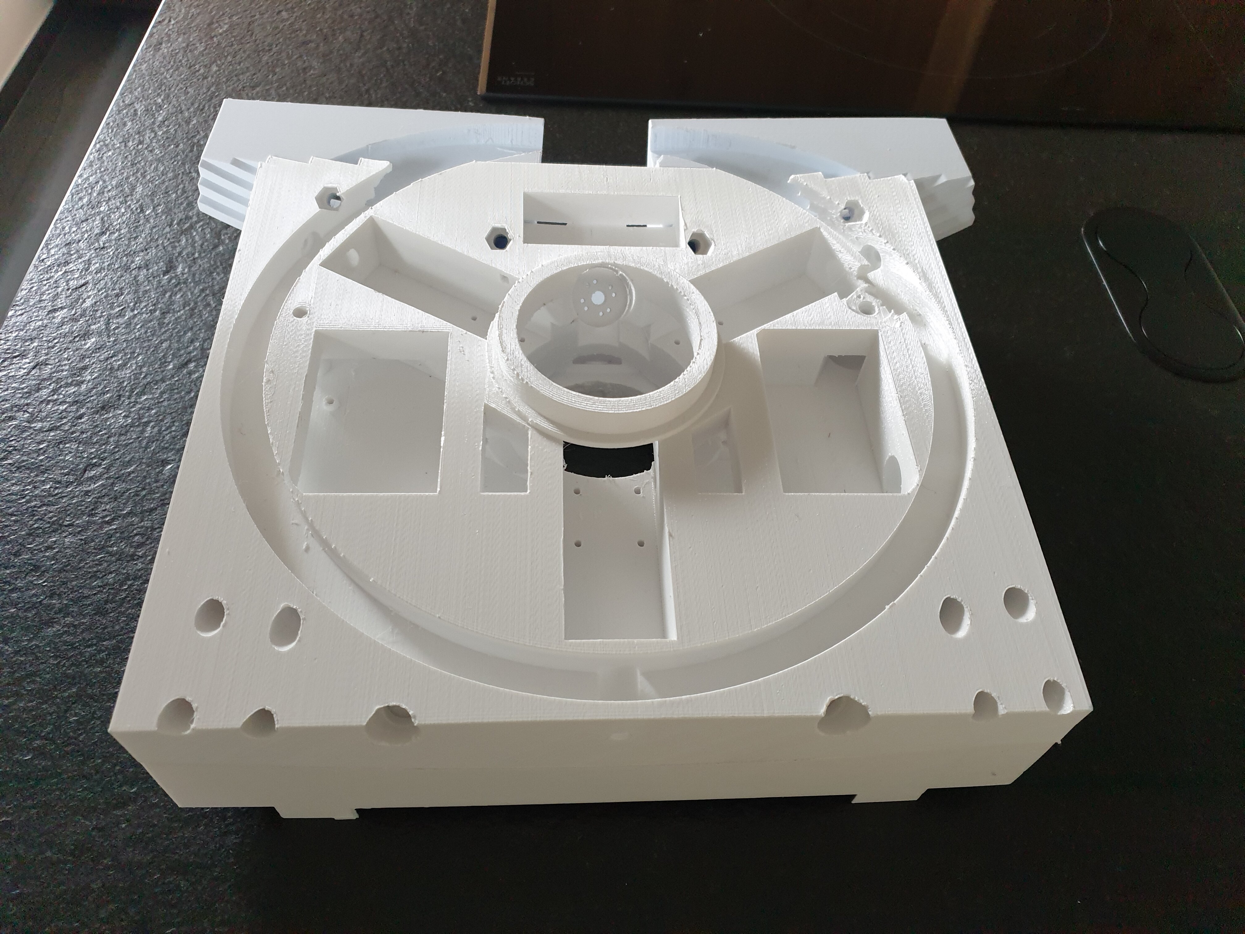 etmo Posté 14 mai 2021 Auteur Posté 14 mai 2021 Bonjour, La pièce la plus complexe et la plus difficile est terminé. Le corps principale de la table équatorial est particulièrement complexe à imprimer. Il faut de nombreux support à l'intérieur de la pièce (Structure ajoutée à l'impression servant imprimé au dessus d'un vide) . L'extraction de ces support n'est pas forcément simple, il faut penser à l'accès de ces derniers pour les arracher à la pièce. Il y a quelques déformations provoquées par la rétraction de la pièce mais c'est dernières ne devrait pas poser de problème pour le montage et le fonctionnement de la table. Ci-joint : Vue globale de la table avec le secteur équatorial rétractable. Cordialement Etienne 2