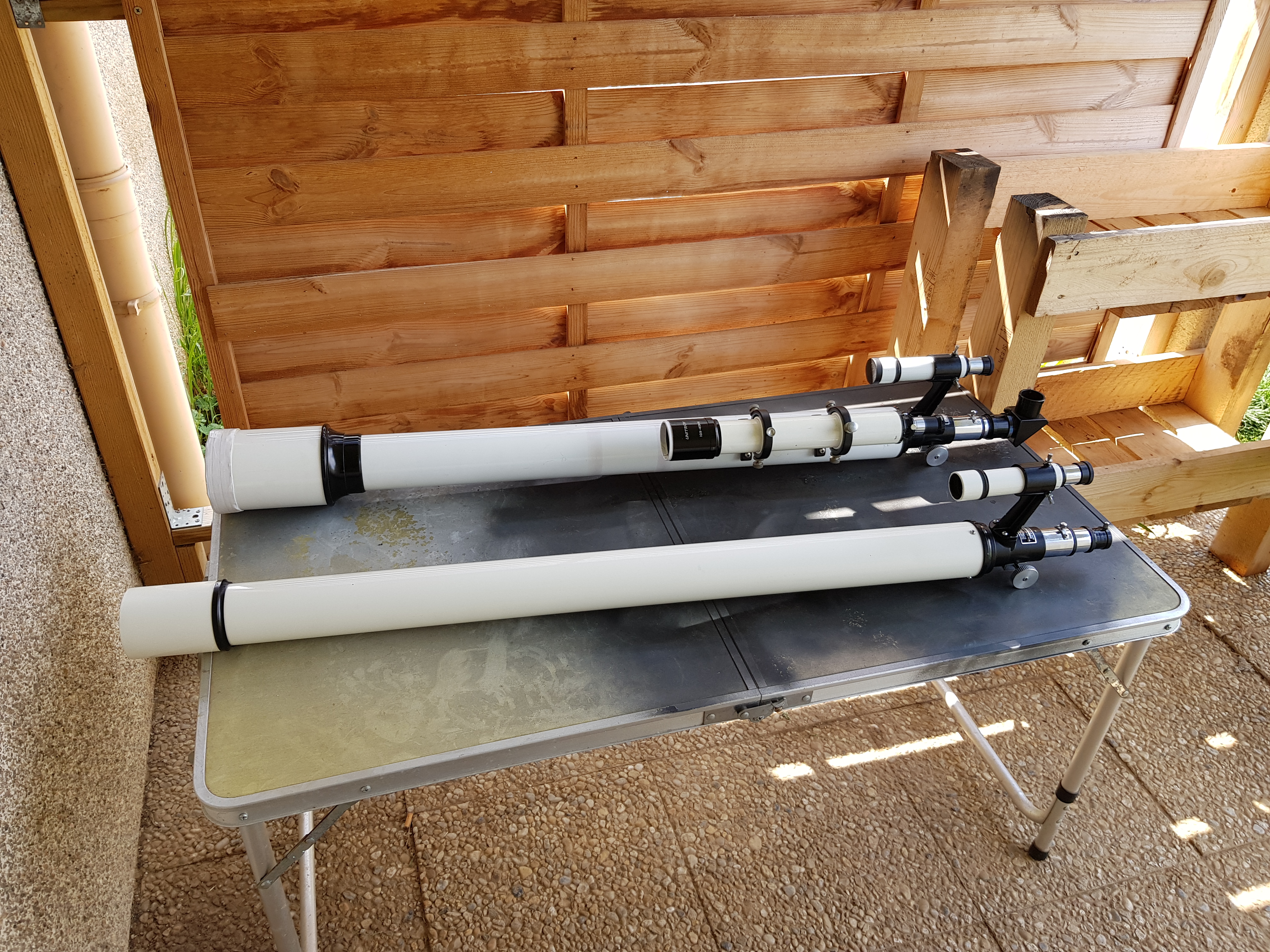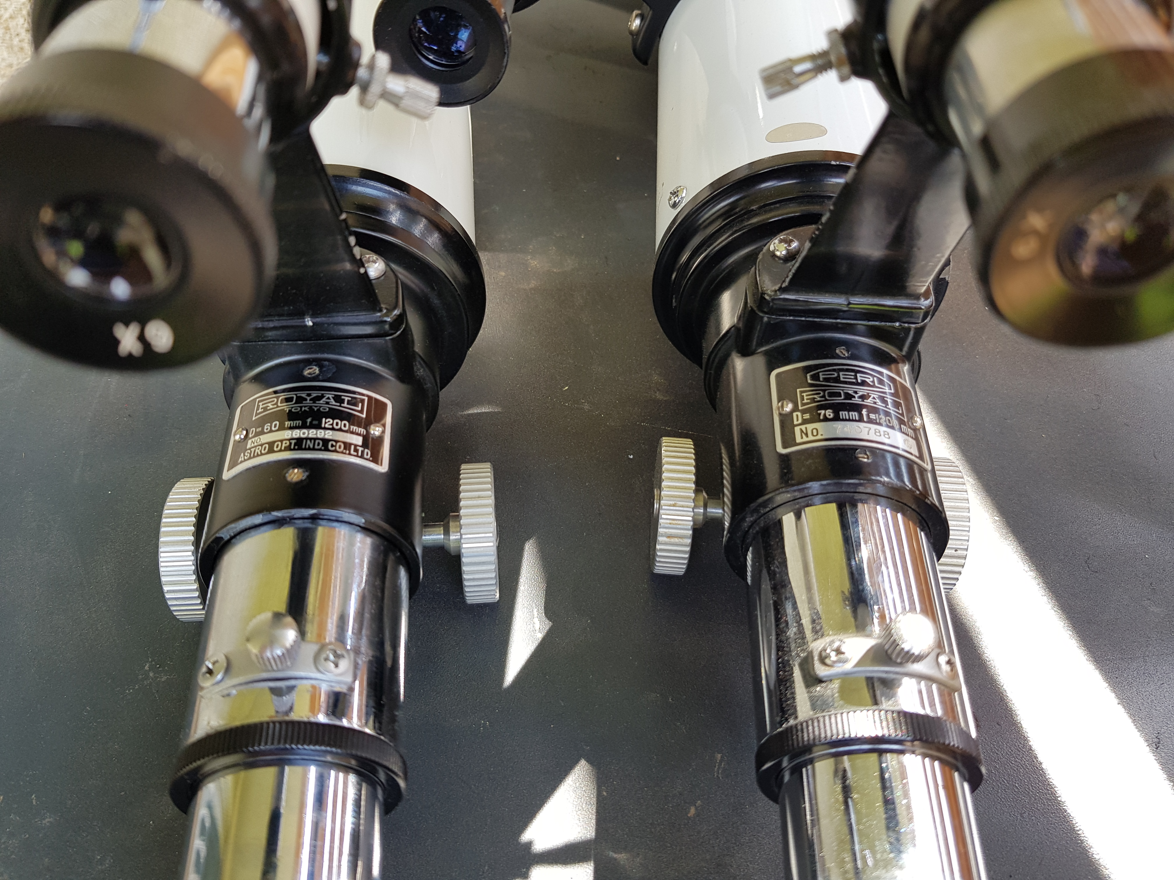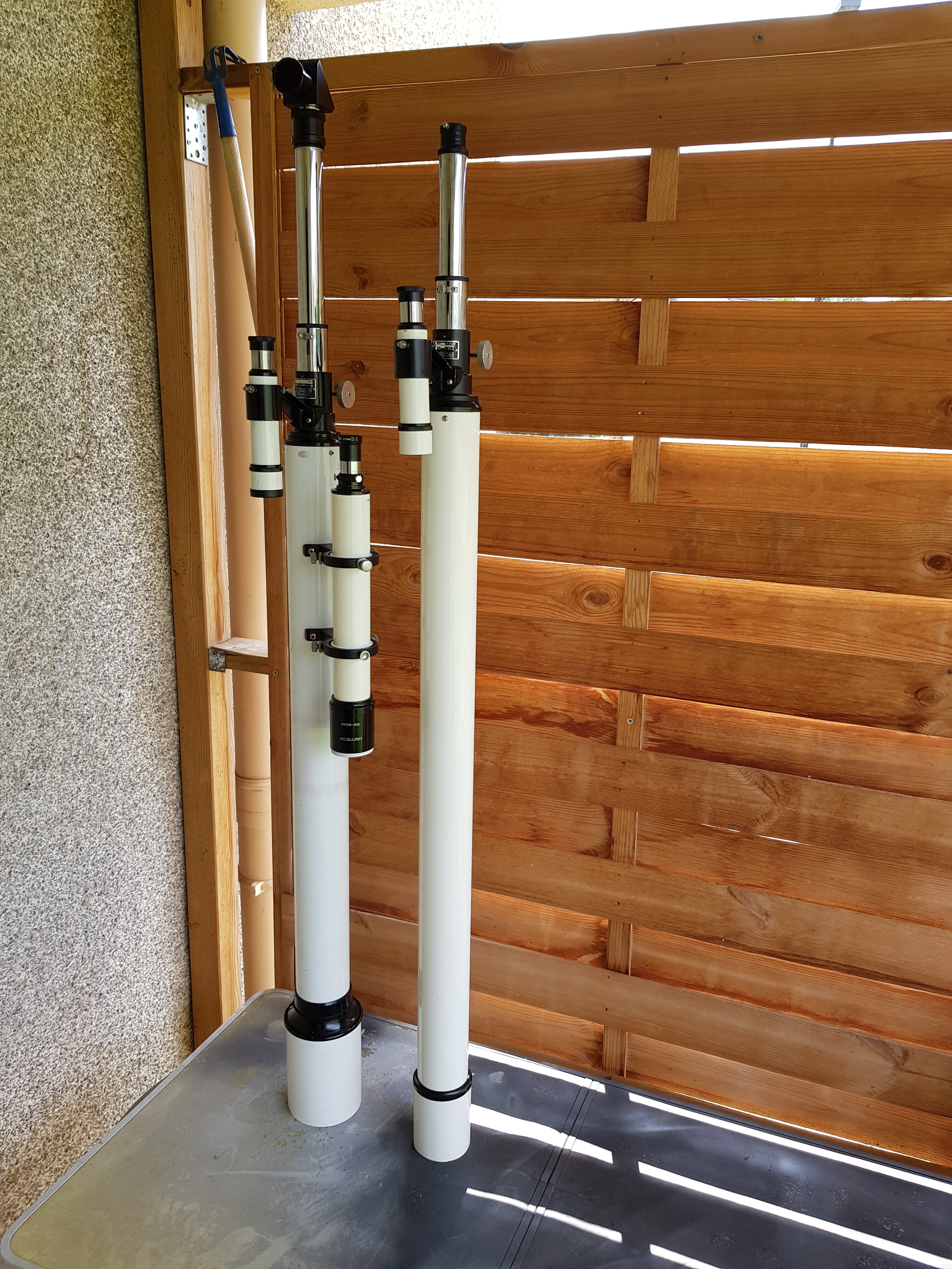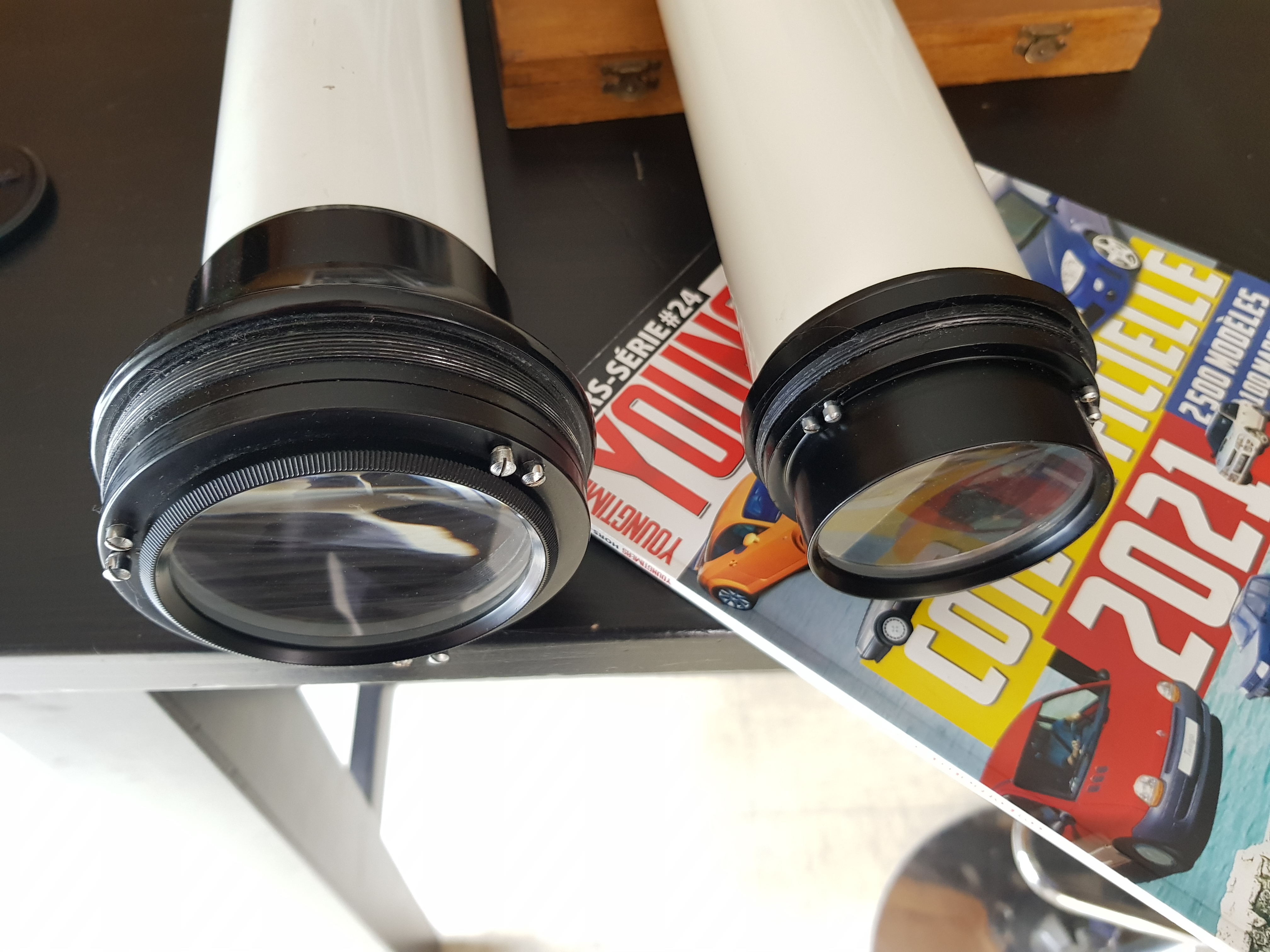 Jorris Posté 2 mai 2021 Posté 2 mai 2021 Salut le club La petite dernière arrivé a la maison. Une Royal astro 60 1200 que j'ai pu acquérir grâce à un membre du club, que je remercie encore une fois, pour avoir pensé à moi. Elle viens donc rejoindre son aîné a la baraque. Pas encore testé, il faut que je lui trouve des anneaux, car je n'ais pas la monture seulement le tube. Un fd20, j'ai encore jamais testé, les résultats devrait être chouette sur les planètes, et en précision sur la lune. Tube plus long que la 76, et donc tube allonge de la crémaillère plus court. La 60mm est mieux travaillée à l'intérieur que sa grande sœur, puisqu'il n'y a rien à retoucher. 2 bafles déjà présente, tube bien mat, et tube allonge peint en noir mat à l'intérieur. J'avais du repeindre tout sur la 76 rajouter 2 bafles, et camoufler le tube allonge. Cremaillere identique. Les deux optique, 76mm et 60mm de diamètre utile. Le traitement anti-reflet de l'optique de la 60mm commence à souffrir du temps, ça se voit sous certains reflet, il y a des petit trou dans le traitement sur toute l'optique, mais assez léger quand même. A voir sur le ciel 4
