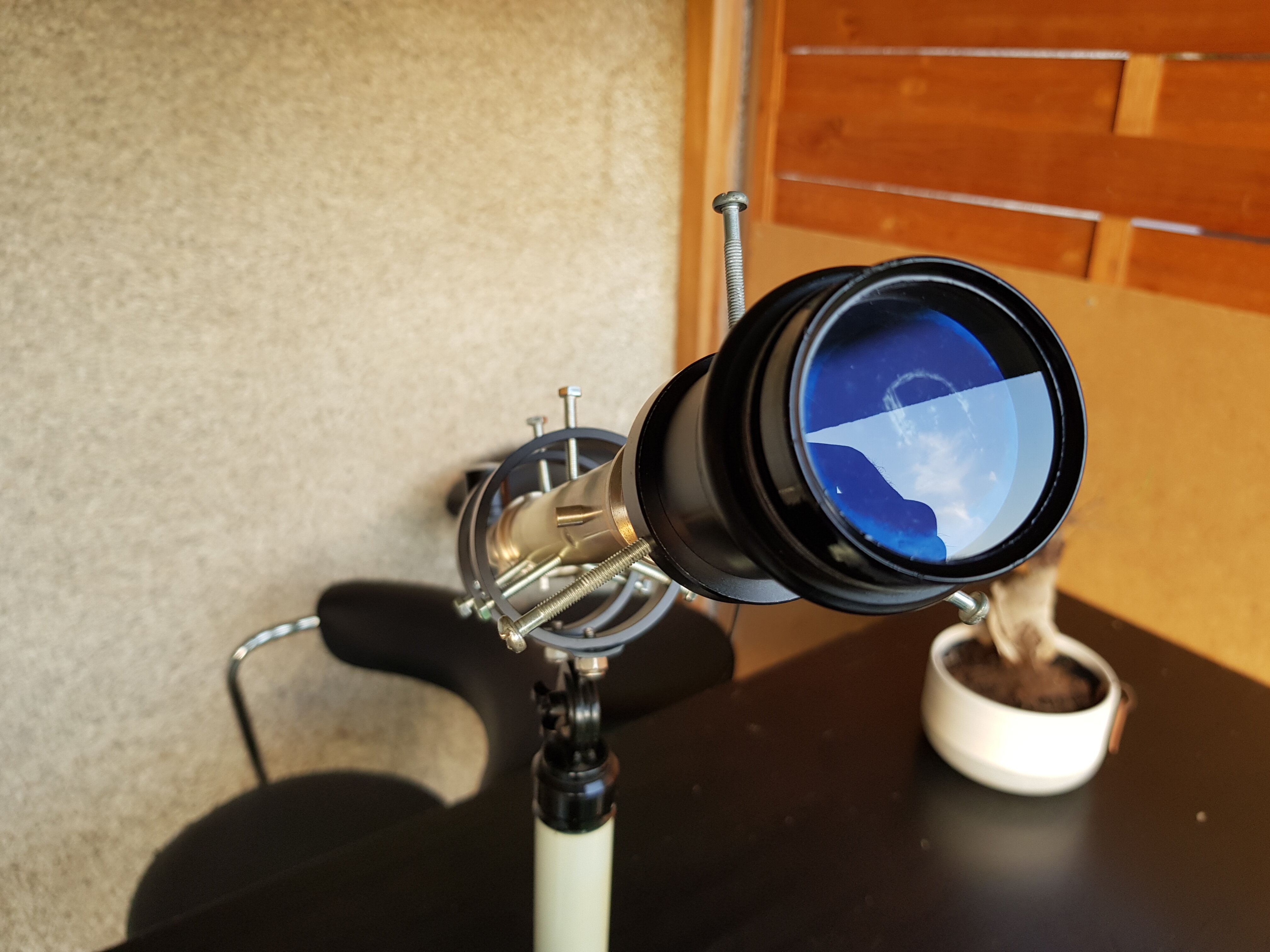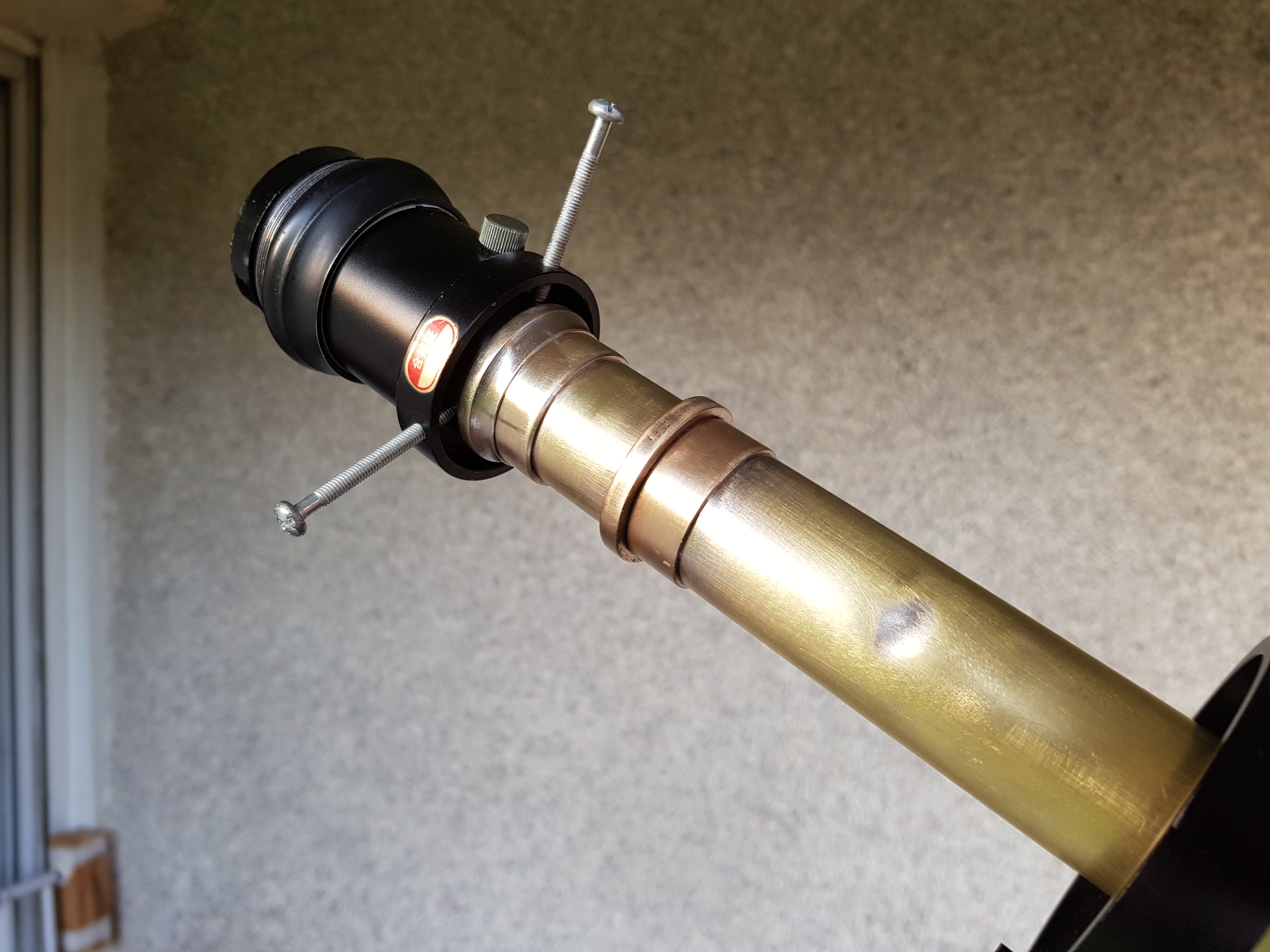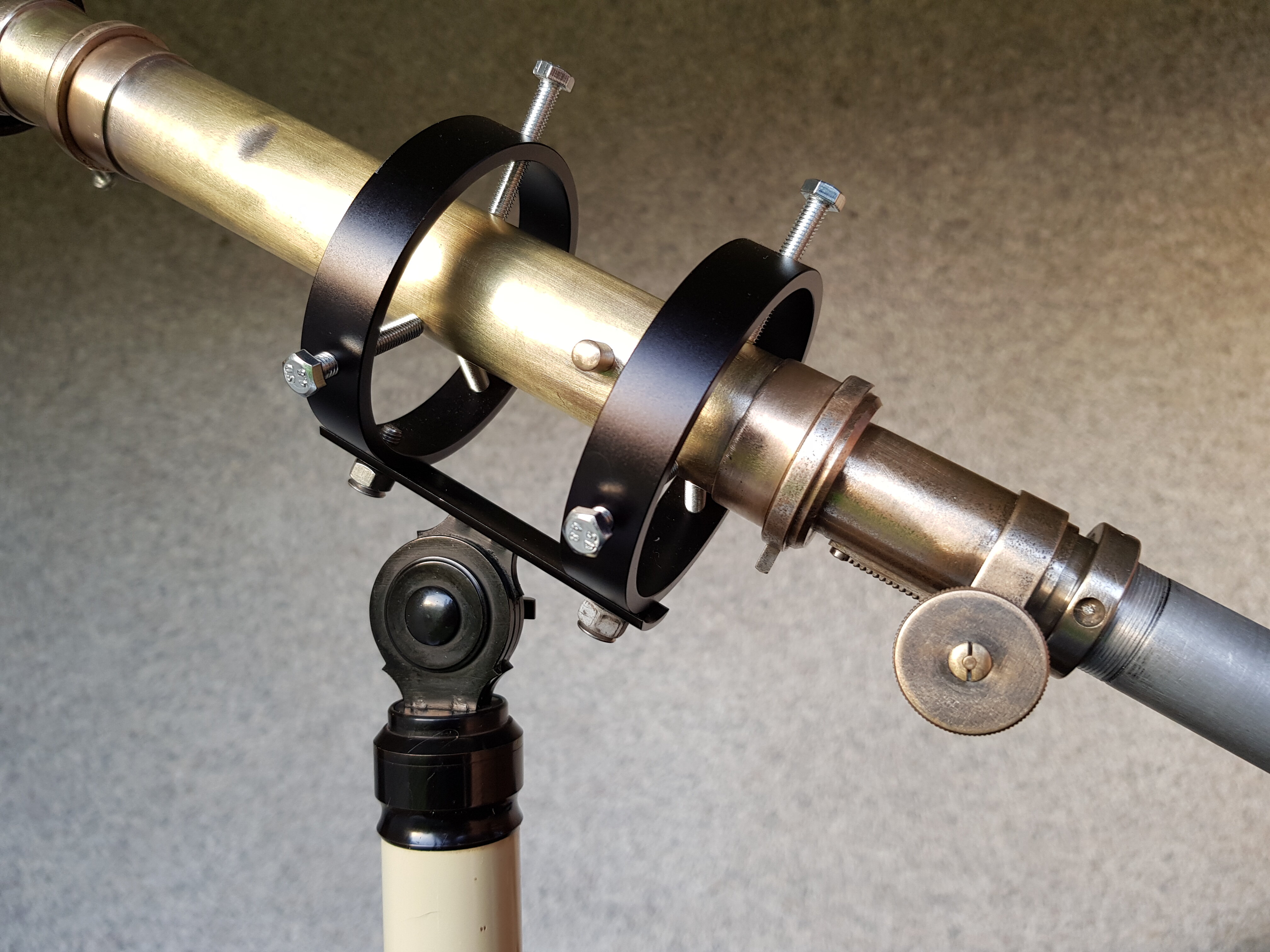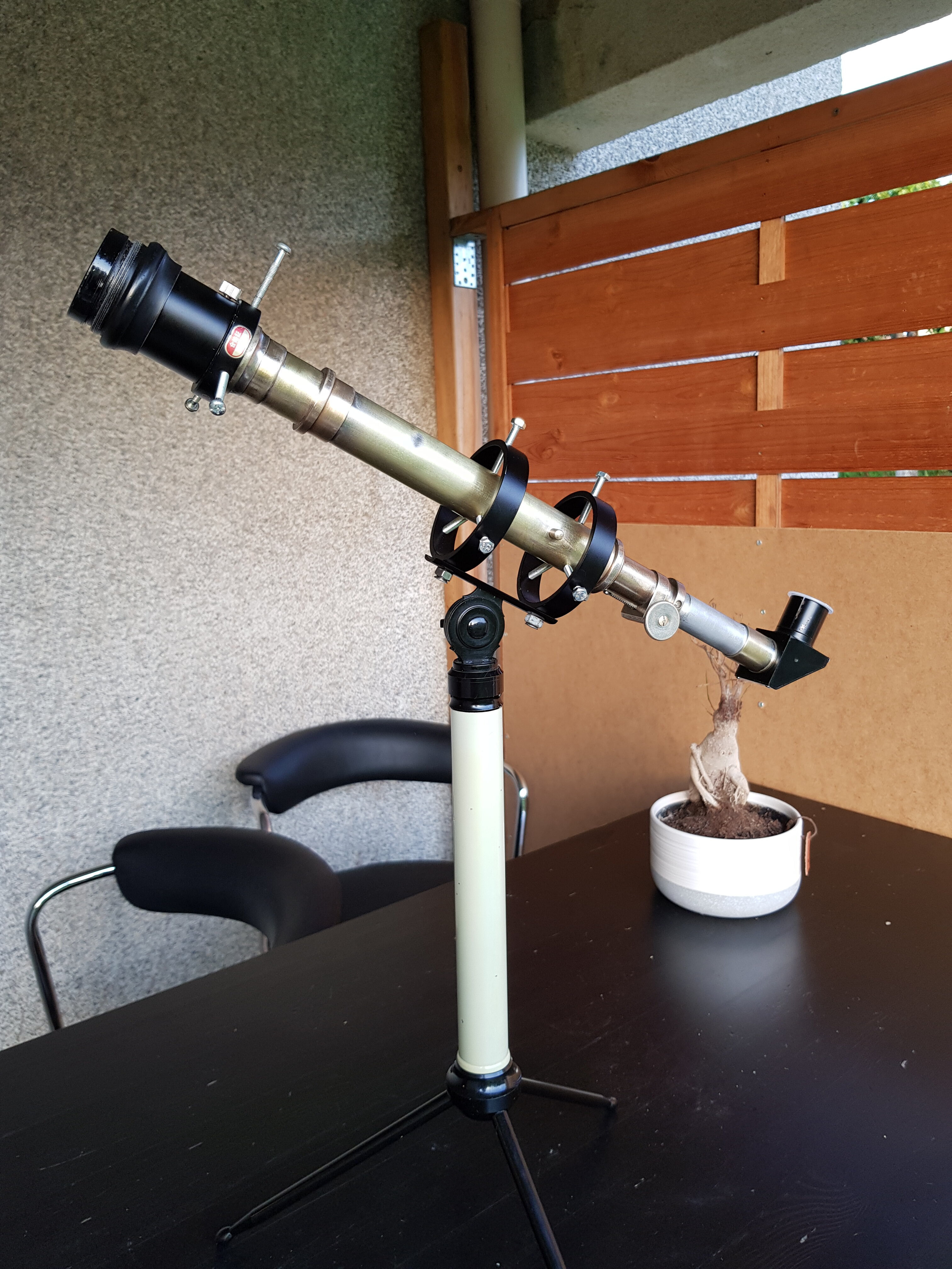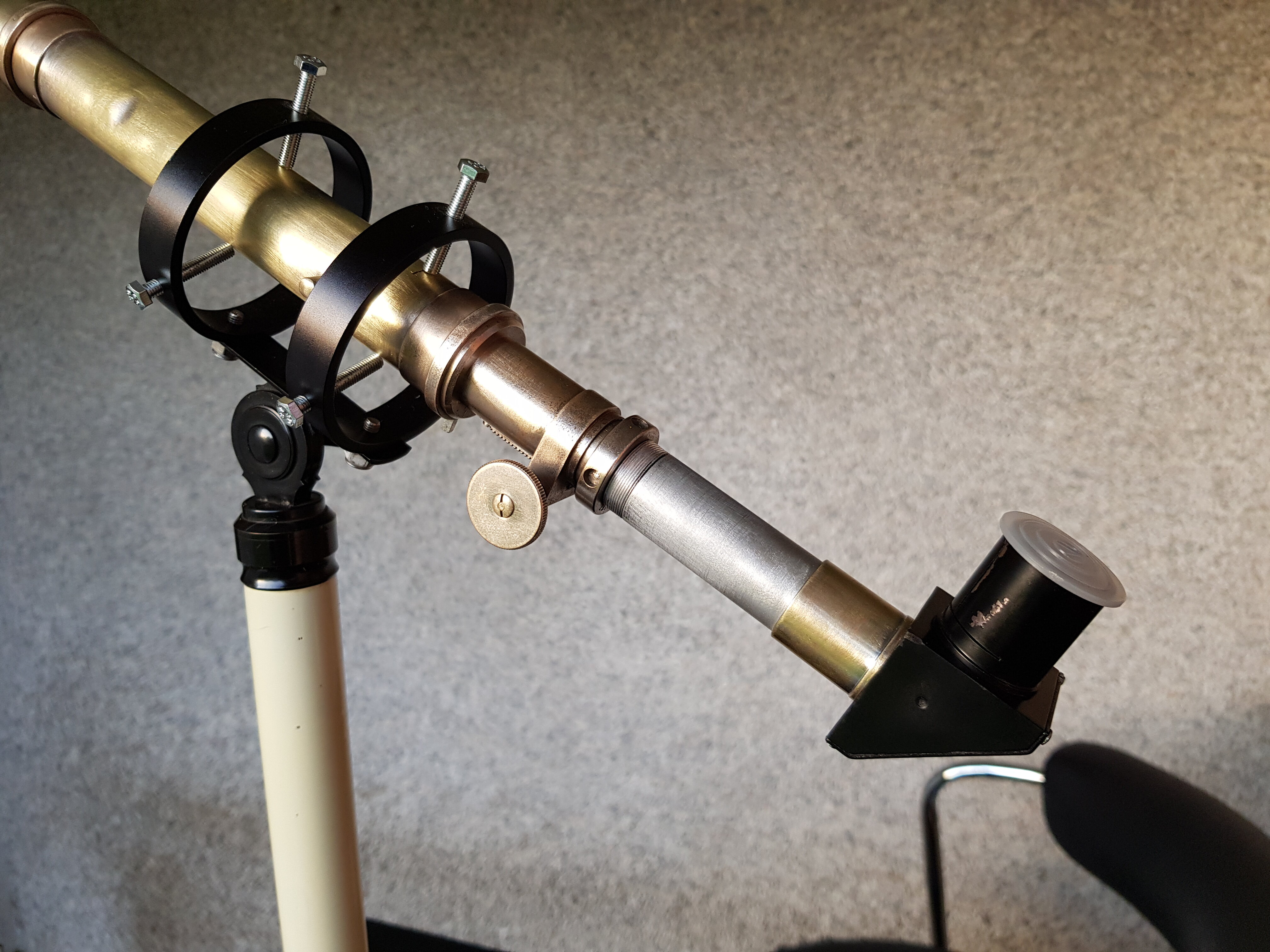 Jorris Posté 19 juillet 2021 Auteur Posté 19 juillet 2021 Fabrication artisanale d'une lunette guide pour la 60 1200. Je mettais d'abord procurer un second chercheur Unitron pour monter comme sur ma 76 1200. Met je le met de côté pour une prochaine occasion. Hier je trouve sur un vide grenier un tube sans optique de theodolite, et je me dis que comme lunette guide, ça doit claquer. Du coup en rentrant chez moi, le truc ct de fabriquer une petite lunette avec la bi.. et le couteau. J'avais une optique récupéré sur une vieille lunette galaxie 30x40 (à lentille de barlow intégré) japonaise. Je lais monté sur le tube de theodolite à l'aide d'adaptateur qui traînait dans le bric à brac, des truc qu'on met de côté et qui servent un jour ou l'autre. Quelques aller retours sur la lune on fallu pour trouver la bonne longueur pour avoir la map. De l'autre côté j'ai inséré un tube récupéré je sais pas ou. Résultat avant noircissement du tube hier soir sur la lune, une bonne image jusqu'à 9mm, manquant légèrement de piqué à 9mm quand même. Étoile bien ponctuel. Faudra vérifier la focal et le rapport fd qui doit tourner vers 10 je pense. Pas dabberation optique. Aujourd'hui j'ai gratter le tube (faudra fignoler) pour avoir la couleur laiton. Puis noircissement du tube sur les partie interieur découverte, le theodolite est déjà bafflé. Tout les oculaire de 25 à 5 mm passe en 24.5. Plus qu'à vérifier ce soir l'amélioration de l'image ce soir avec le noircissement. Et voilà pour moins de 10 euros une lunette guide entièrement vintage, qui a quand même de la gueule je trouve. Je lais monté sur cette petite monture Vion tres pratique uniquement pour les test, la lunette sera installé sur la 60 1200 Je remettrais des visses en laiton la haut et un peu plus courtes. 1