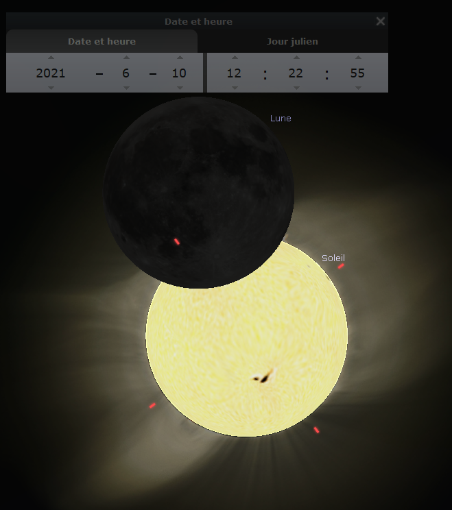 C'est étonnant : sur mon PC, sous Stellarium, pour cet horodatage et Paris comme emplacement, la Lune ne touche pas le Soleil. :hmm: