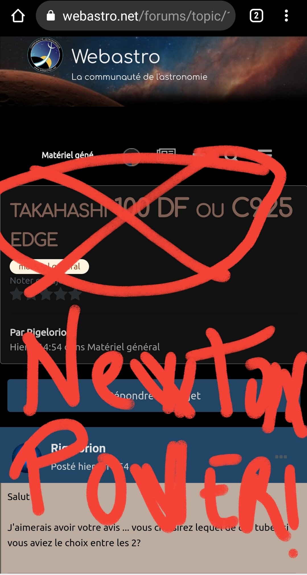 Vous pouvez répondre maintenant et vous inscrire plus tard. Si vous avez un compte, connectez-vous pour poster avec votre compte.
