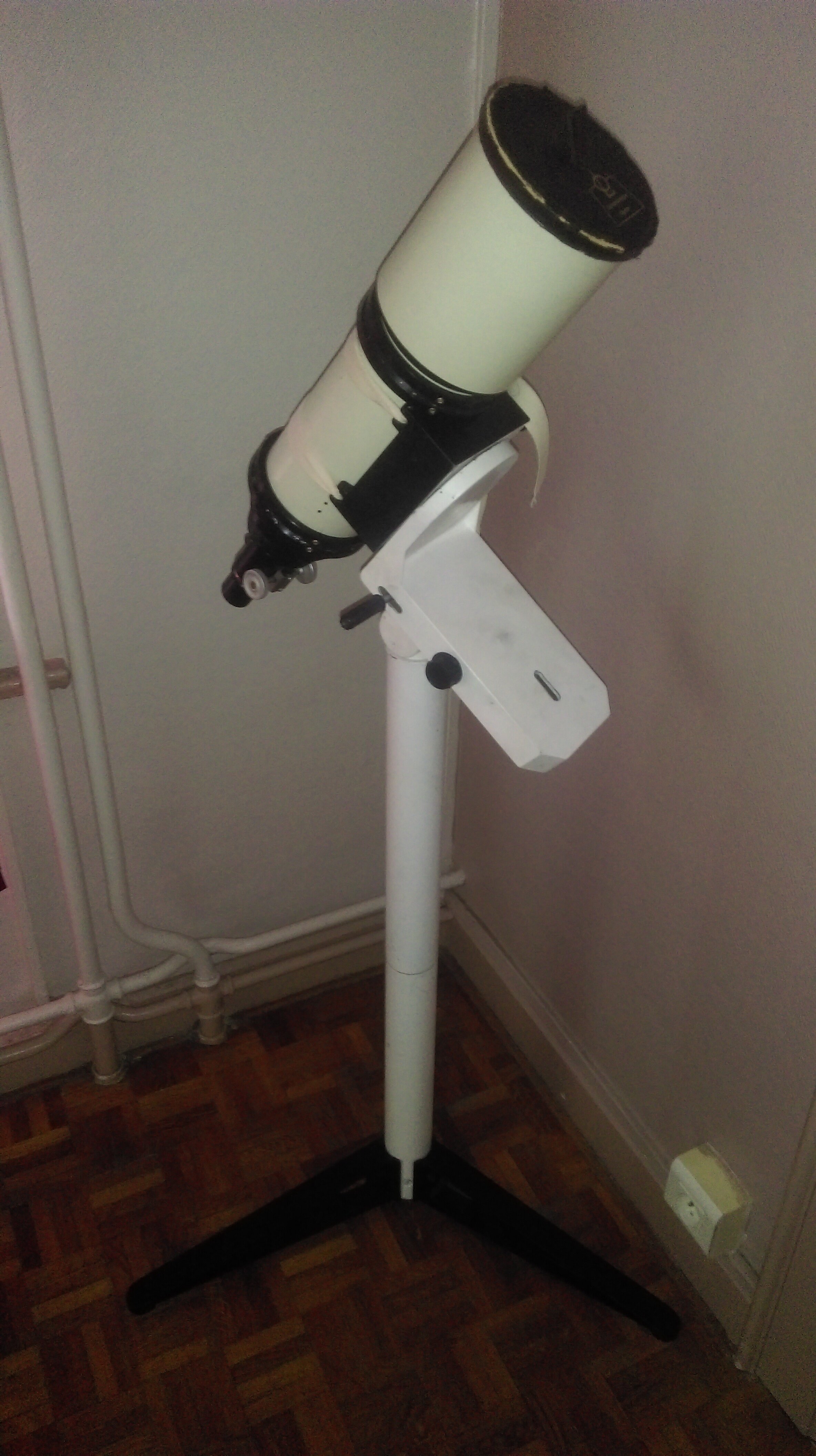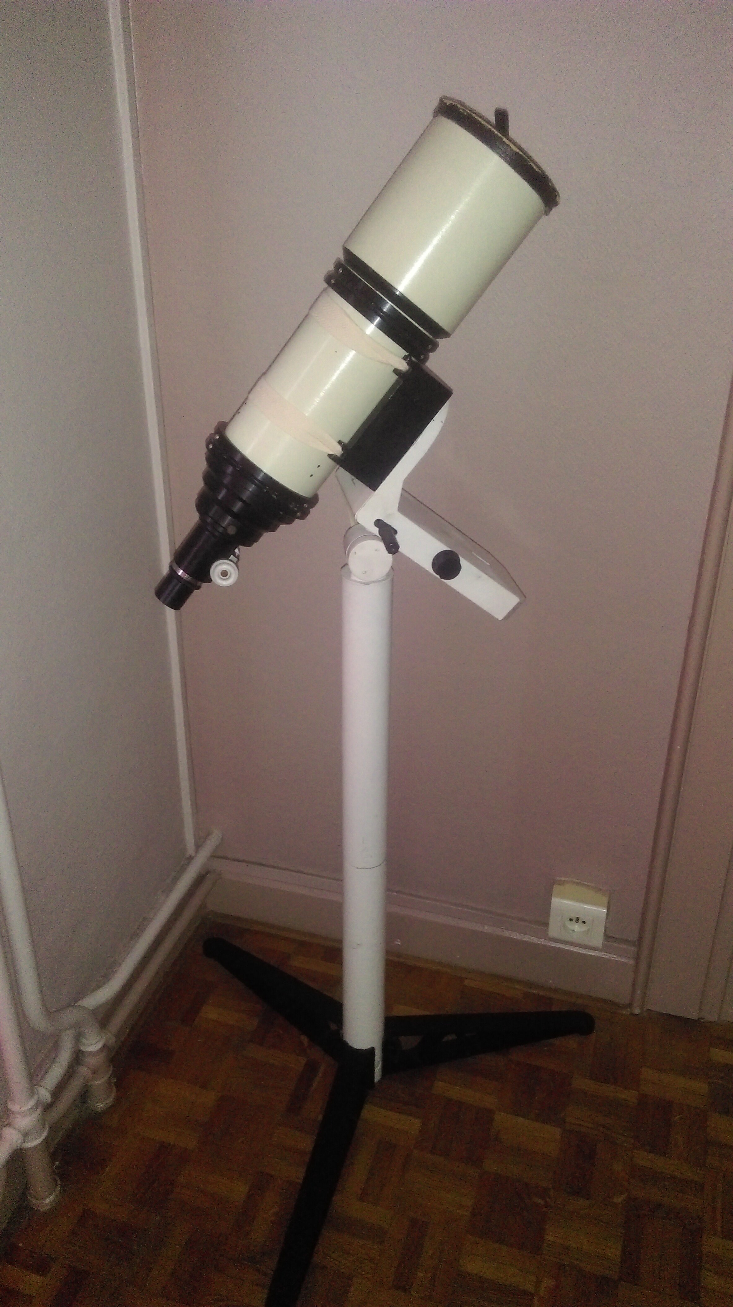 Vador59 Posté 10 août 2021 Auteur Posté 10 août 2021 (modifié) Aujourd'hui après-midi, test de la lulu sur le Soleil avec un filtre pleine ouverture Thousand Oaks (oui, je sais, à la limite autant ne rien mettre plutôt que cette bouse, mais bon...). Les conditions sont déplorables (c'est le Nooooooooord), avec des passages nuageux très fréquents et une turbulence absolument écoeurante. La monture TAL-M: J'aime le matériel russe... Heureux possesseur du Tal 1 110/800, j'ai récemment fait l'acquisition de son petit frère qui est sensé supporter un Newton de 80mm. Malheureusement, la monture était intégralement démontée et, évidemment, il n'y a avait pas la notice pour le remontage. Heureusement, G***le est ton ami, et après deux-trois recherches, je tombe sur plusieurs photos montrant le mécanisme interne. En l'espace d'une matinée, la bestiole est remontée. Il est difficile de se faire une véritable idée de la valeur de la monture TAL-M au regard de cette sortie diurne. La mise en station a été réalisée "au jugé". Néanmoins, en dépit d'un poids très léger, l'ensemble est bien stable. La monture n'a même pas pleuré de ne pas disposer d'un contrepoids (mais j'ai prévu d'y remédier). Une chose, en revanche, est certaine: il faut bien serrer. En dehors de ce détail, il me semble que le suivi fait le taf. Une vibration met moins d'une seconde à être absorbée. Pour l'anecdote, je possède également la monture du TAL-2 (qui supporte normalement un Newton 150). Oui, je sais, j'aime le matériel russe... mais c'est sans concession sur les performances, alors pourquoi s'en priver ? J'encourage tous ceux qui dénicheraient ce genre de matos de se ruer dessus, ça vaut le coup. La AK-47 AK-90: La kalachnikov lunette belge, elle aussi, est légère mais diablement bien pensée. Pour un tube de ce diamètre et aussi court, les concepteurs ont logé pas moins de huit baffles dans le tube. De quoi garantir du contraste en observation diurne. La preuve en est. Ne disposant pas de chercheur, j'aligne le soleil "à la louche", en jouant sur l'ombre du télescope au sol. Ce n'est pas la précision du siècle: même avec son oculaire Or de 40mm (13,5x), je ne suis pas sur le Soleil. Un léger coup de molette, et l'astre apparait brutalement dans le champ, sans crier gare. Tout le contraire d'une Zeiss APQ 100/1000 où l'absence de bafflage interne fait qu'un simple quartier de Lune se signale longtemps à l'avance à l'oculaire... L'objectif est entièrement collimatable. Deutsche Belgische Qualität... Nonobstant la turbulence infâme, l'image est très correcte à l'oculaire, y compris en passant à l'Or10. Les spécialistes me contrediront peut-être mais je n'ai pas eu l'impression qu'il y avait grand chose à observer en lumière blanche (mais la turbulence et la médiocrité du filtre peuvent aussi expliquer que j'ai fait chou blanc). Pour ce qui est de l'aberration chromatique, c'était pas flagrant de voir quelque chose... L'inconvénient de Lichtenknecker, c'est que le matériel est en 31mm. Mais comme j'ai été livré avec de nombreux accessoires et que je disposais déjà de quelques raccords supplémentaires, j'ai pu insérer, entre le renvoi coudé et l'oculaire, simplement en le glissant, mon filtre Fringe Killer. Verdict: le limbe solaire semble un chouia plus propre. La séance a été écourtée par le retour de nuages plus épais et plus nombreux. A suivre donc, par une séance nocturne, sur la Lune et les géantes. Il parait que la fin de la semaine s'annonce belle... Une certitude: un set-up léger mais solide. Voilà qui me change de ma Zeiss C-63 au moins trois fois plus lourde. Modifié 10 août 2021 par Vador59