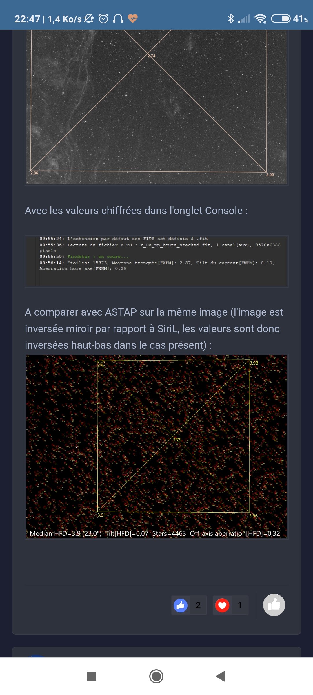 Je pense qu'il y a plusieurs facteurs qui entrent en compte. D'abord, avec l'Hyperstar, je shoote à f/2.3 contre f/4.5 pour toi, ce qui est 3.8 fois plus rapide ( = 1/(2.3/4.5)²). Pour simplifier en 1h de pose je récupère autant de signal que toi en 4h. Ensuite il y a effectivement le filtre duo-band qui aide bien, et au final, il y a le traitement. L'hyperstar c'est super, ça permet d'accumuler un max de signal, par contre c'est très exigent et peu tolérant des erreurs. C'est pour ça qu'il m'a fallu du temps pour traiter cette image (plusieurs jours) jusqu'à trouver la meilleure façon de virer un méchant gradient. Je vous laisse la raw issue d'intégration ici pour vous faire une idée (attention plus de 500Mo!): https://www.dropbox.com/s/me4e7u6awoy8472/Veil_Nebula.fits.zip?dl=0